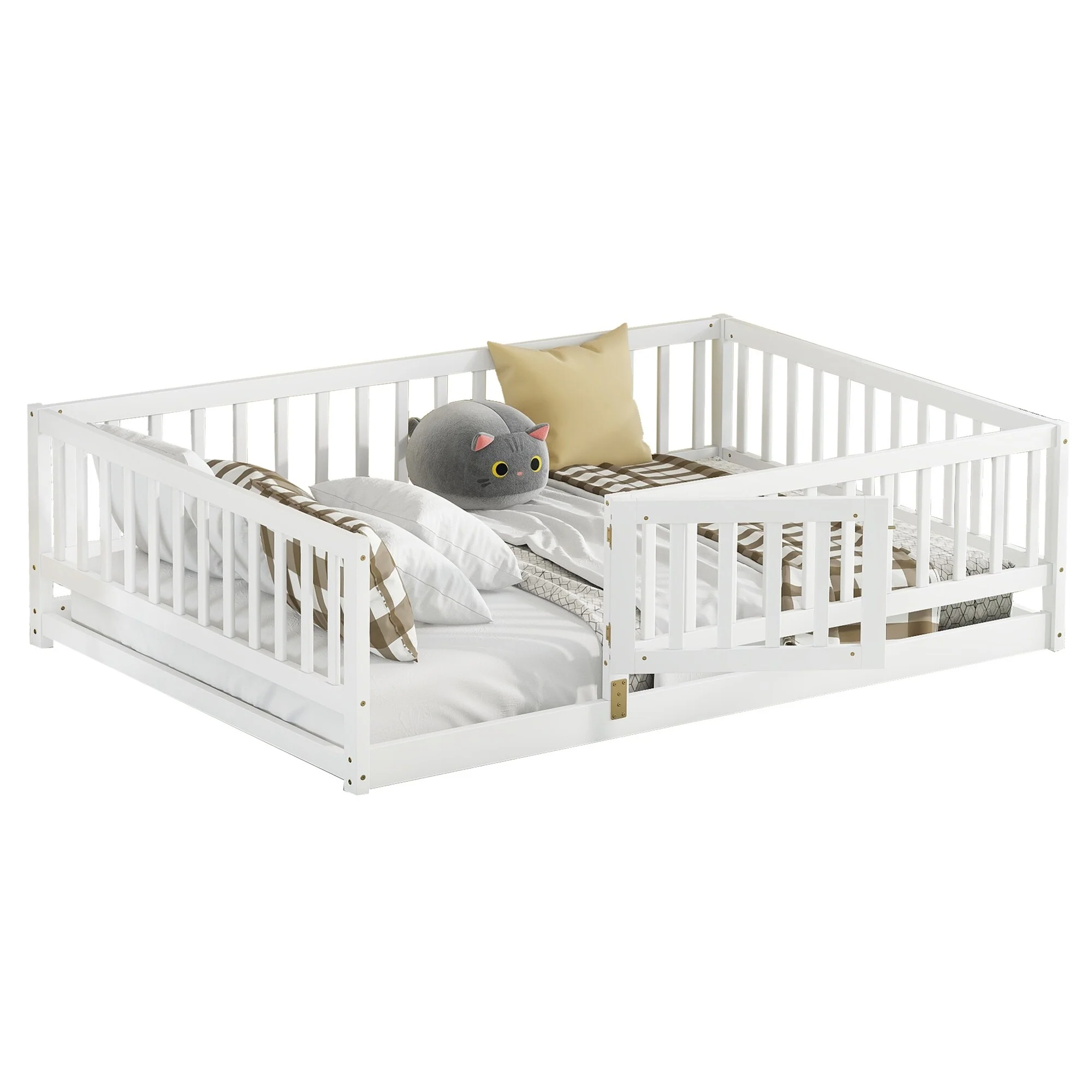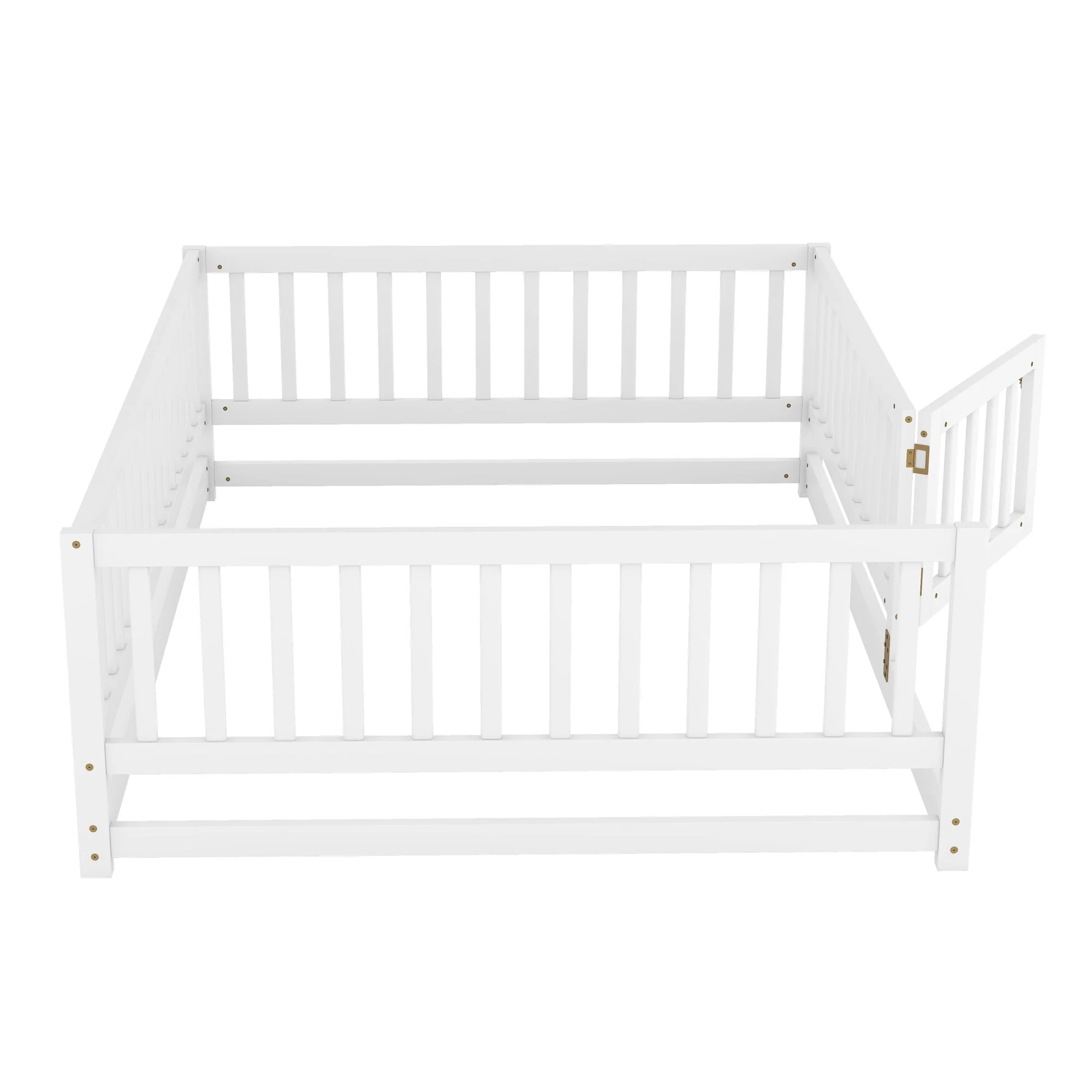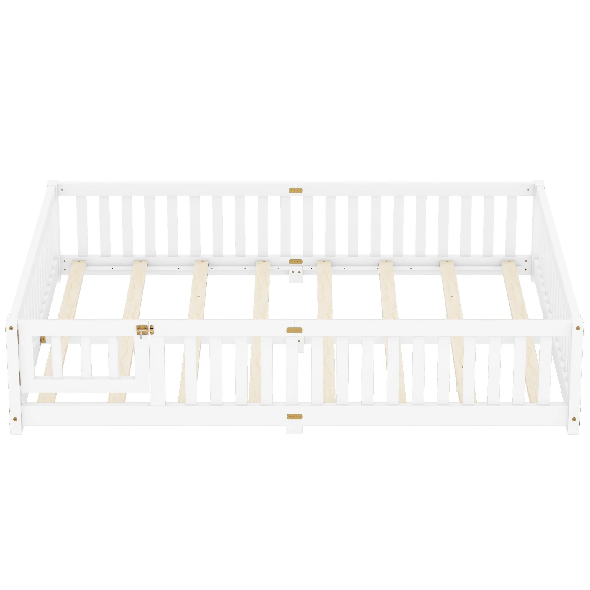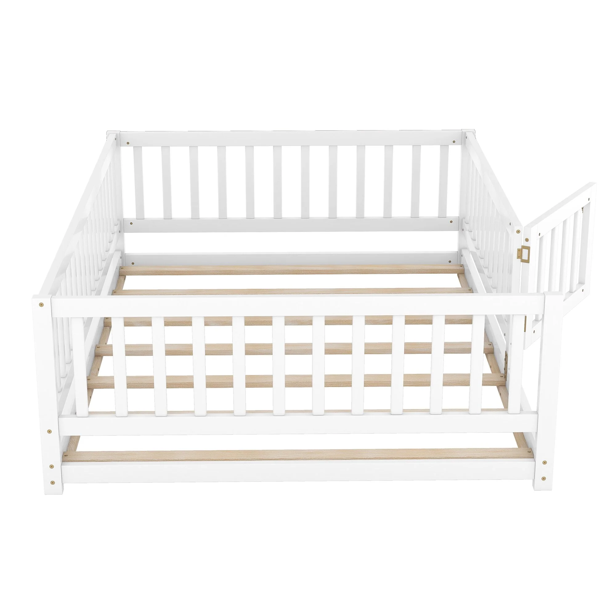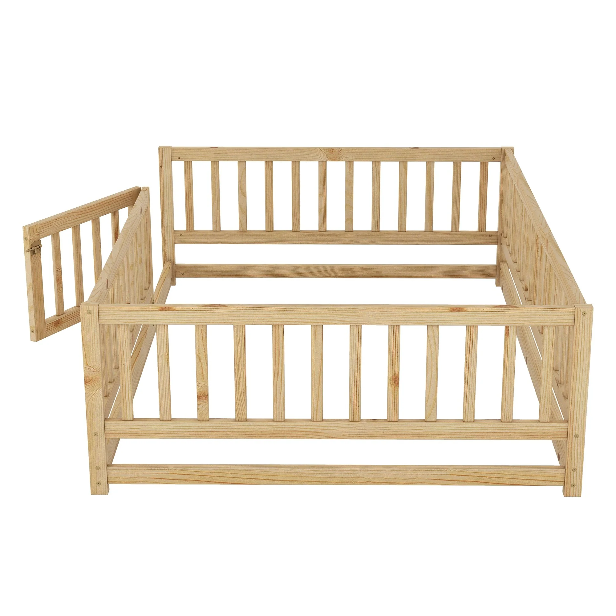 Queen Size Floor Bed Frame for Kids Bed with Fence Guardrails and Removable Door, Slats Playroom Montessori Platform Bed
