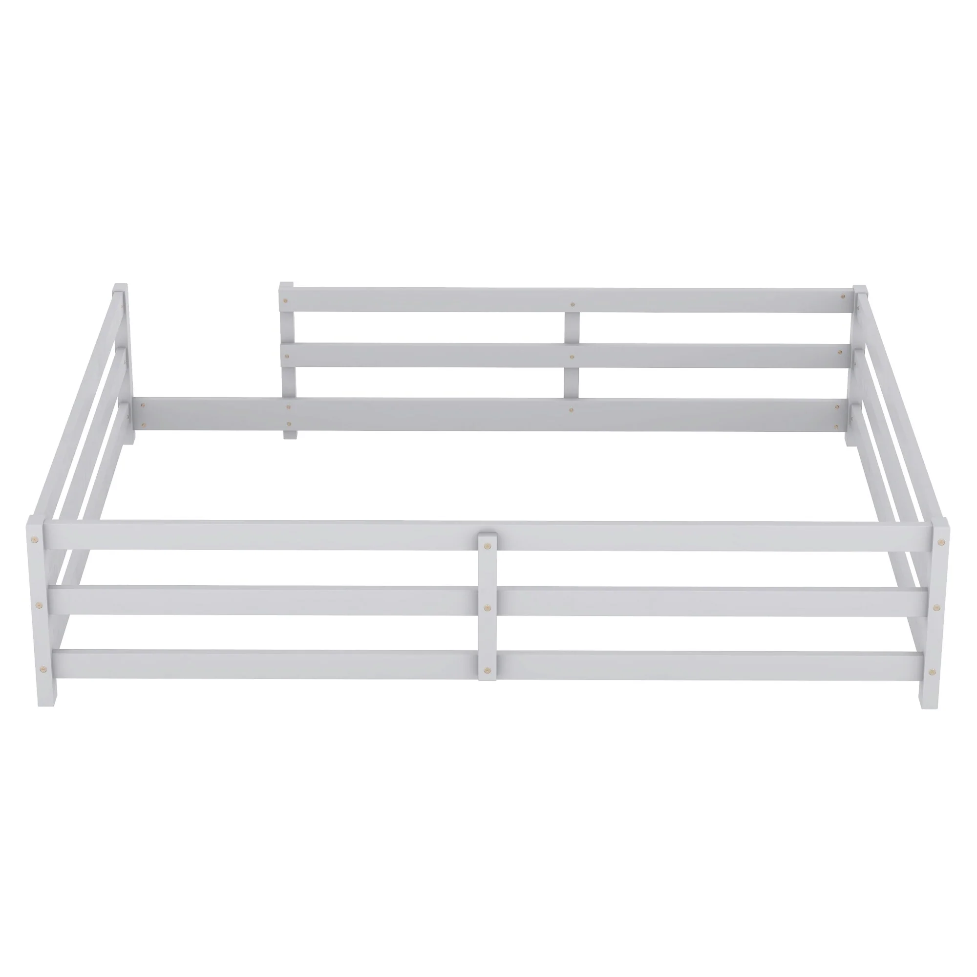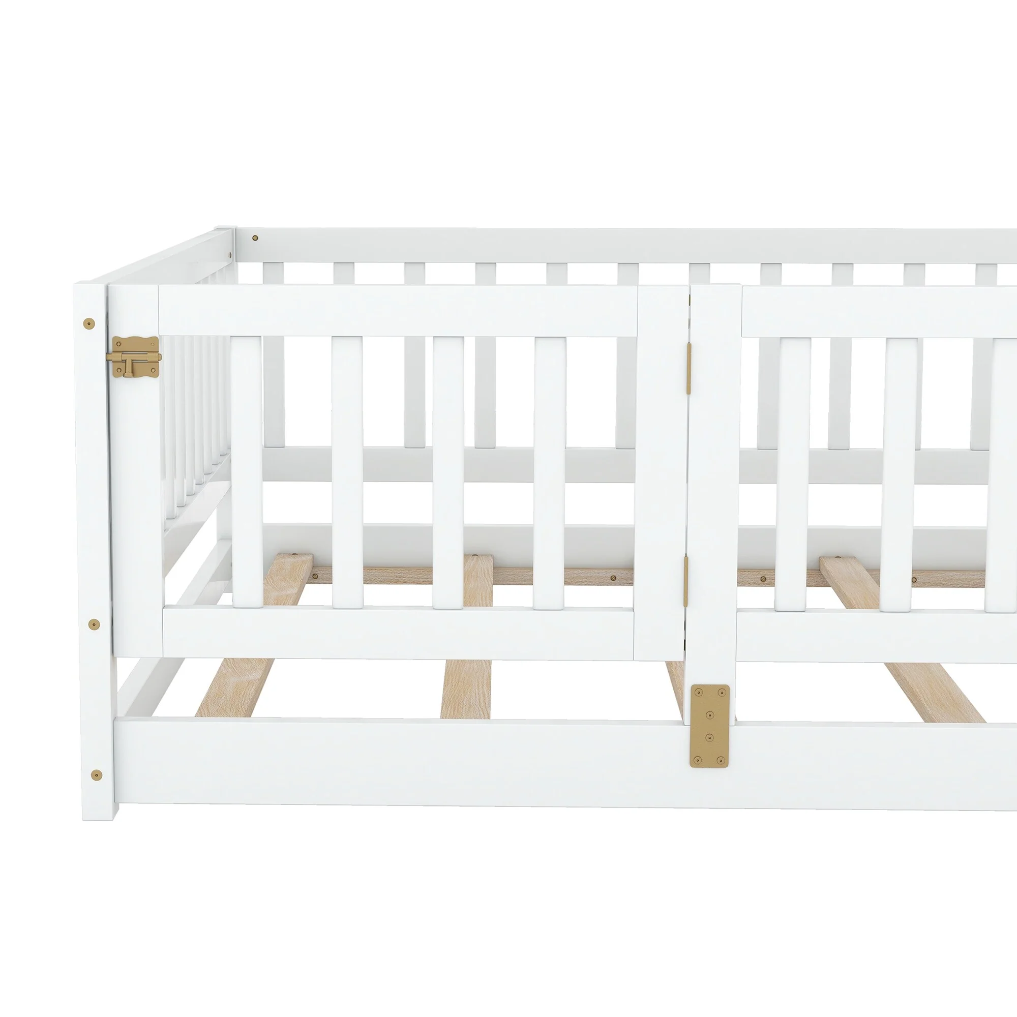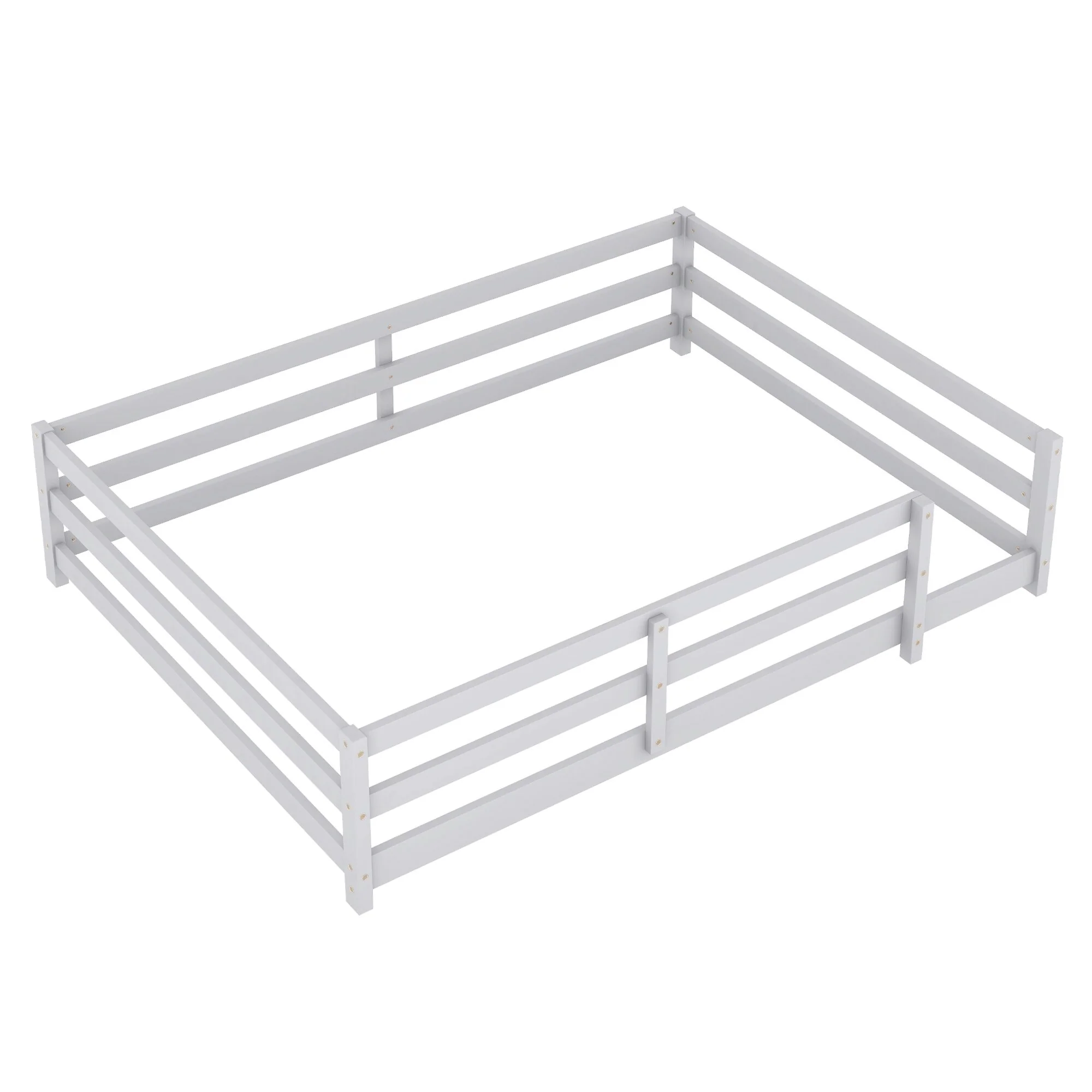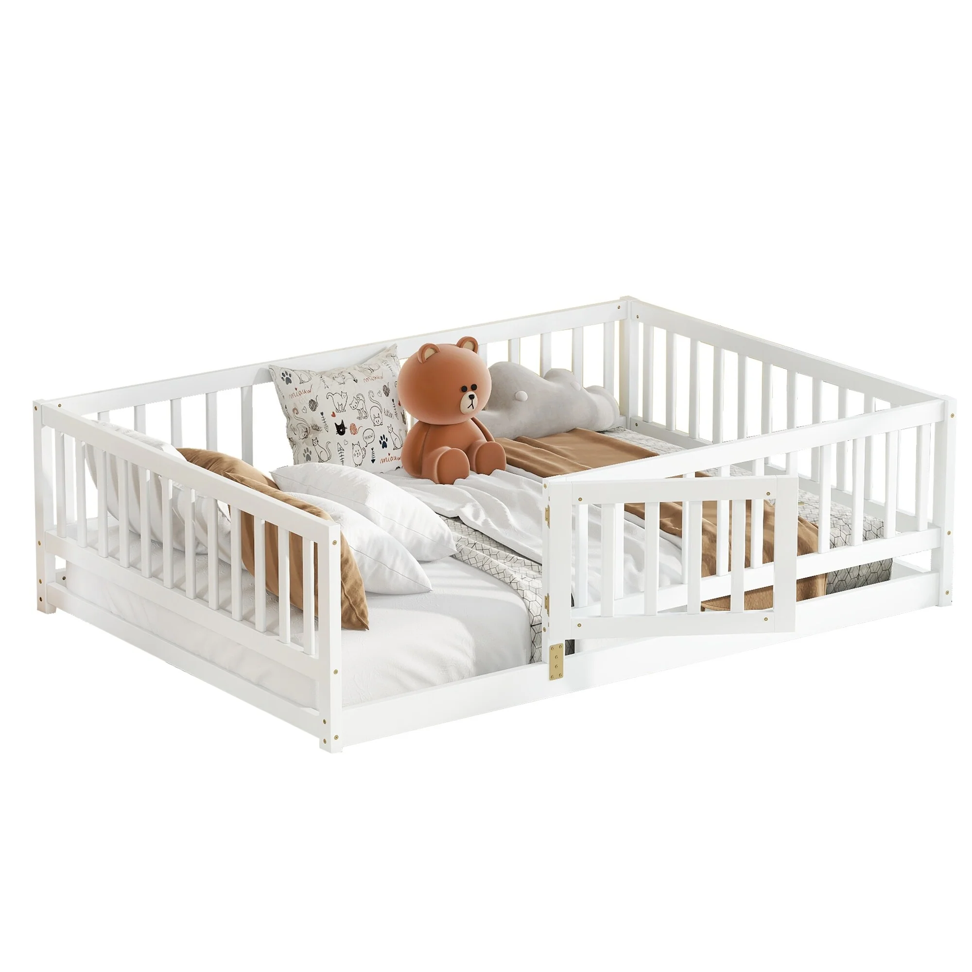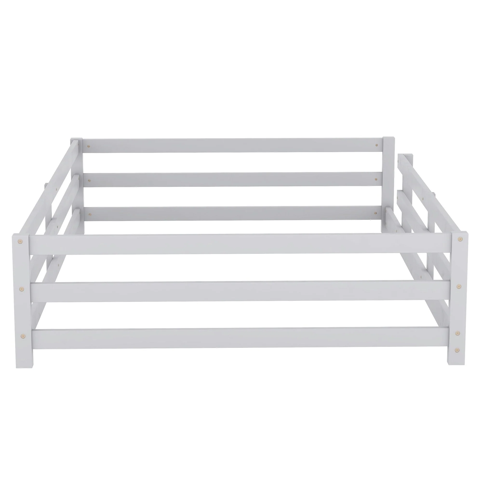Queen Size Floor Bed Frame for Kids Bed with Fence Guardrails and Removable Door, Slats Playroom Montessori Platform Bed