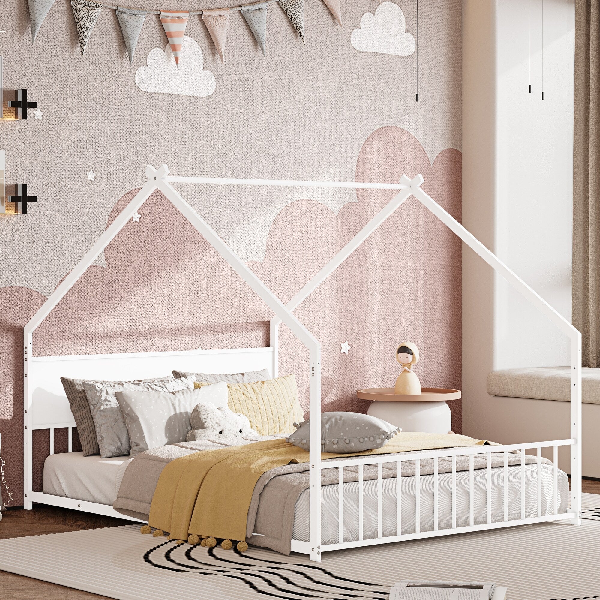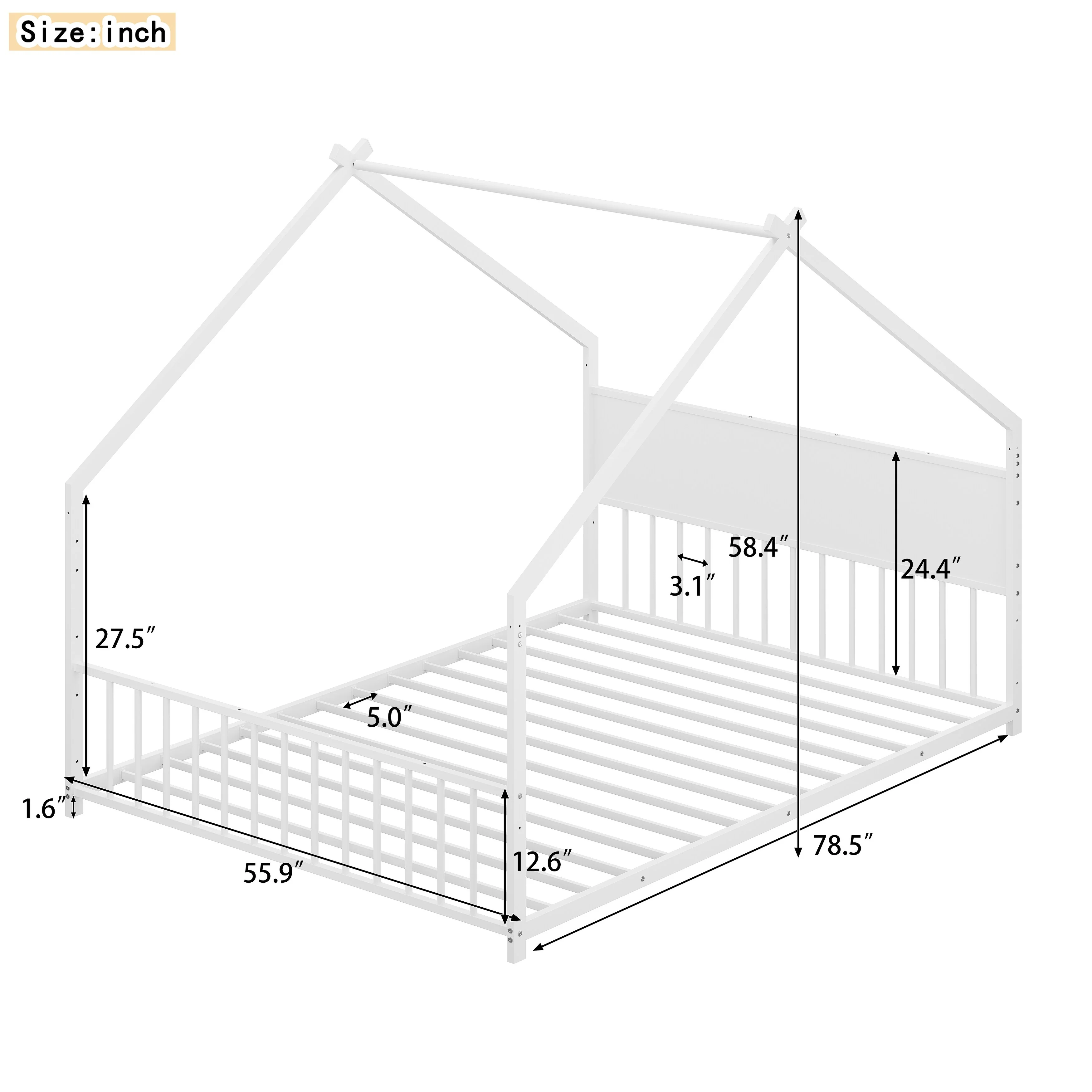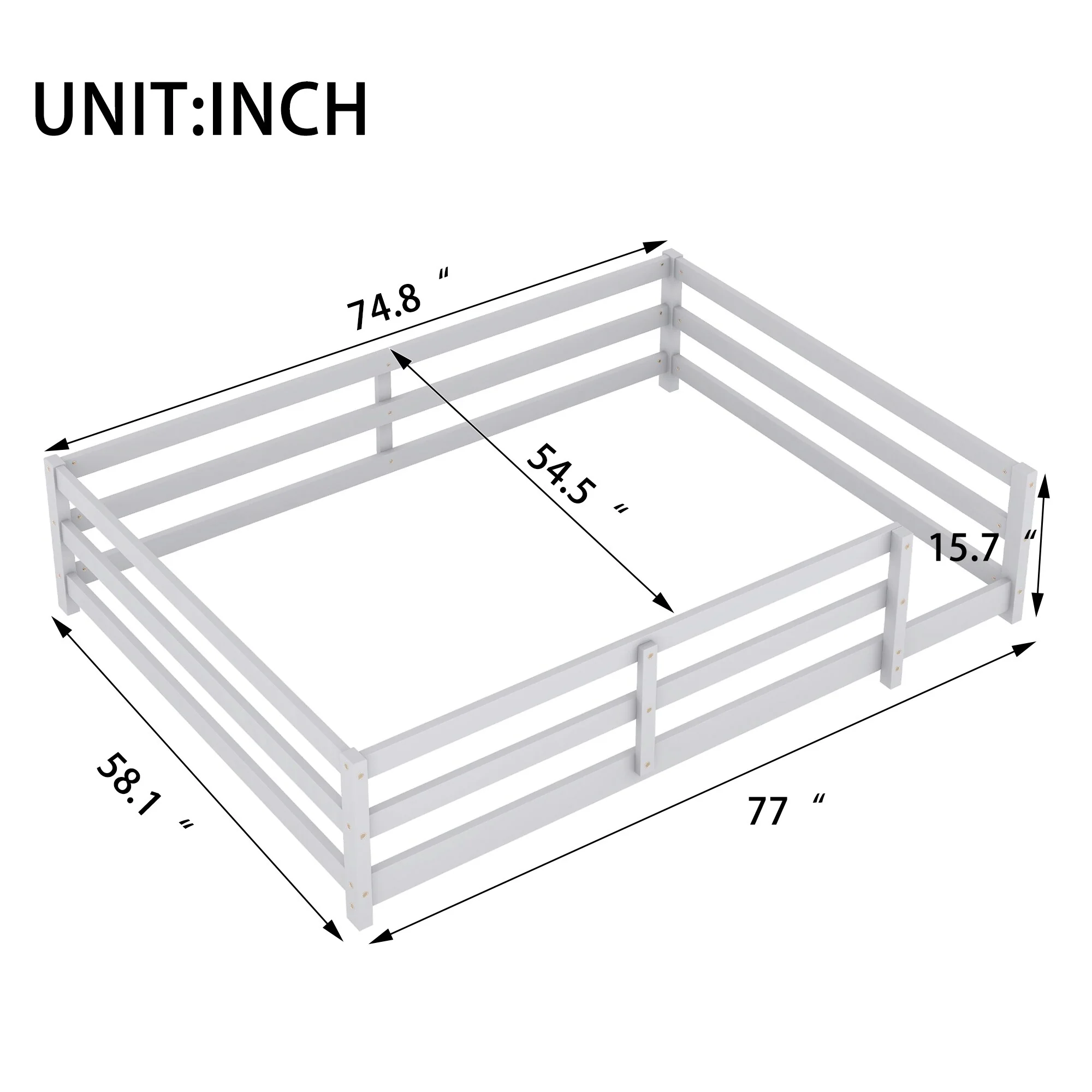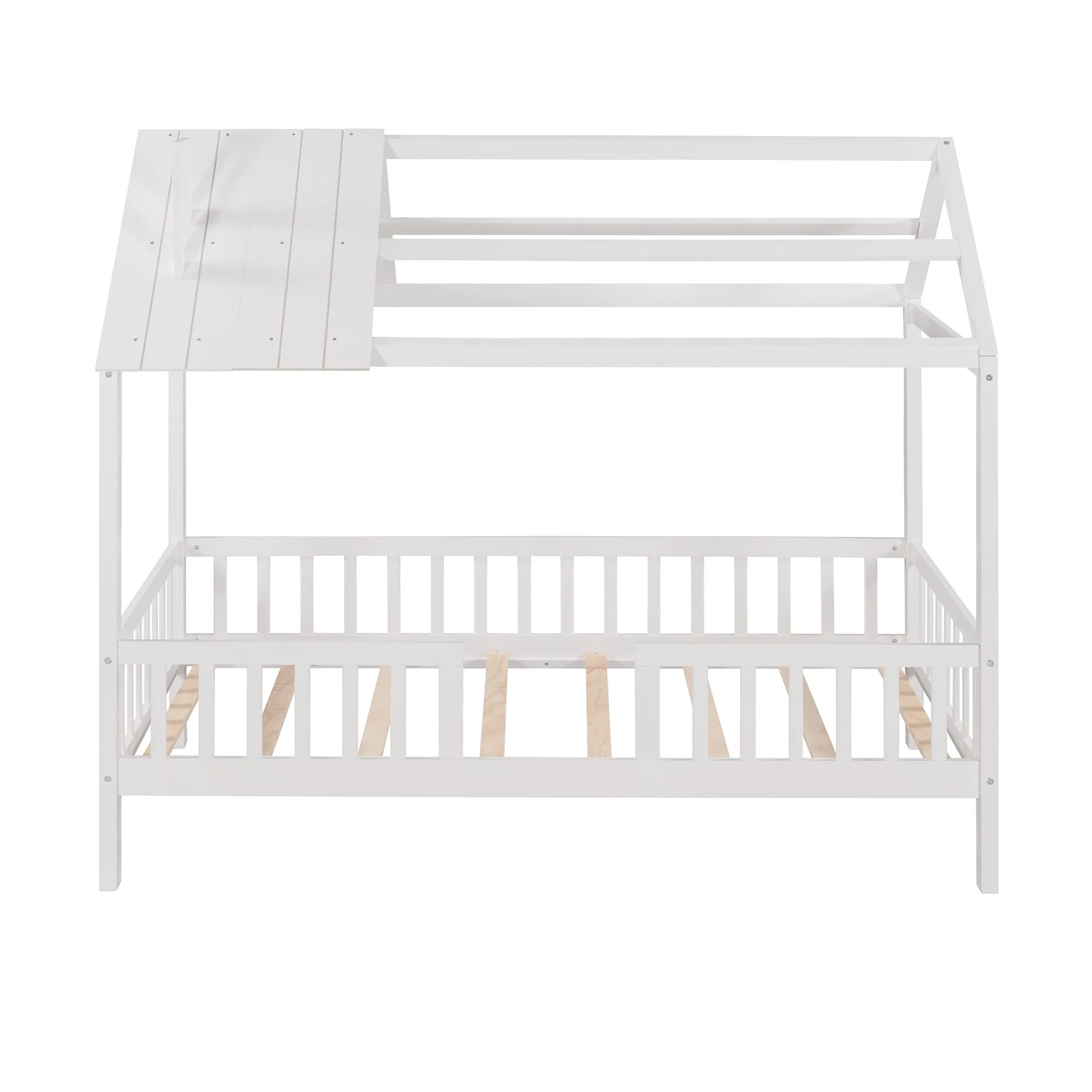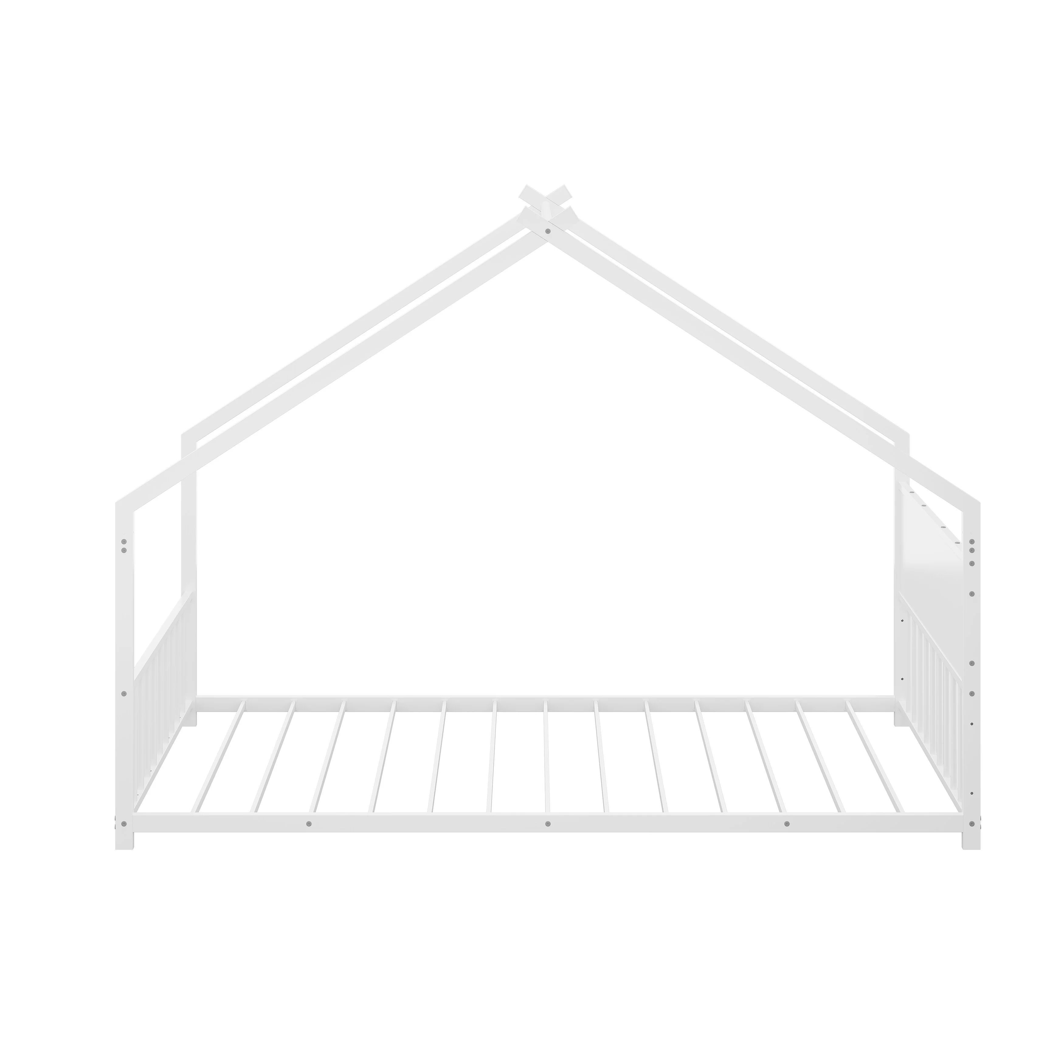 Queen Size Floor Bed Frame for Kids Bed with Fence Guardrails and Removable Door, Slats Playroom Montessori Platform Bed