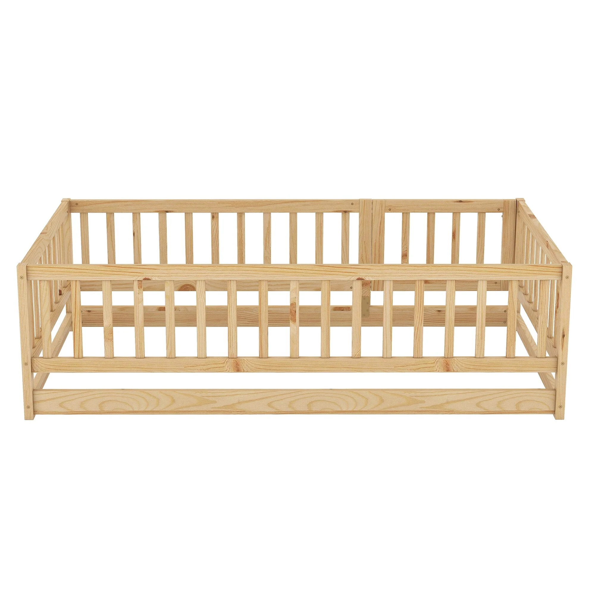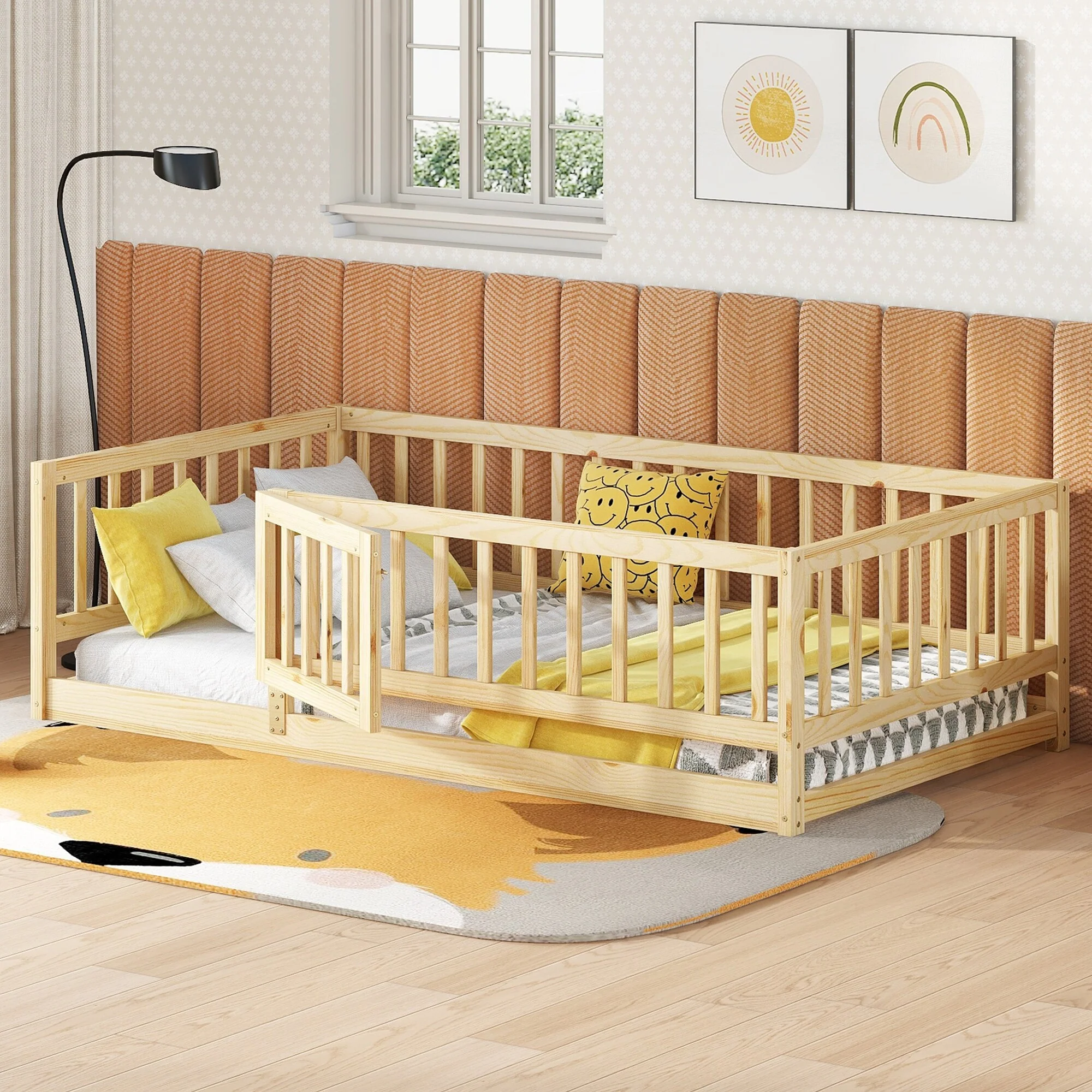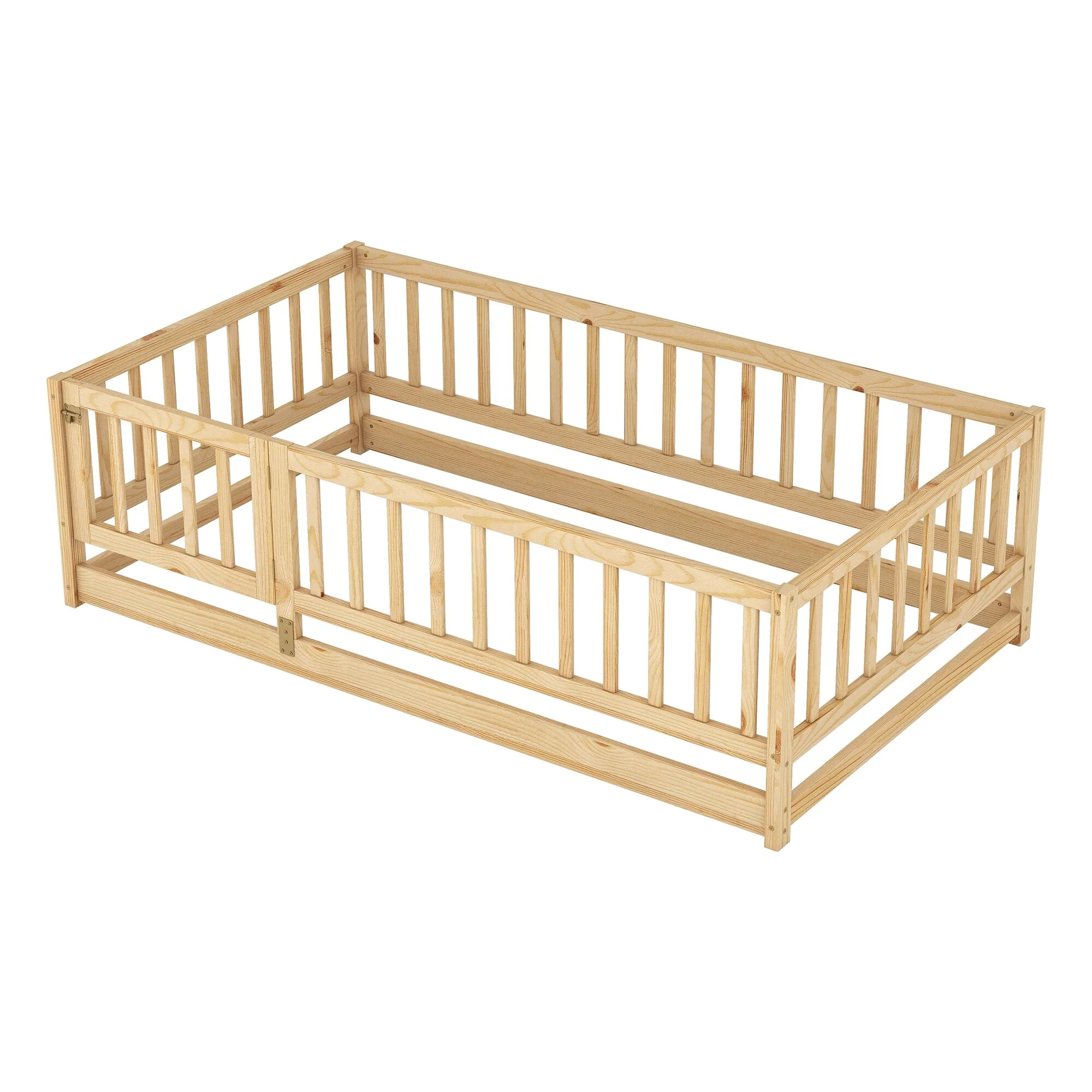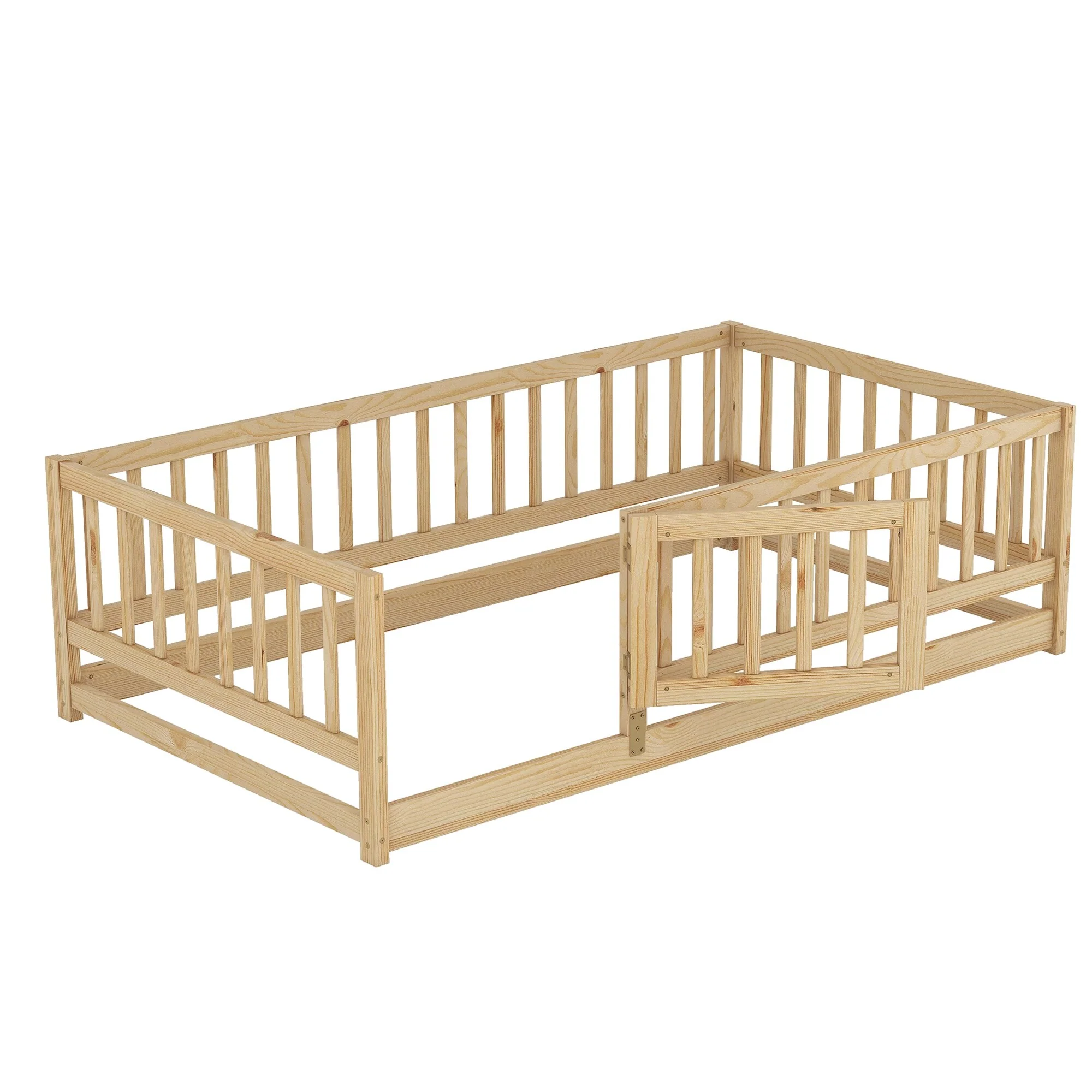 Montessori Floor Bed with Fence Guardrail and Removable Door Toddler Floor Wood Bed Frame for Kids Boys Girls Children's Room
