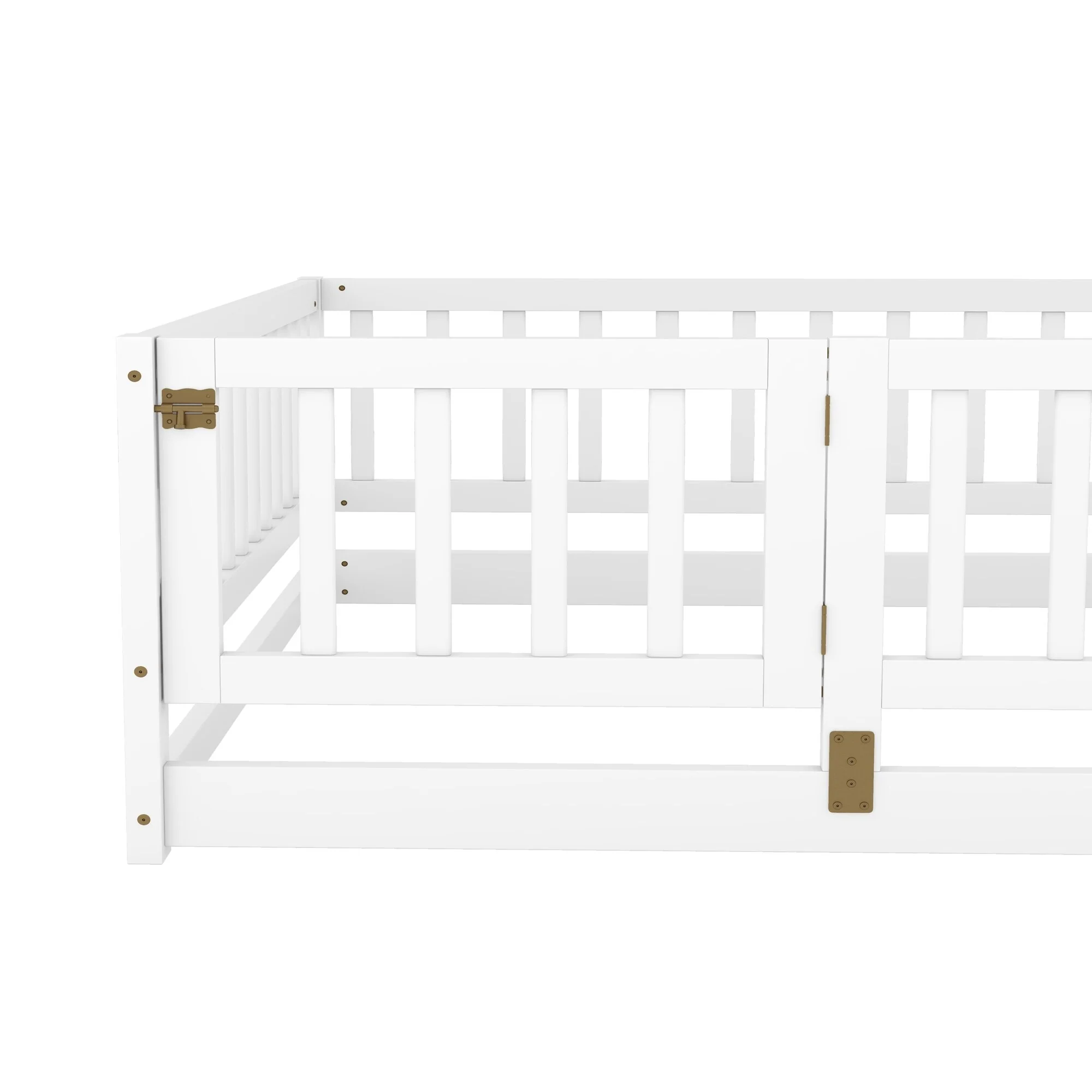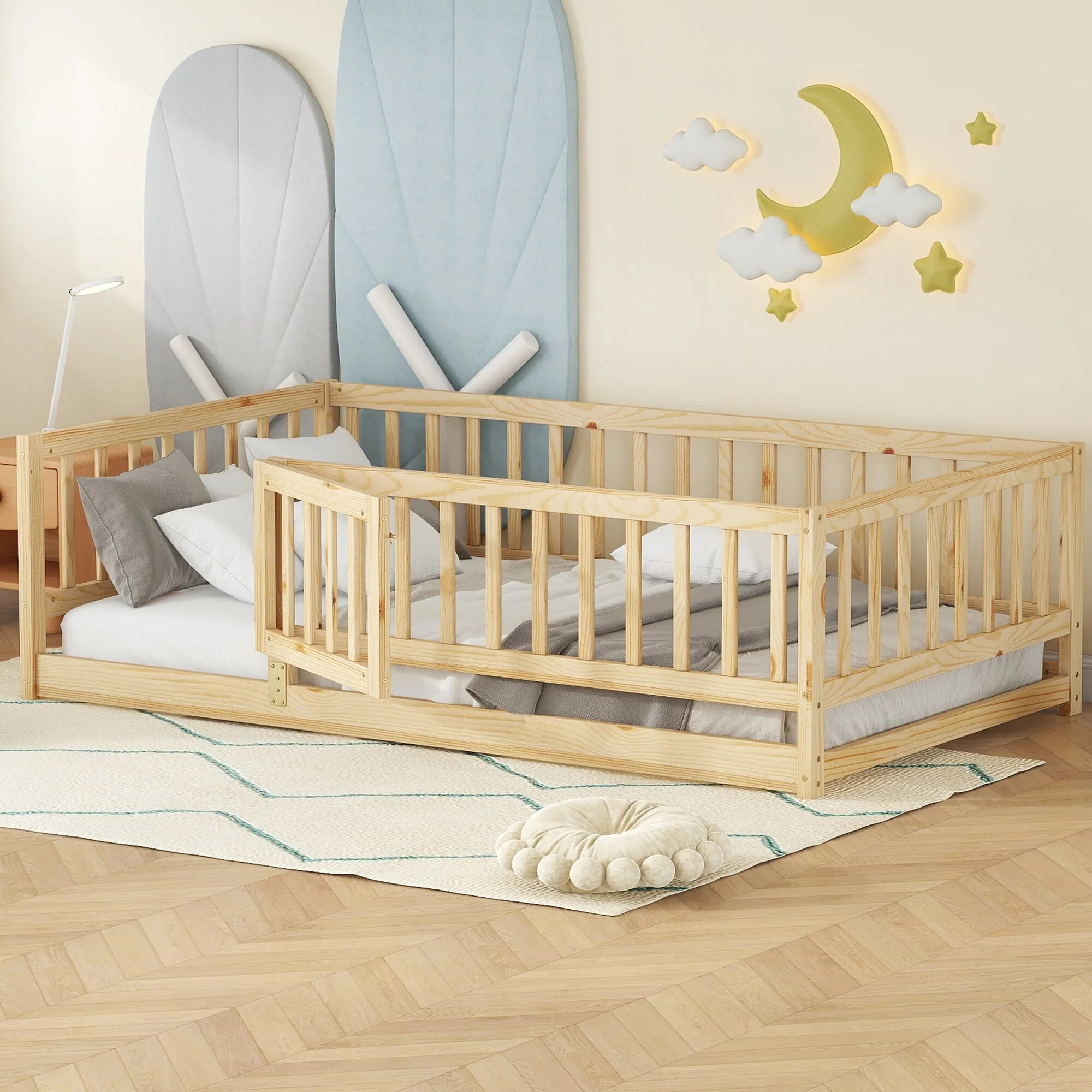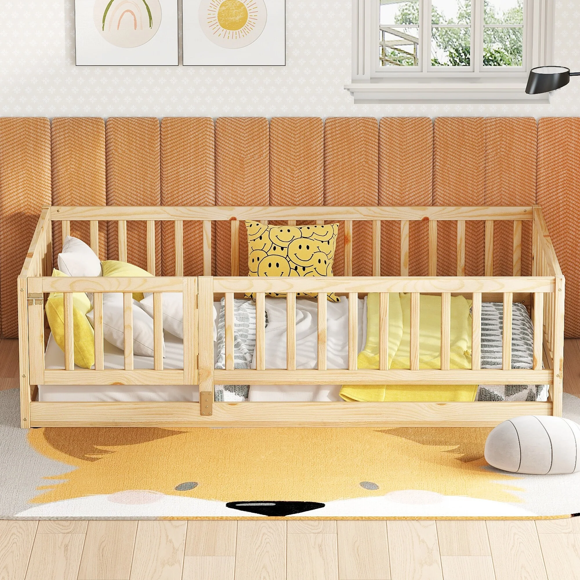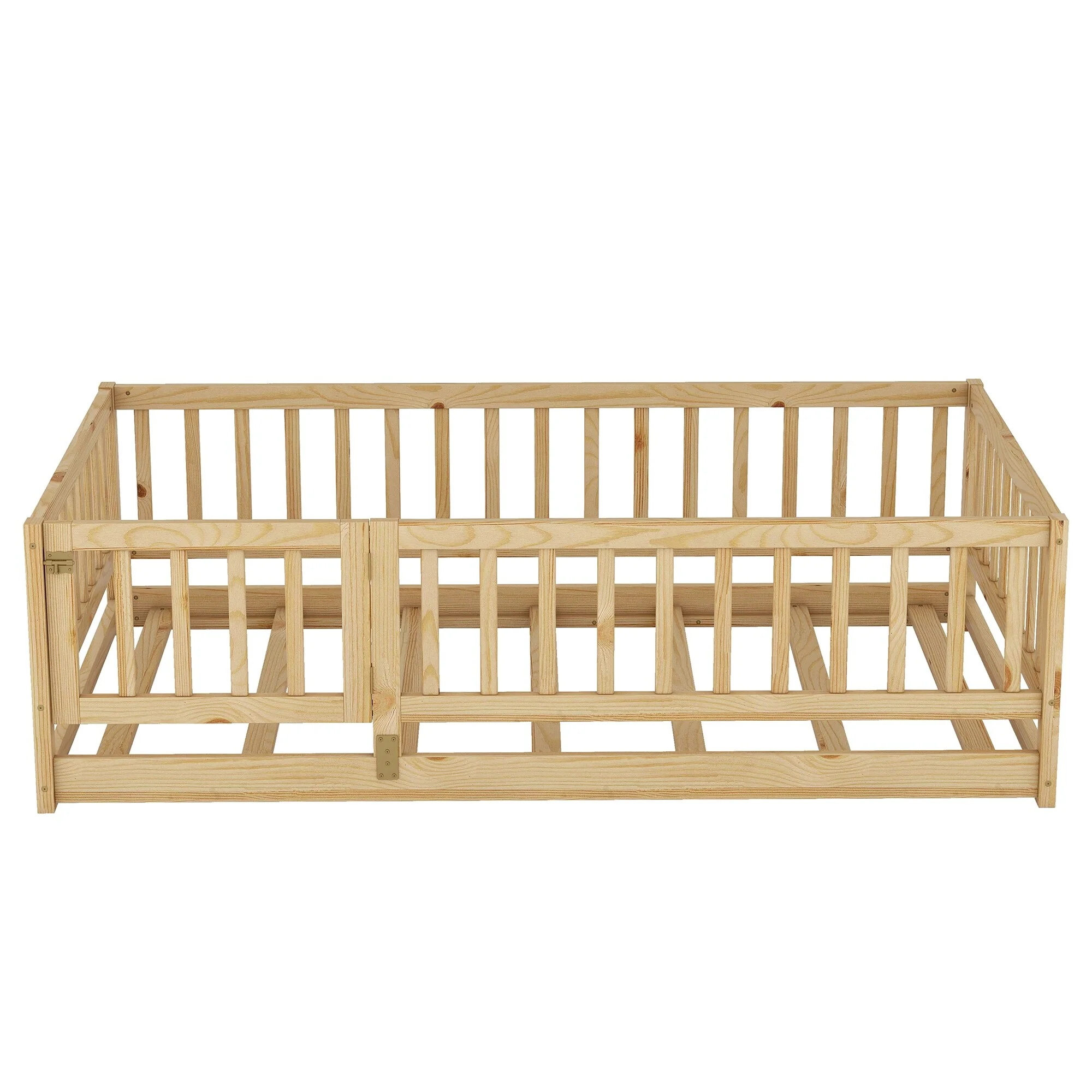Montessori Floor Bed with Fence Guardrail and Removable Door Toddler Floor Wood Bed Frame for Kids Boys Girls Children's Room