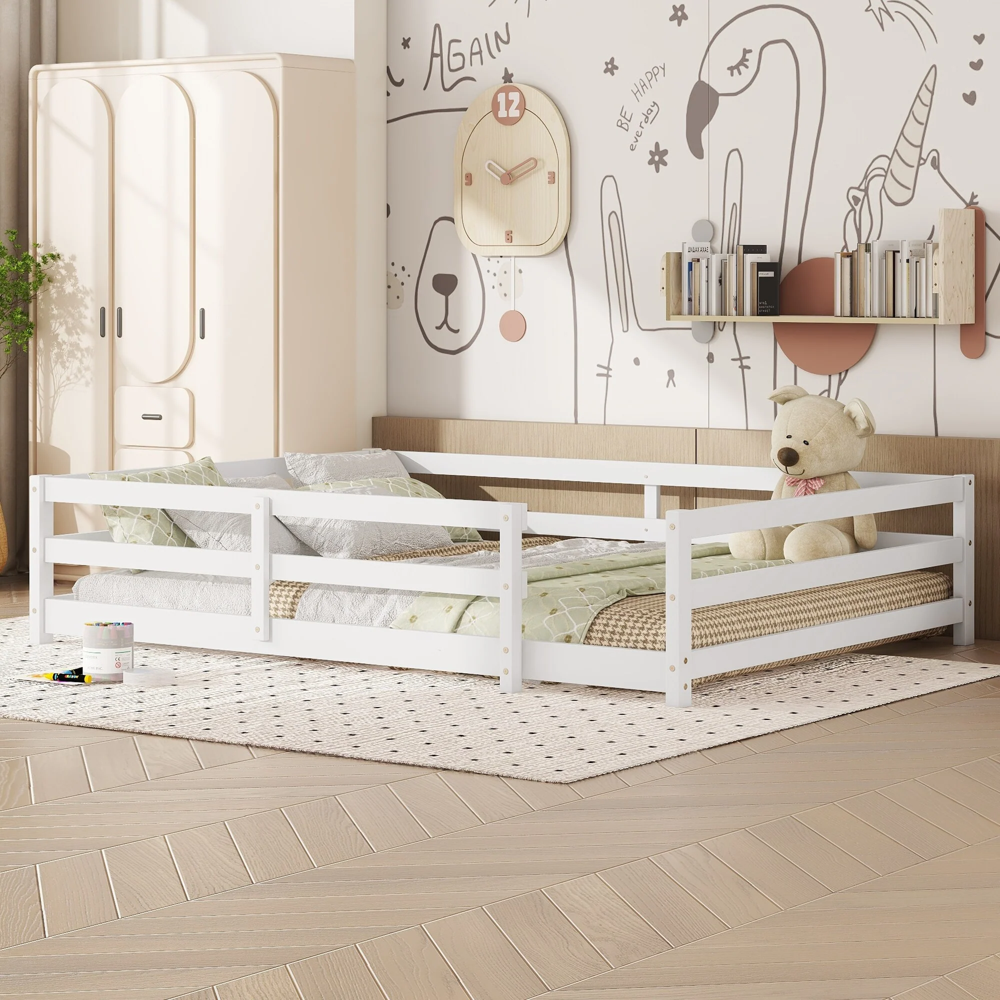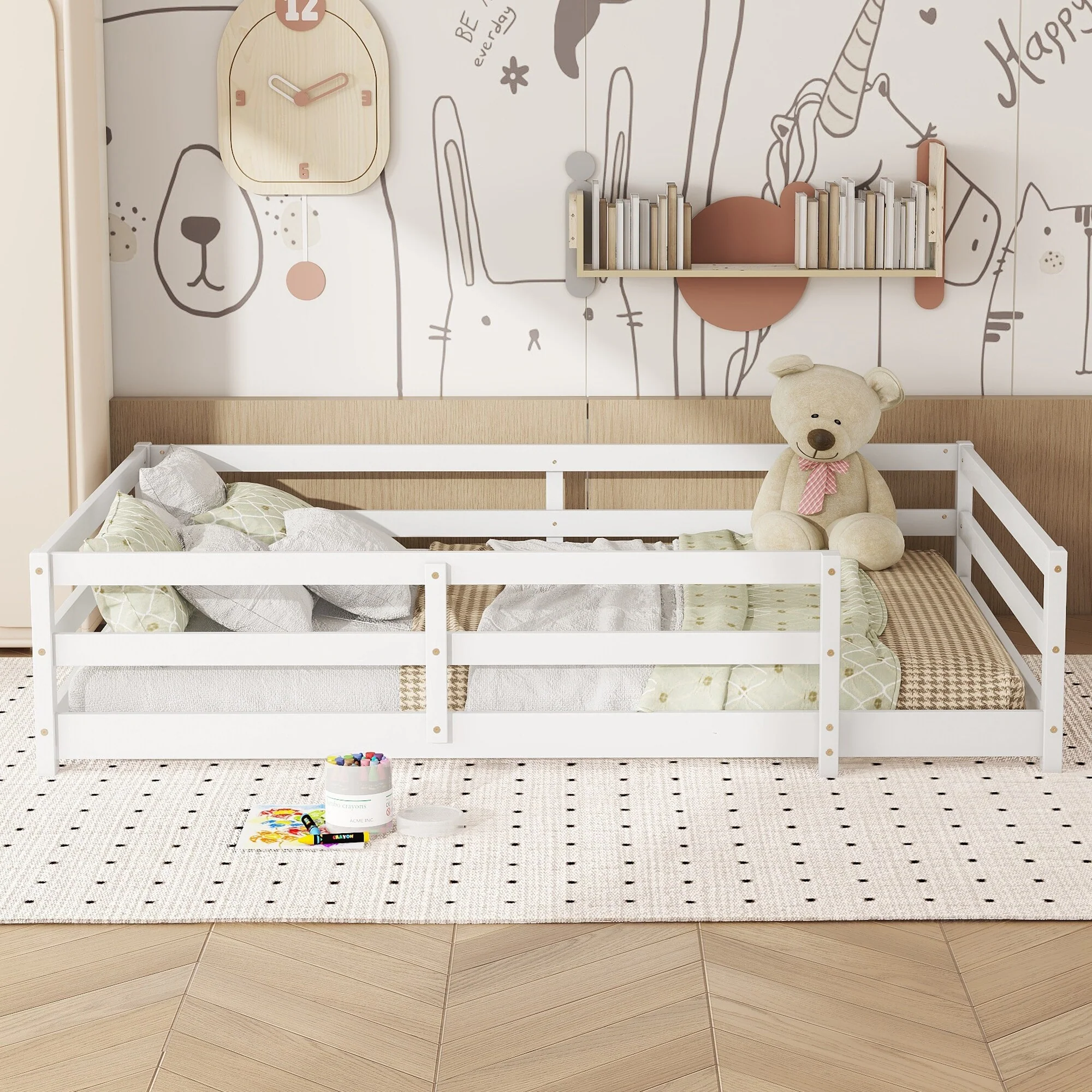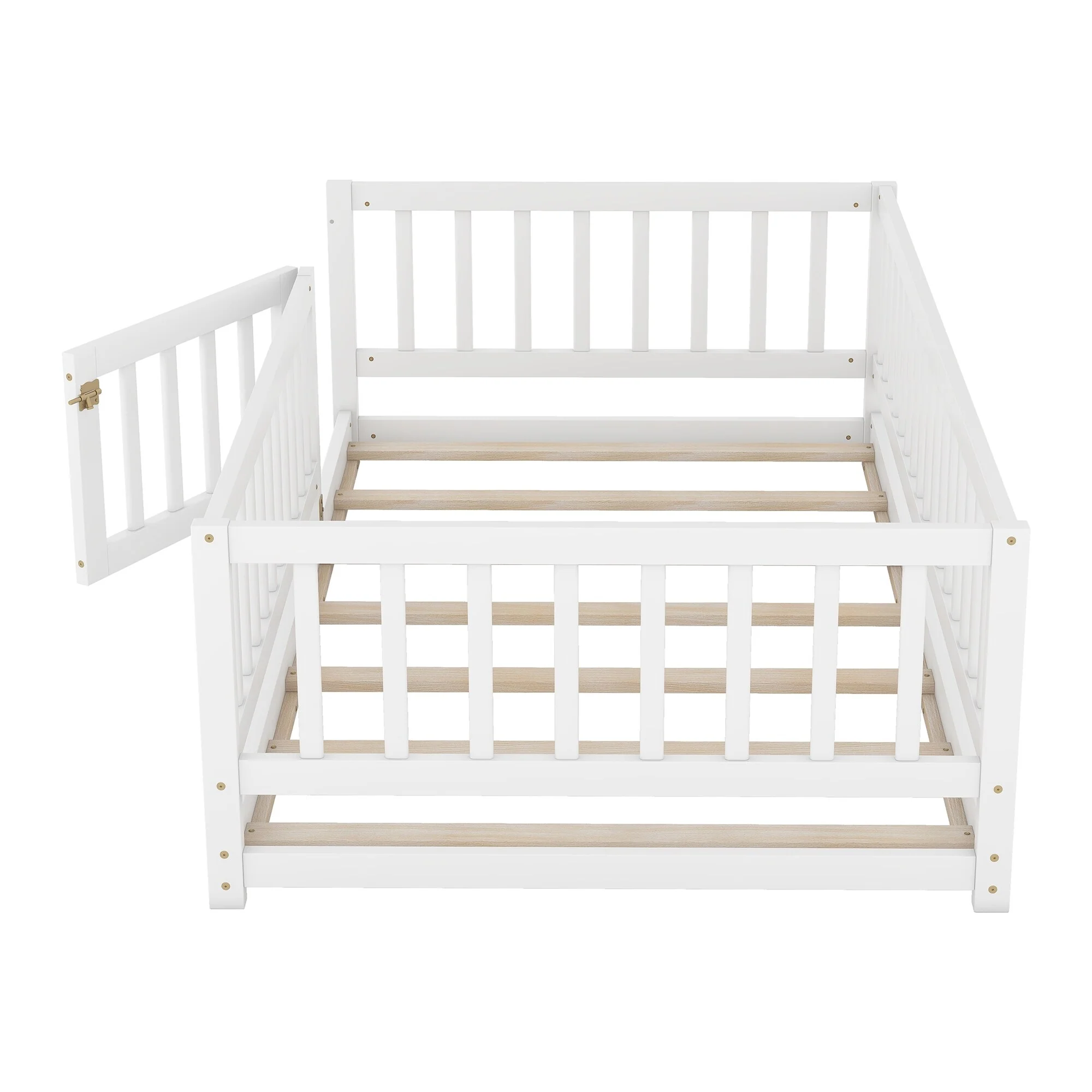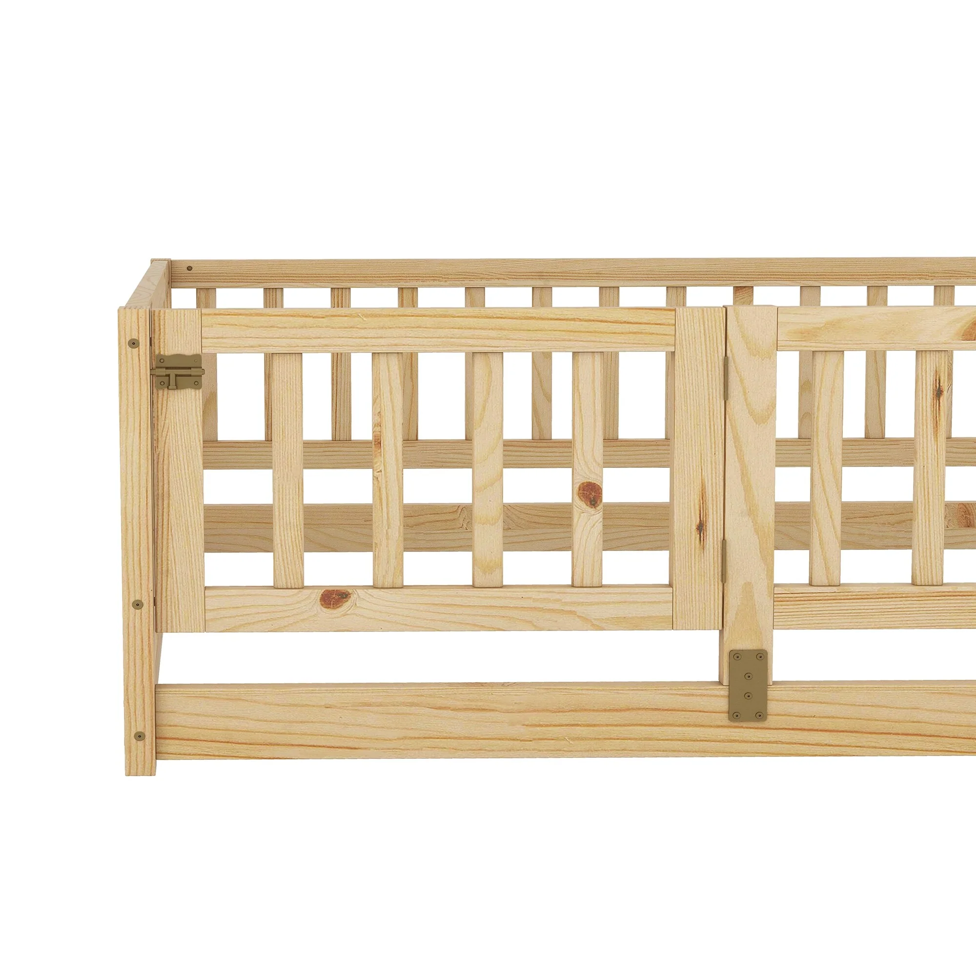 Montessori Floor Bed with Fence Guardrail and Removable Door Toddler Floor Wood Bed Frame for Kids Boys Girls Children's Room