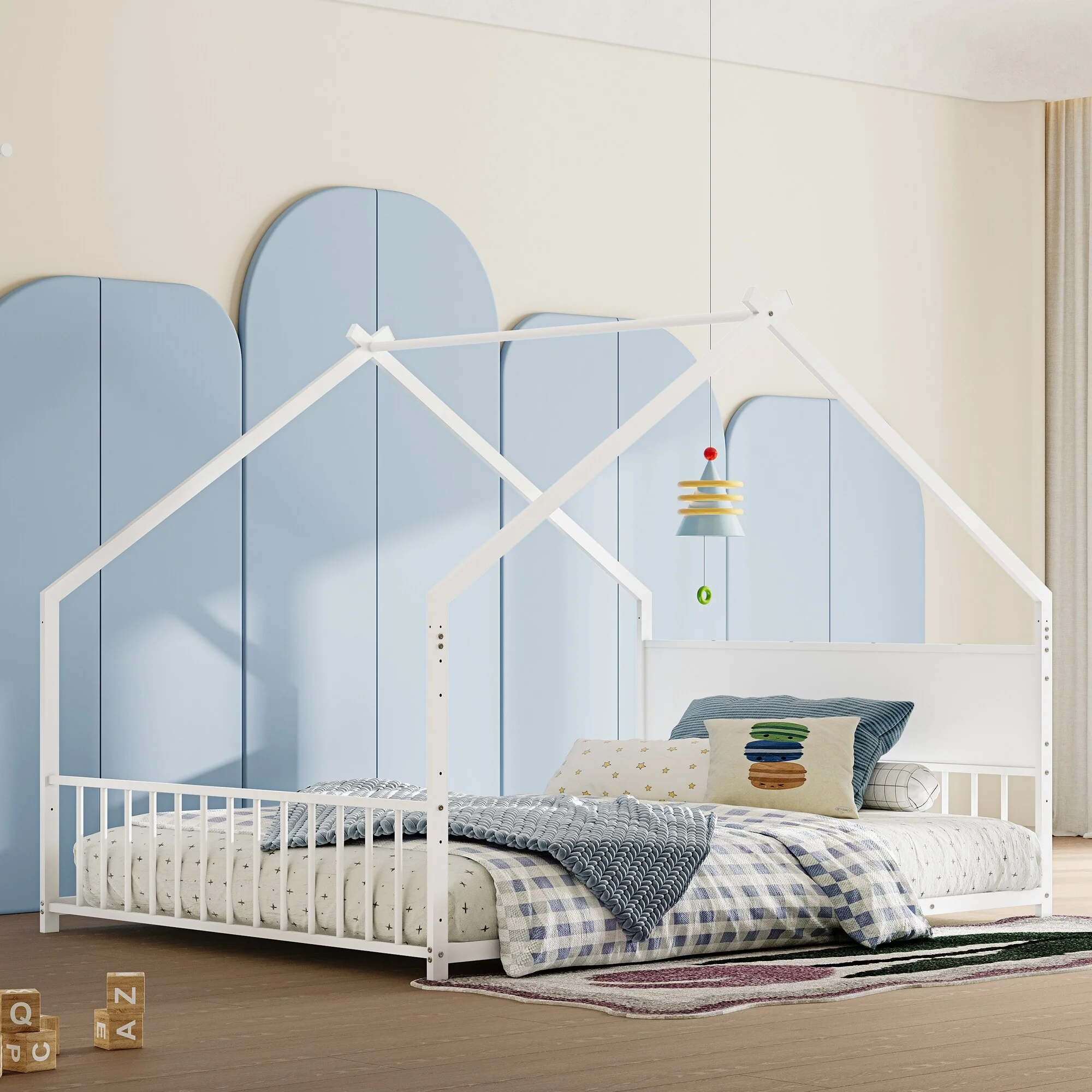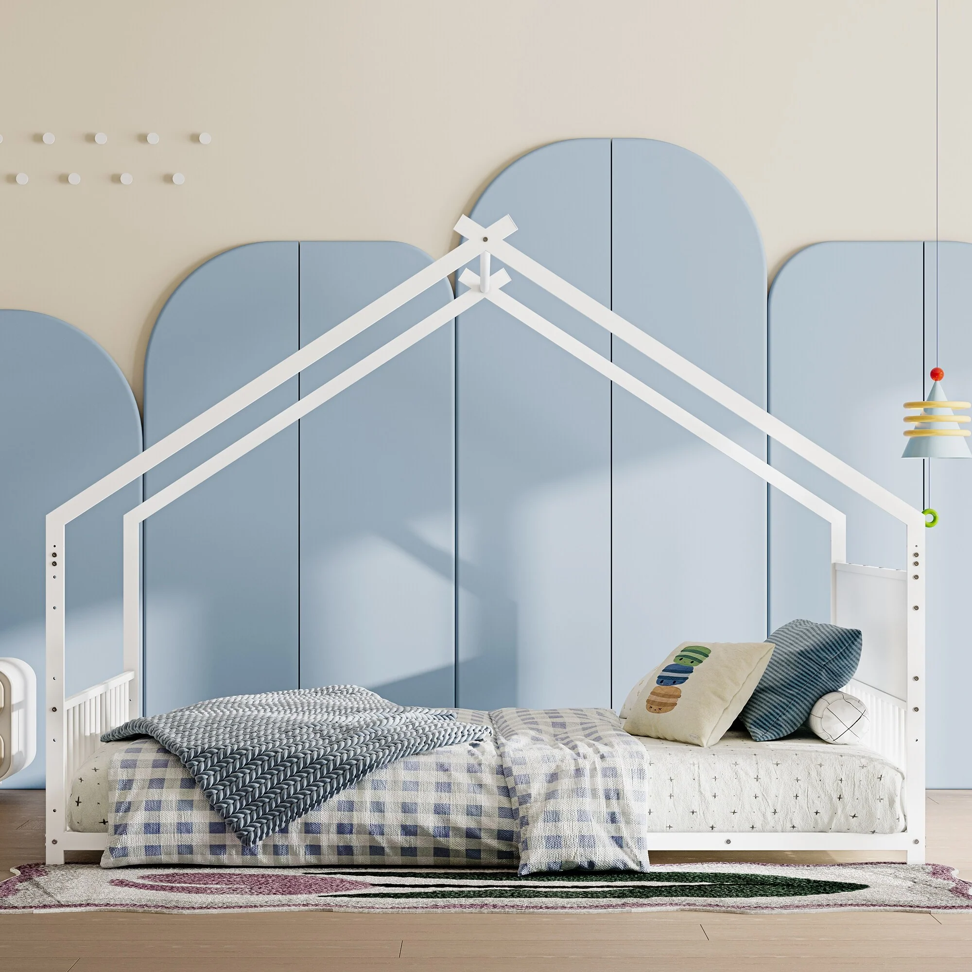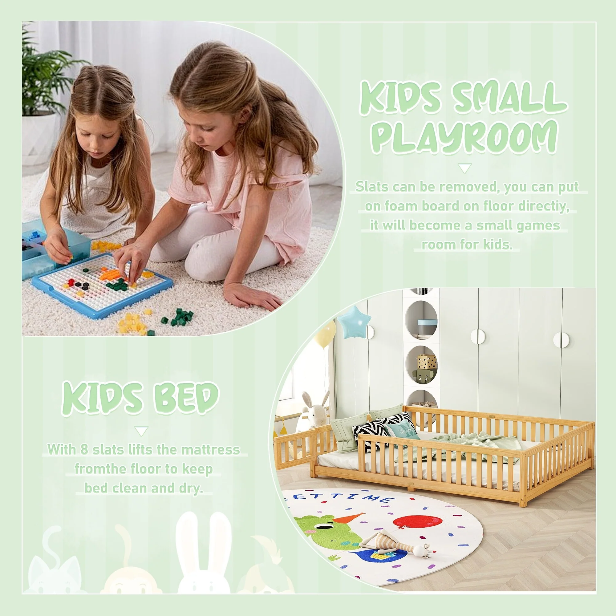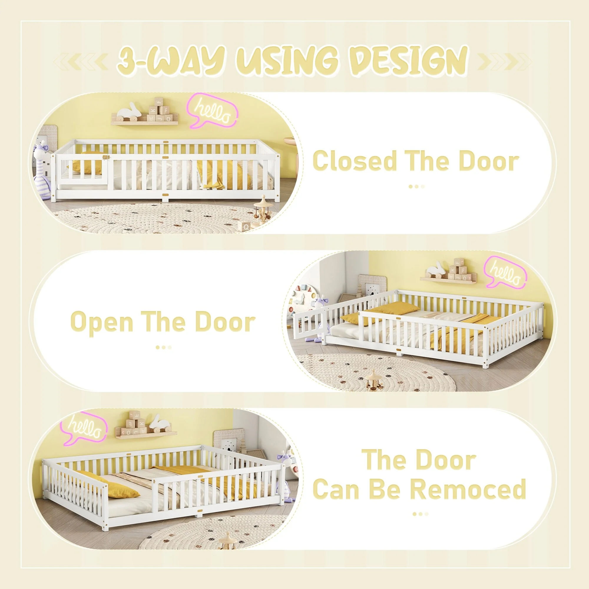 Montessori Floor Bed with Fence Guardrail and Removable Door Toddler Floor Wood Bed Frame for Kids Boys Girls Children's Room