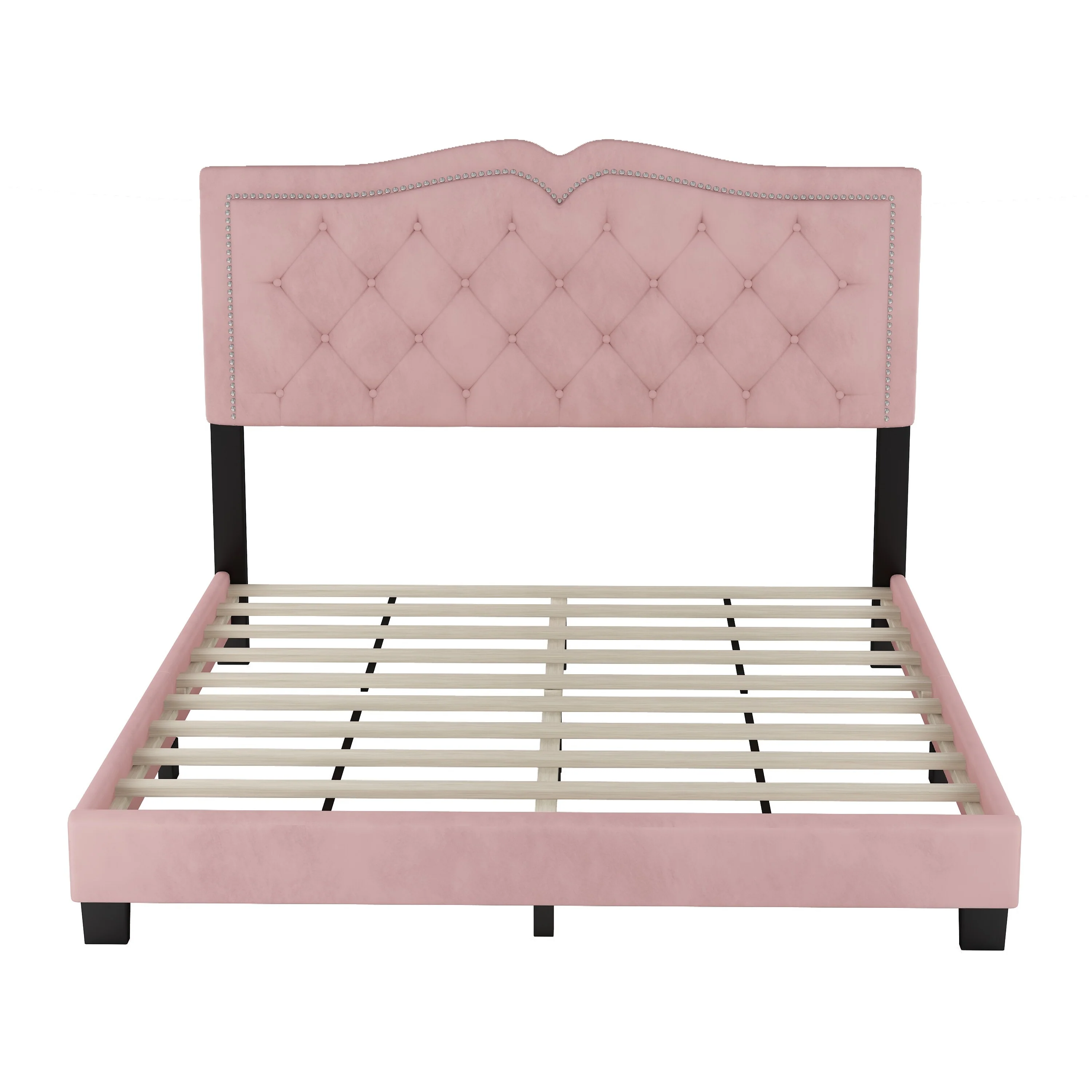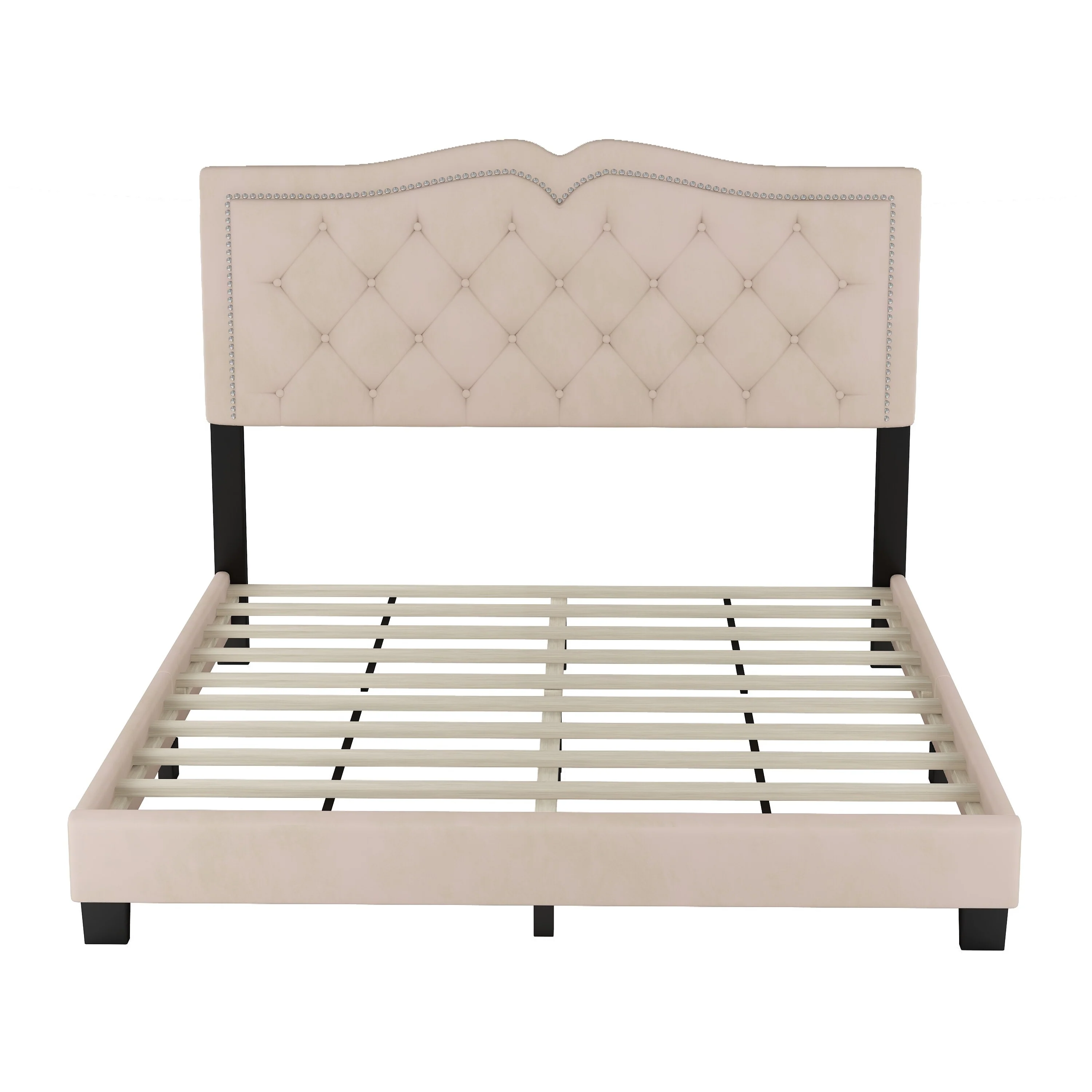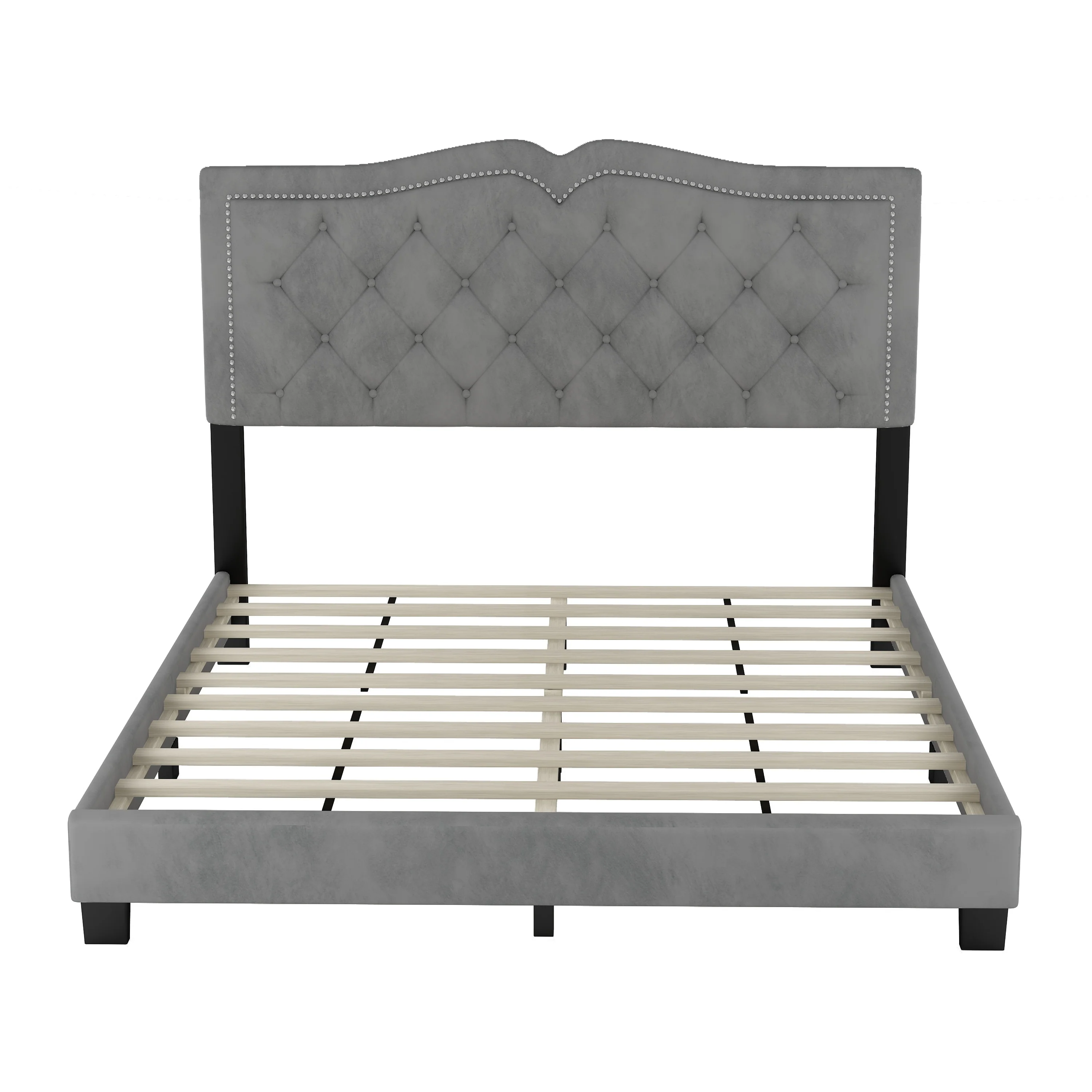 Modern Queen Upholstered Bed Frame with Velvet Tufted Headboard and Rivet Accents