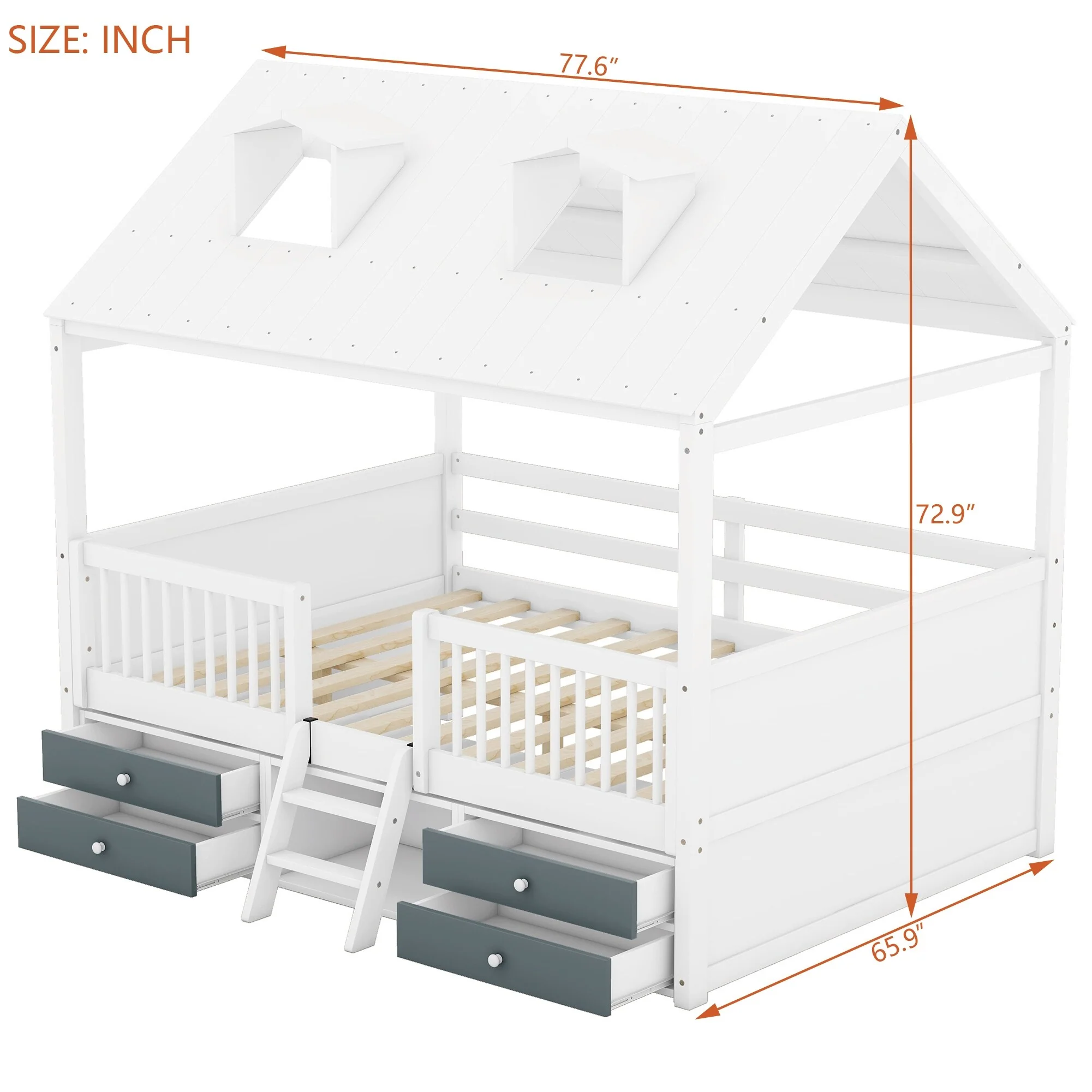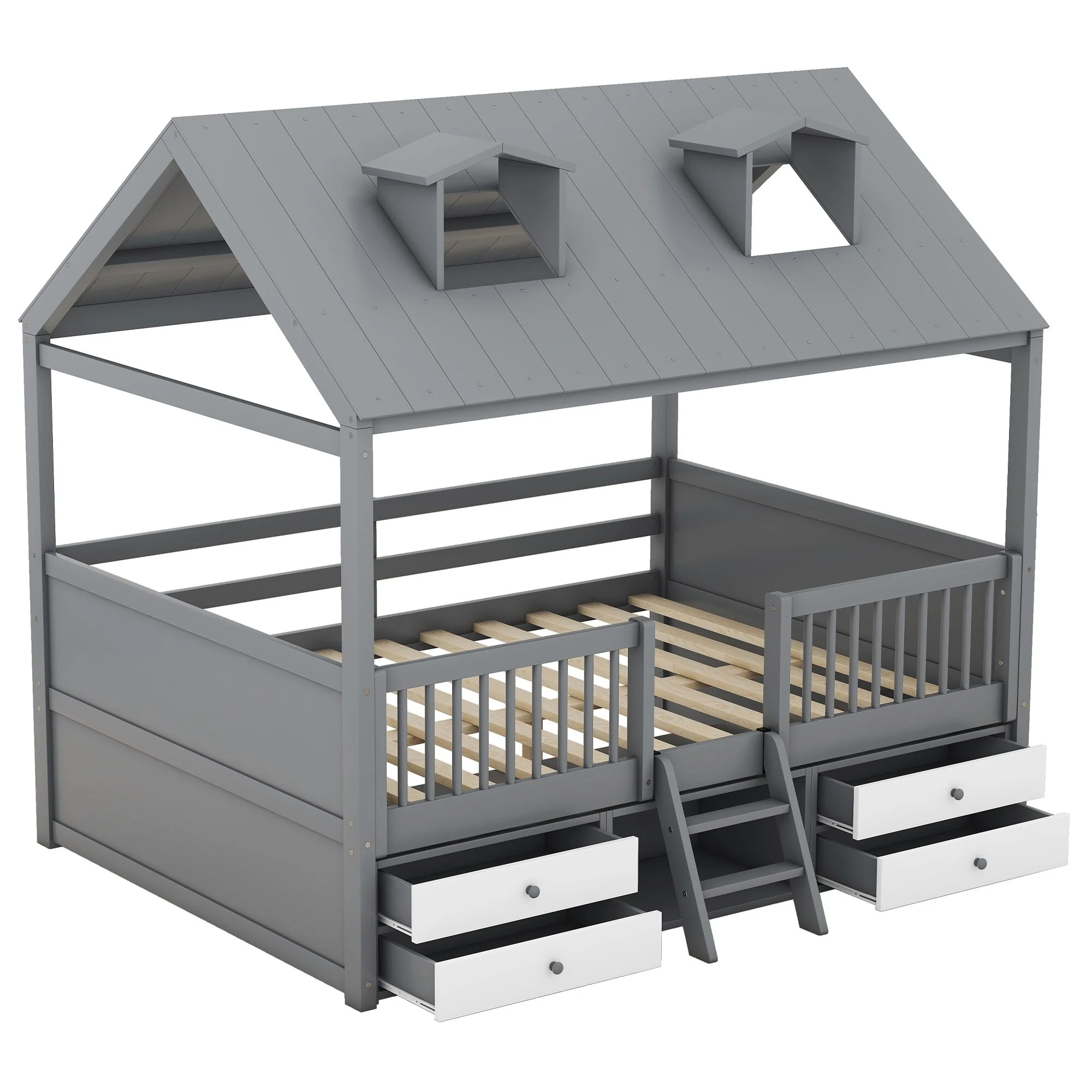House Bed Wood Low Loft Bed House-shape Frame Bed with 2 Roof Skylights, Kids Storage Bed with 4 Drawers, Guardrail and Stairs