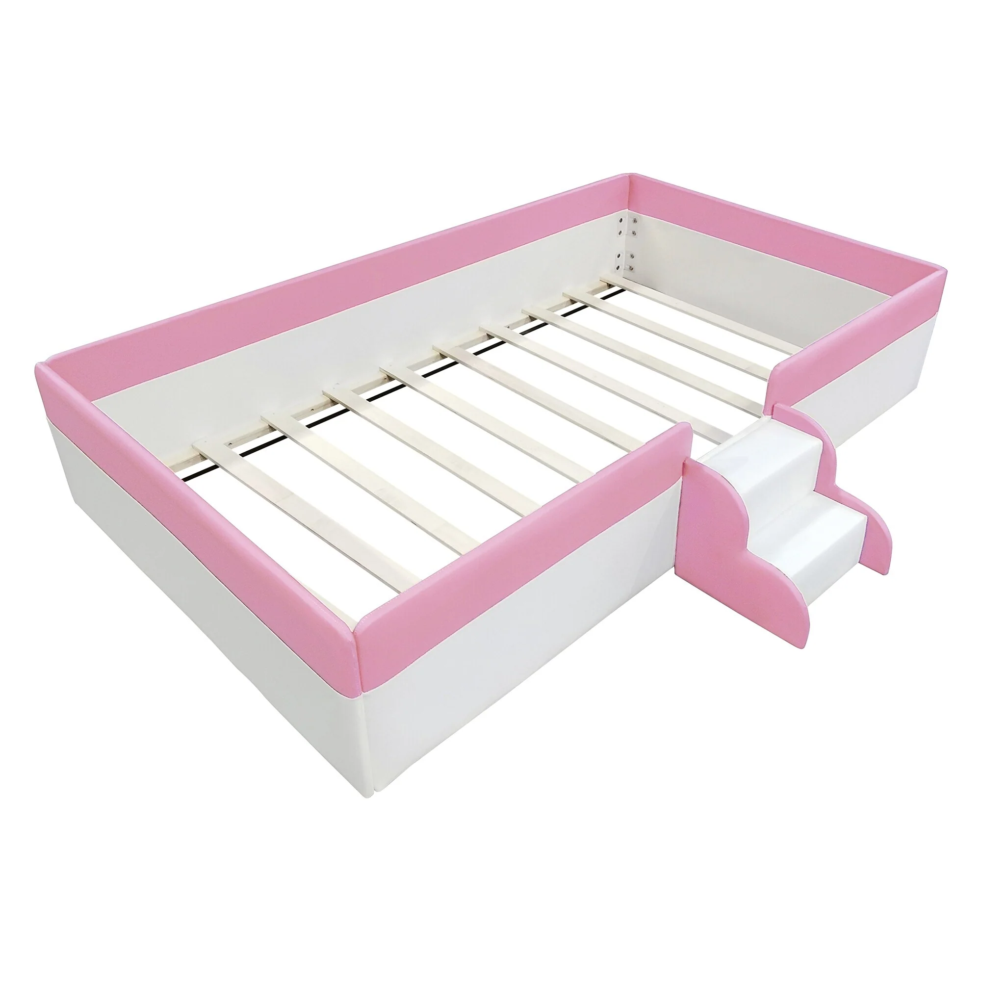 Upholstered Daybed Frame Two-color Grounded Toddler Floor Bed Low Profile Sofa Bed with Fence and Stairs Wood Slat Support Bed
