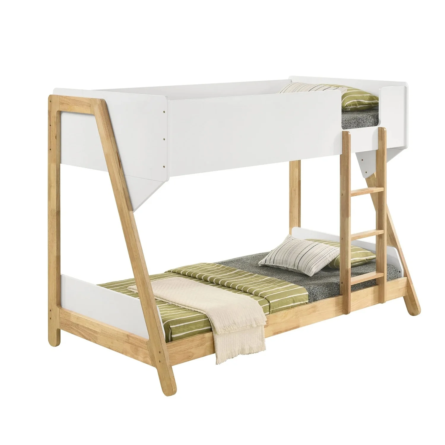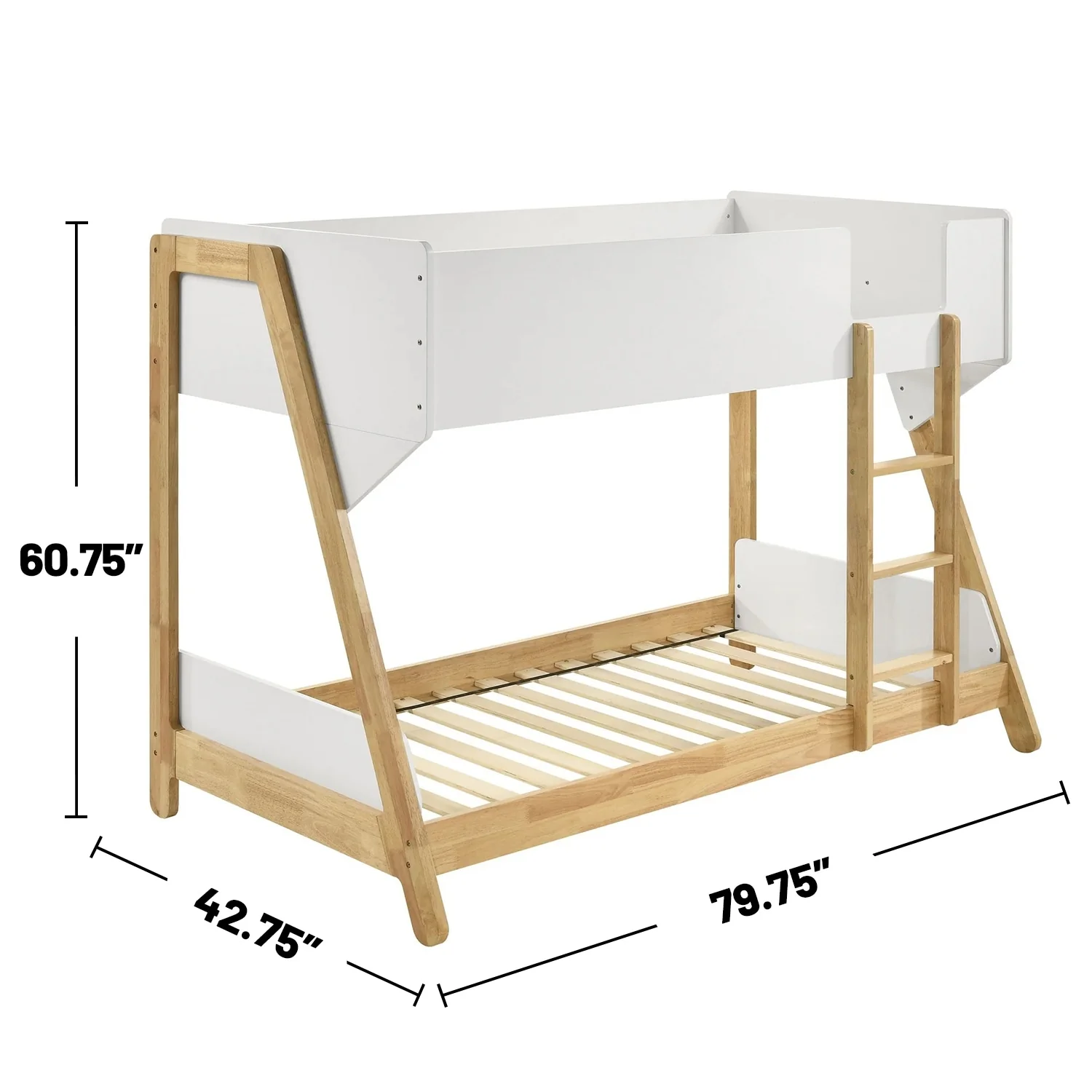 Wooden Twin Over Twin Bunk Bed with Ladder in White and Natural