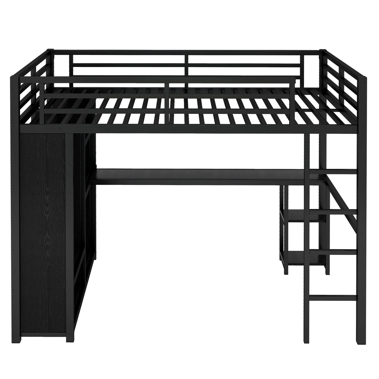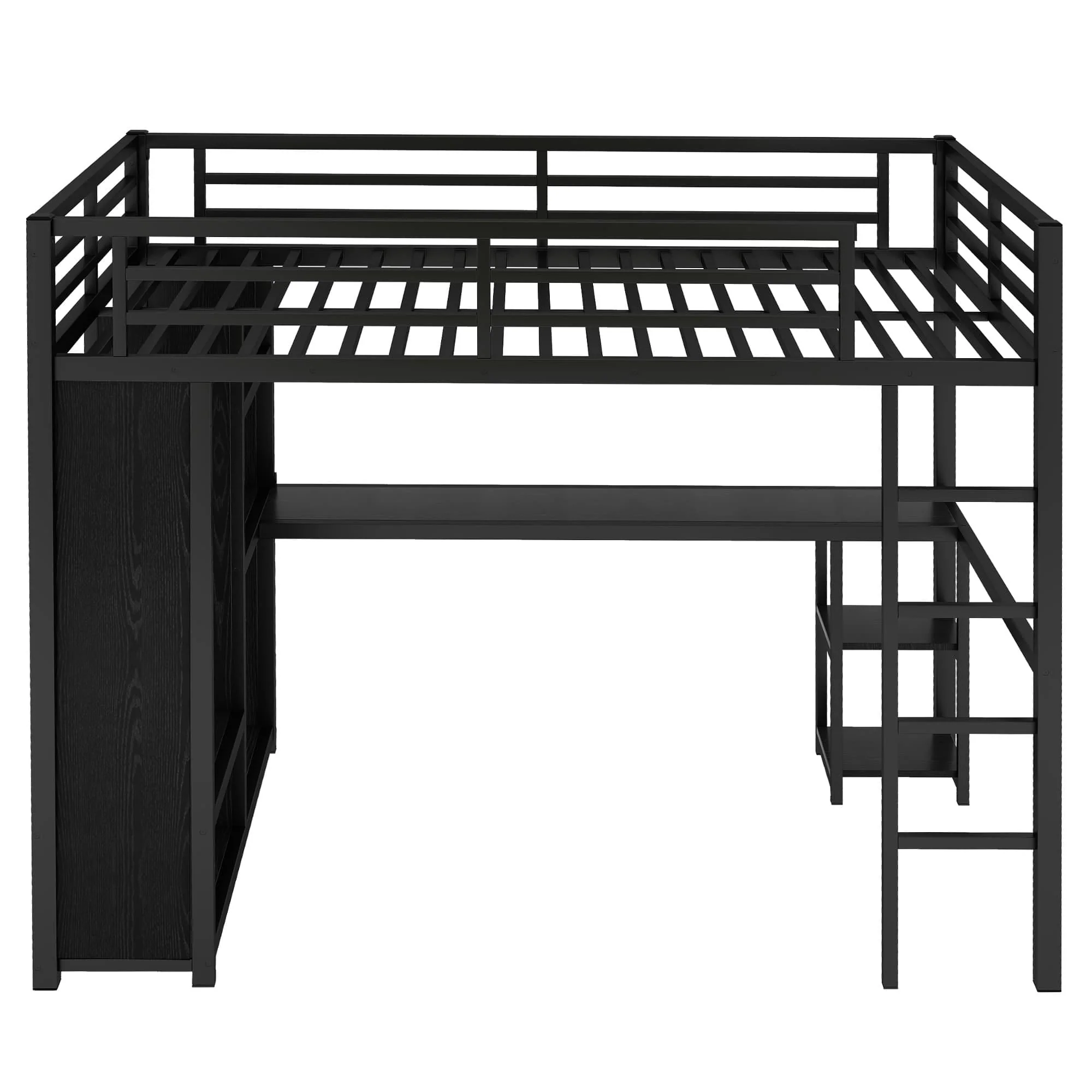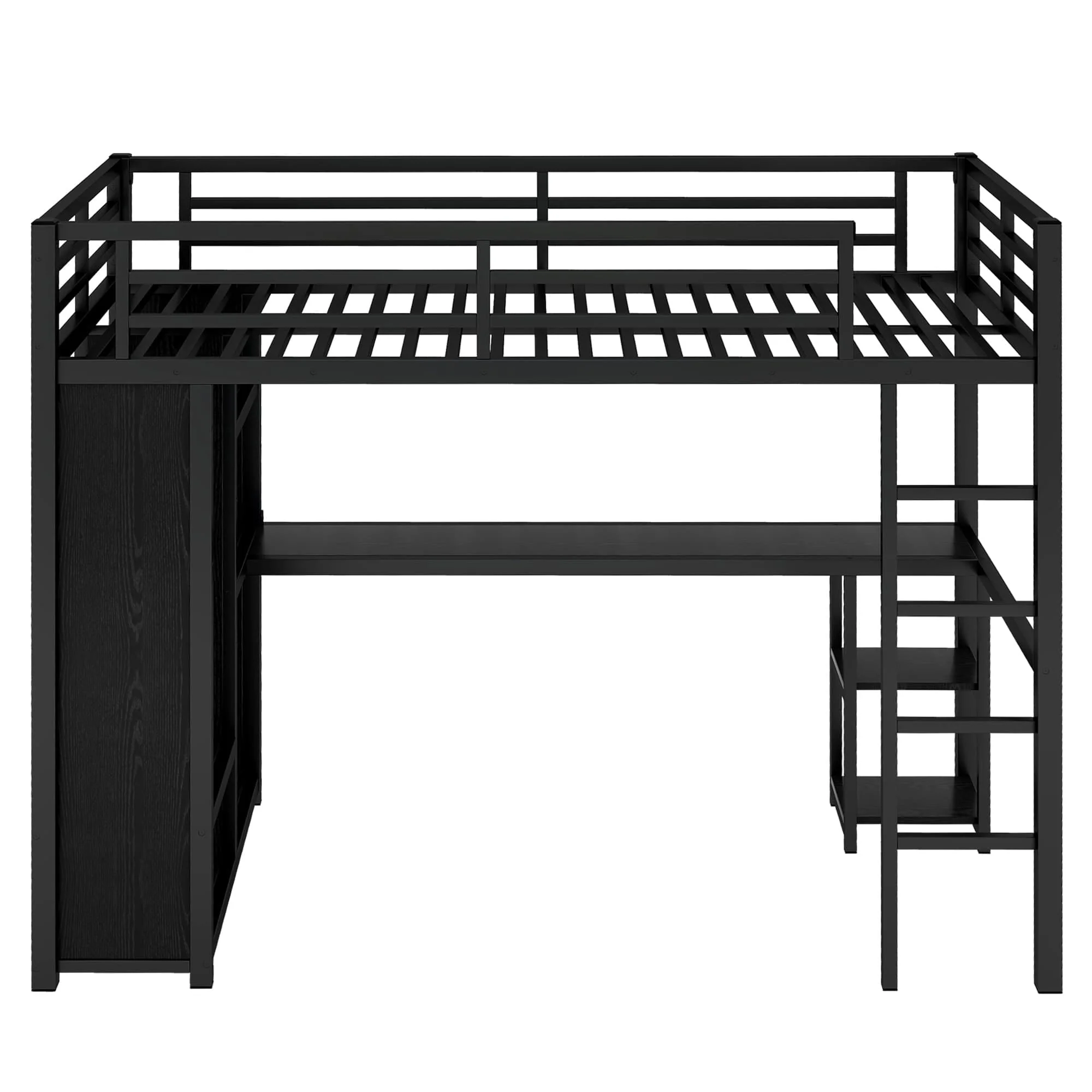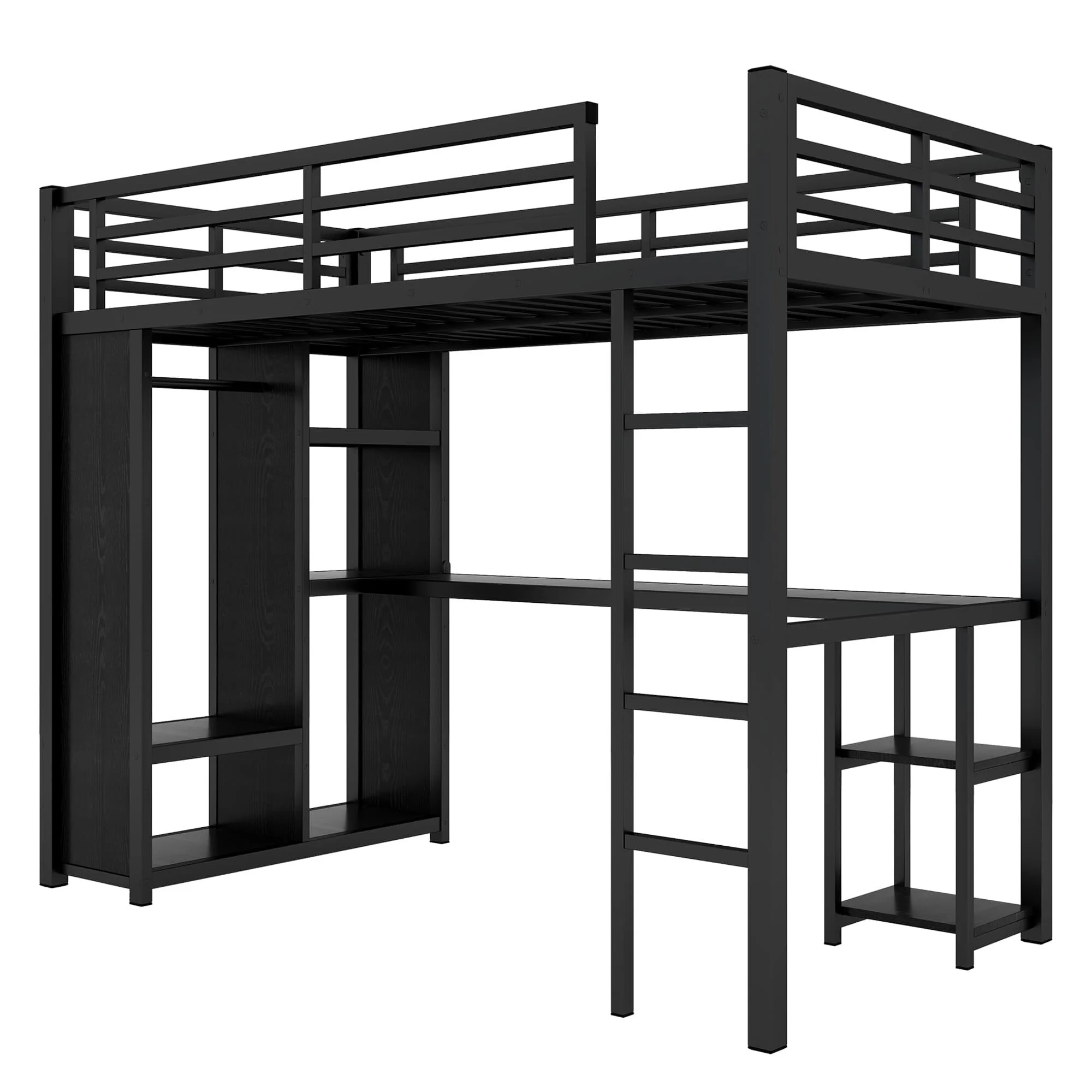 Black Metal Loft Bed Frame with Built-in Wardrobe, Desk and Shelves