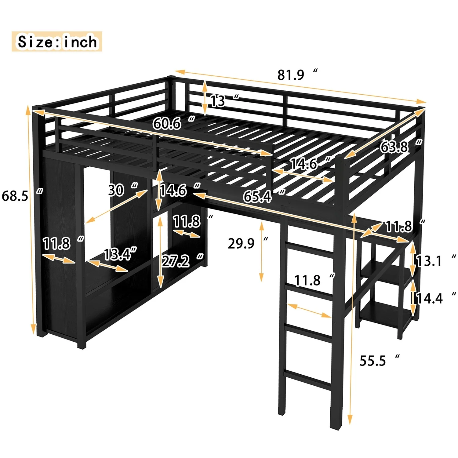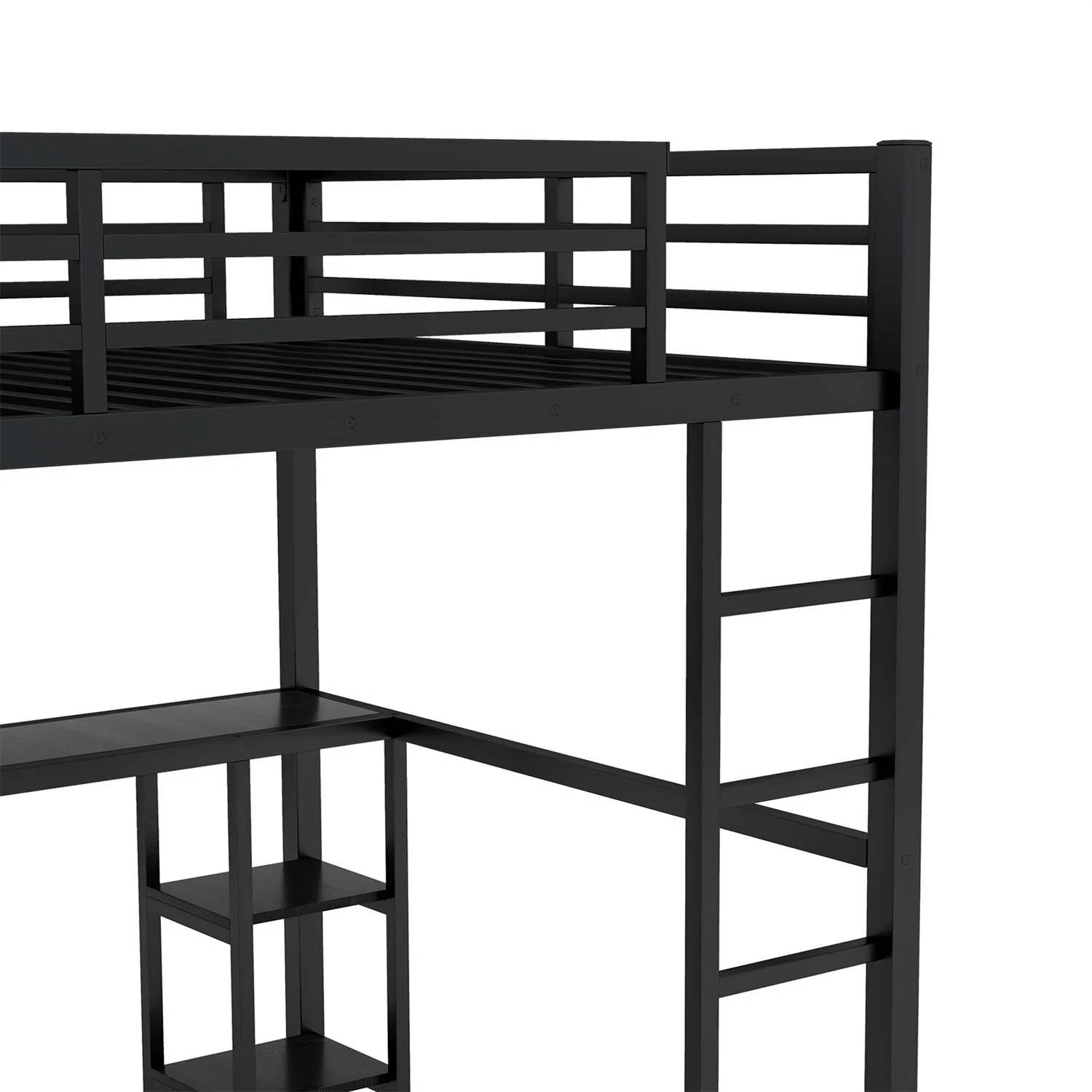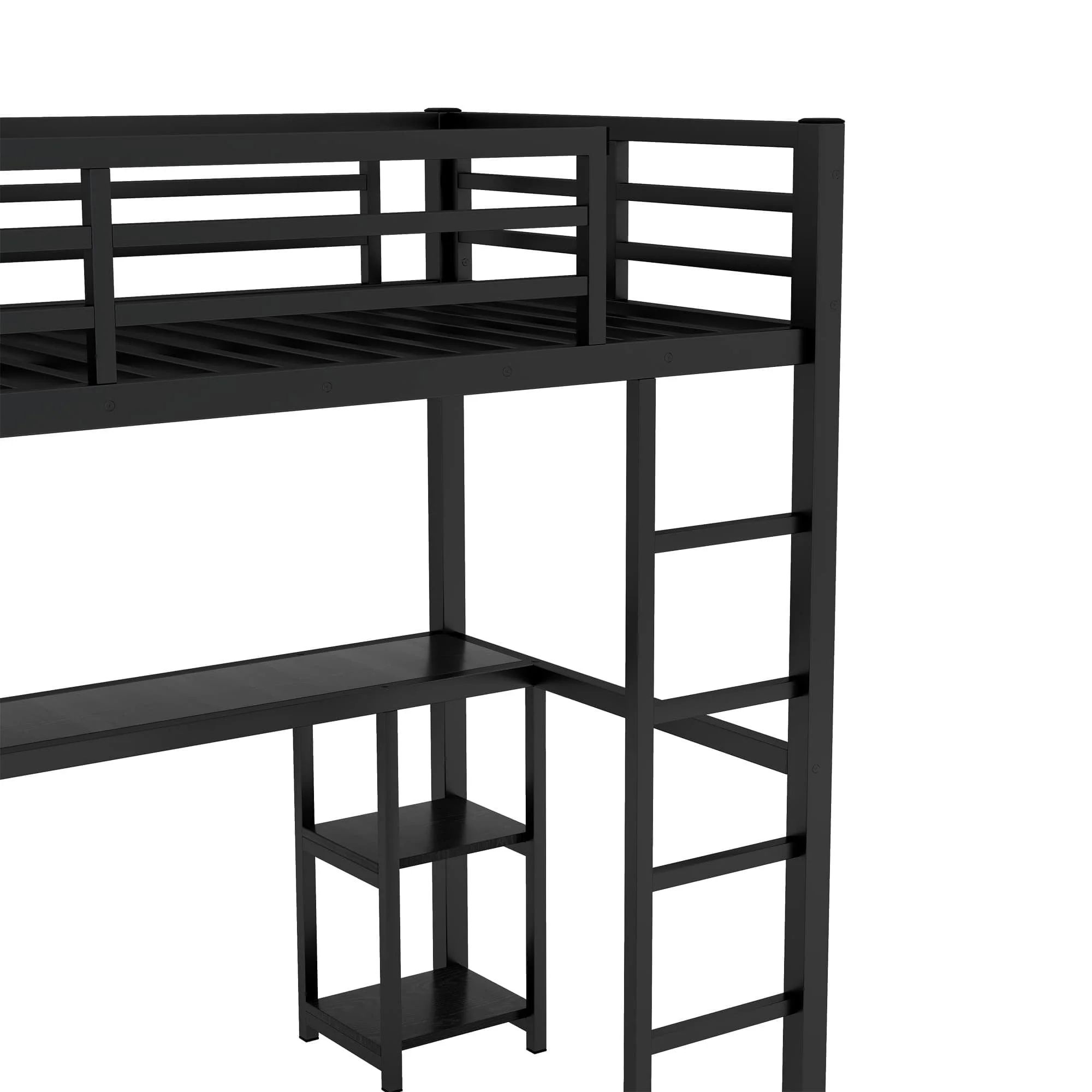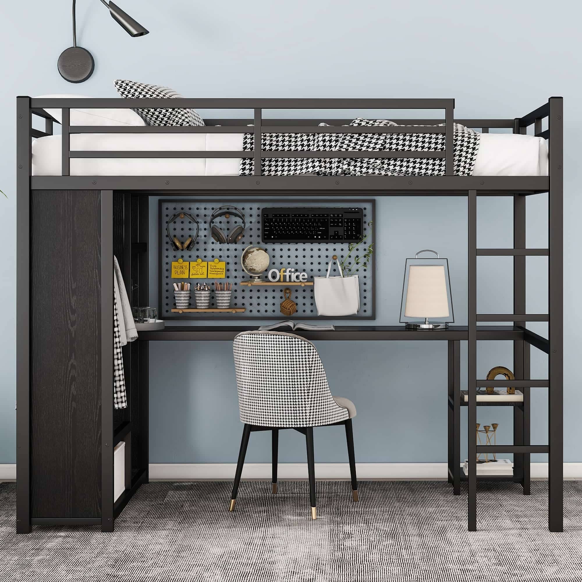 Black Metal Loft Bed Frame with Built-in Wardrobe, Desk and Shelves