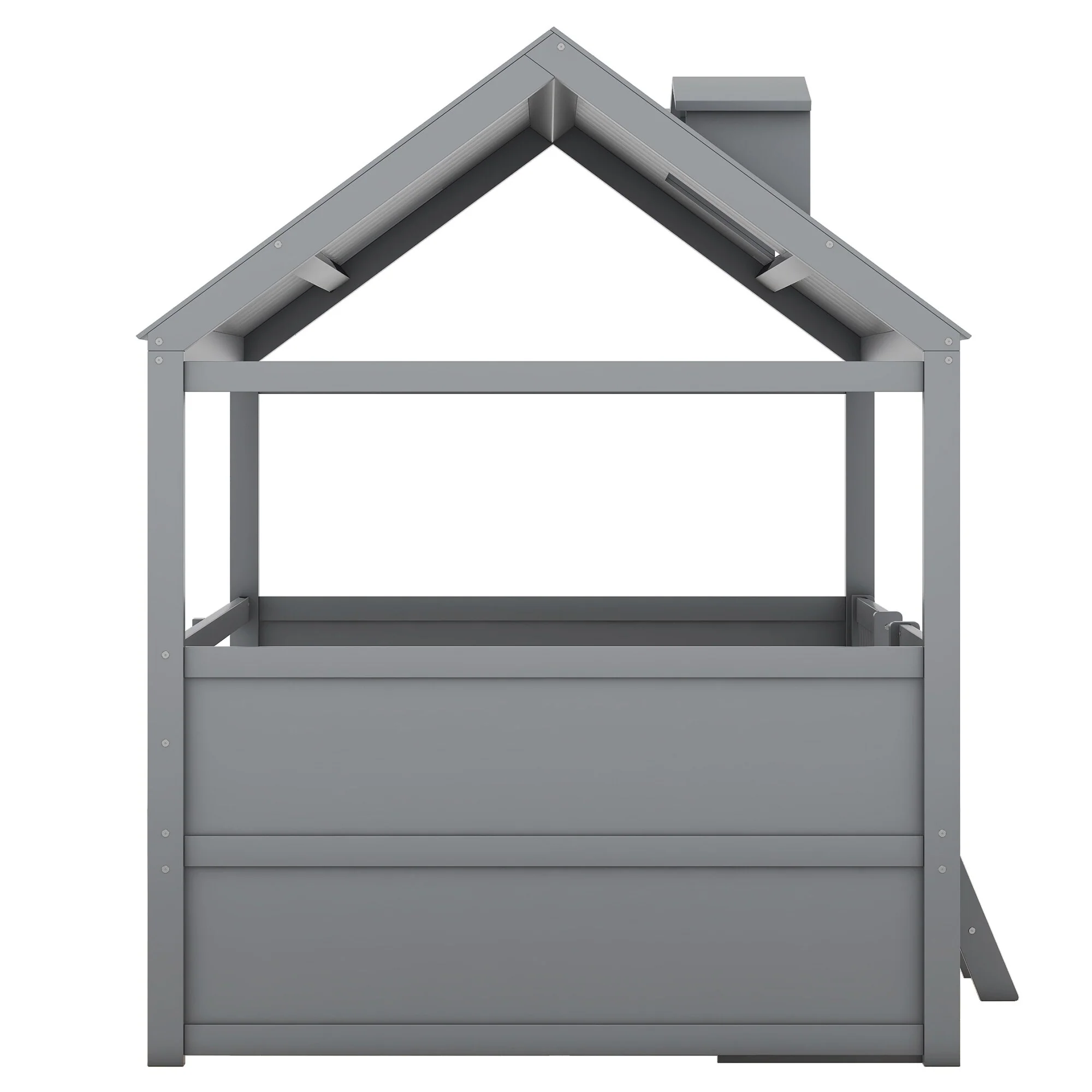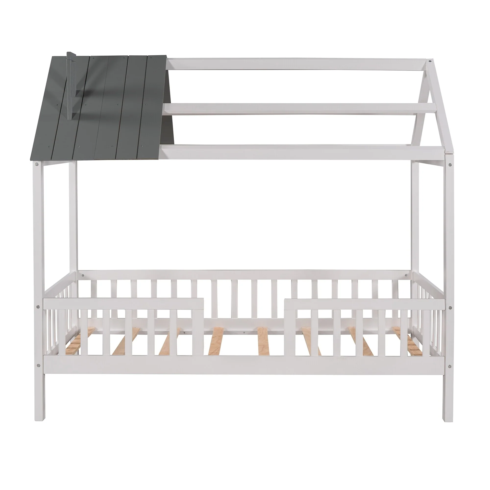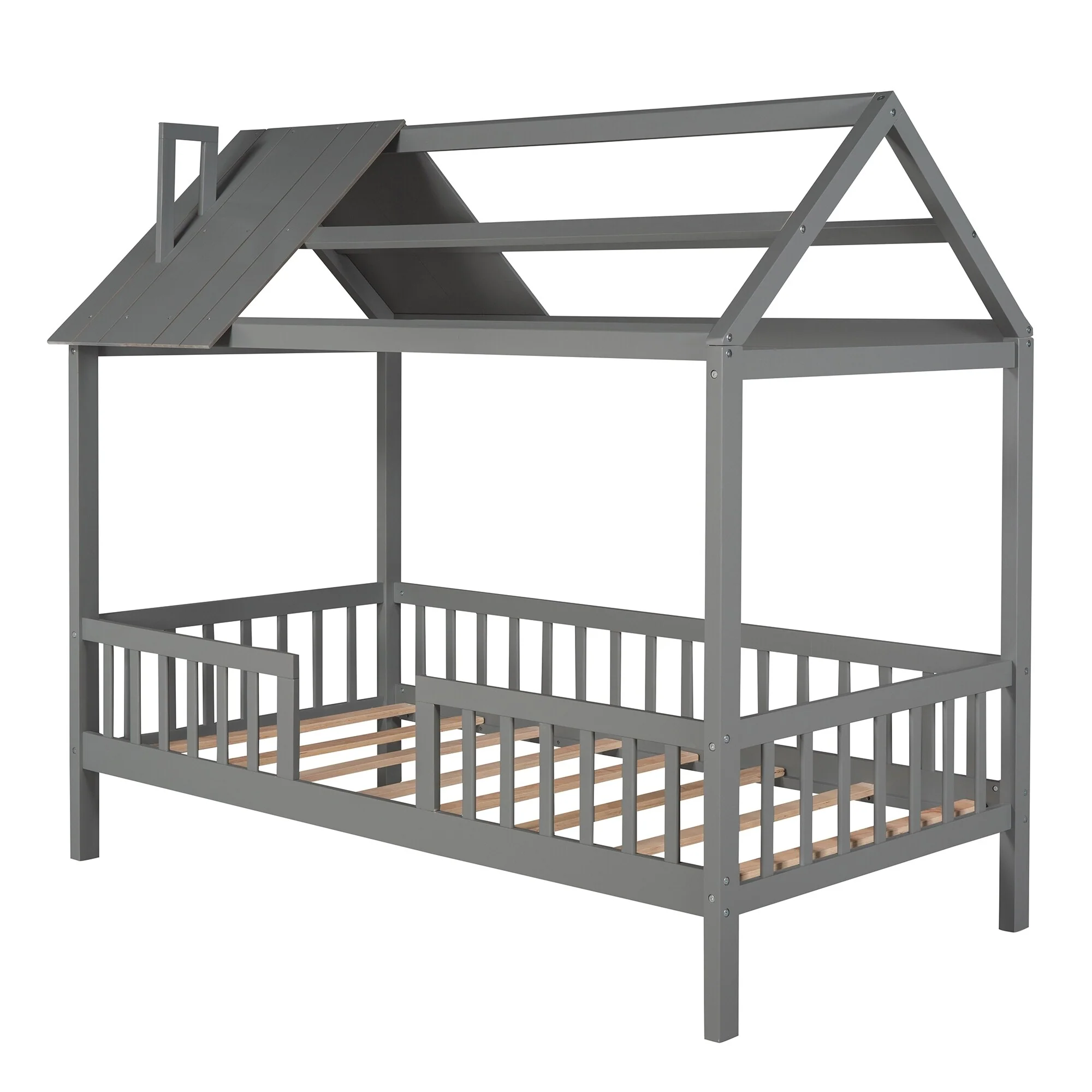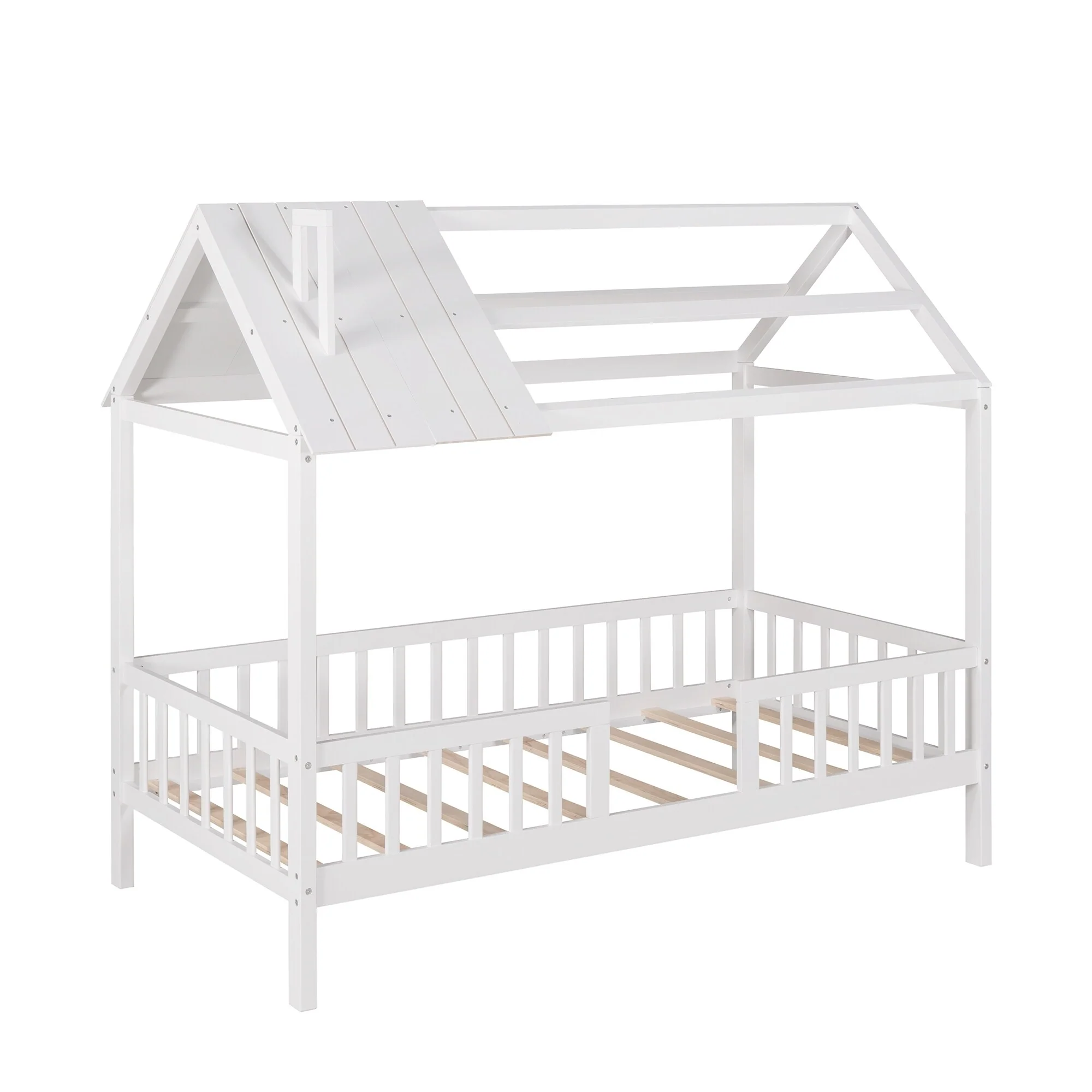 Twin Size House Bed with Fence, Semi-enclosed Play Platform Bed with Roof and Chimney Decoration, for Kids Bedroom