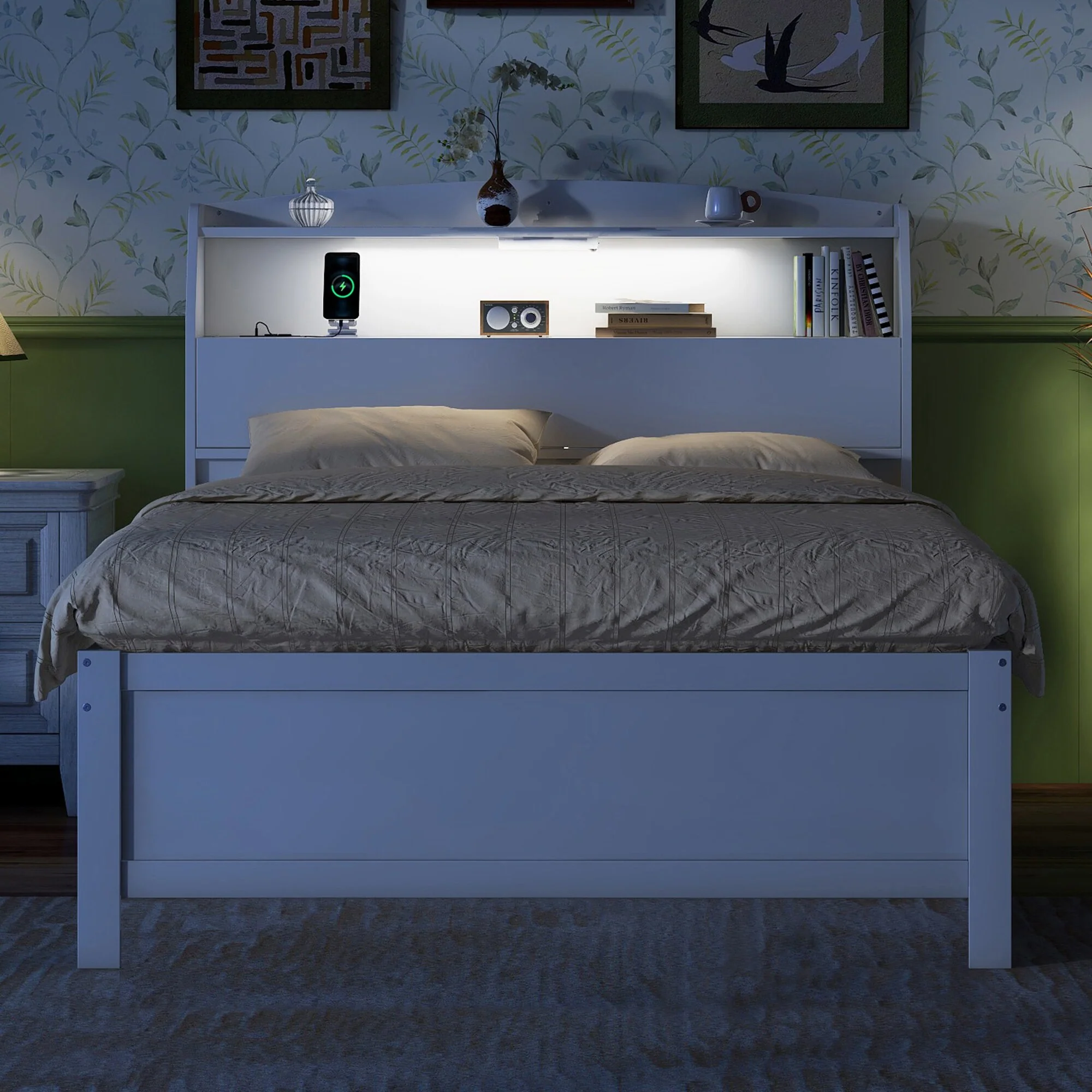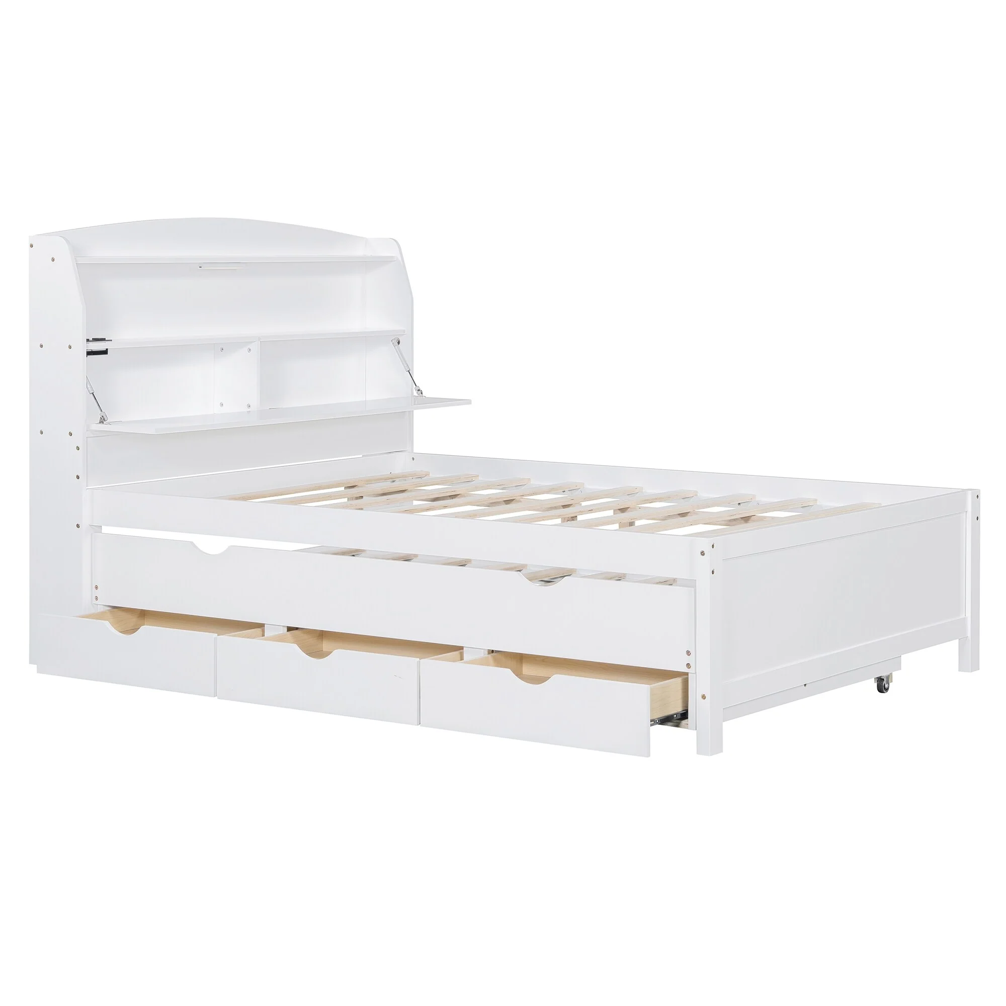 Full Size Wooden LED Platform Bed with Trundle & Storage Headboard with Drawers, White