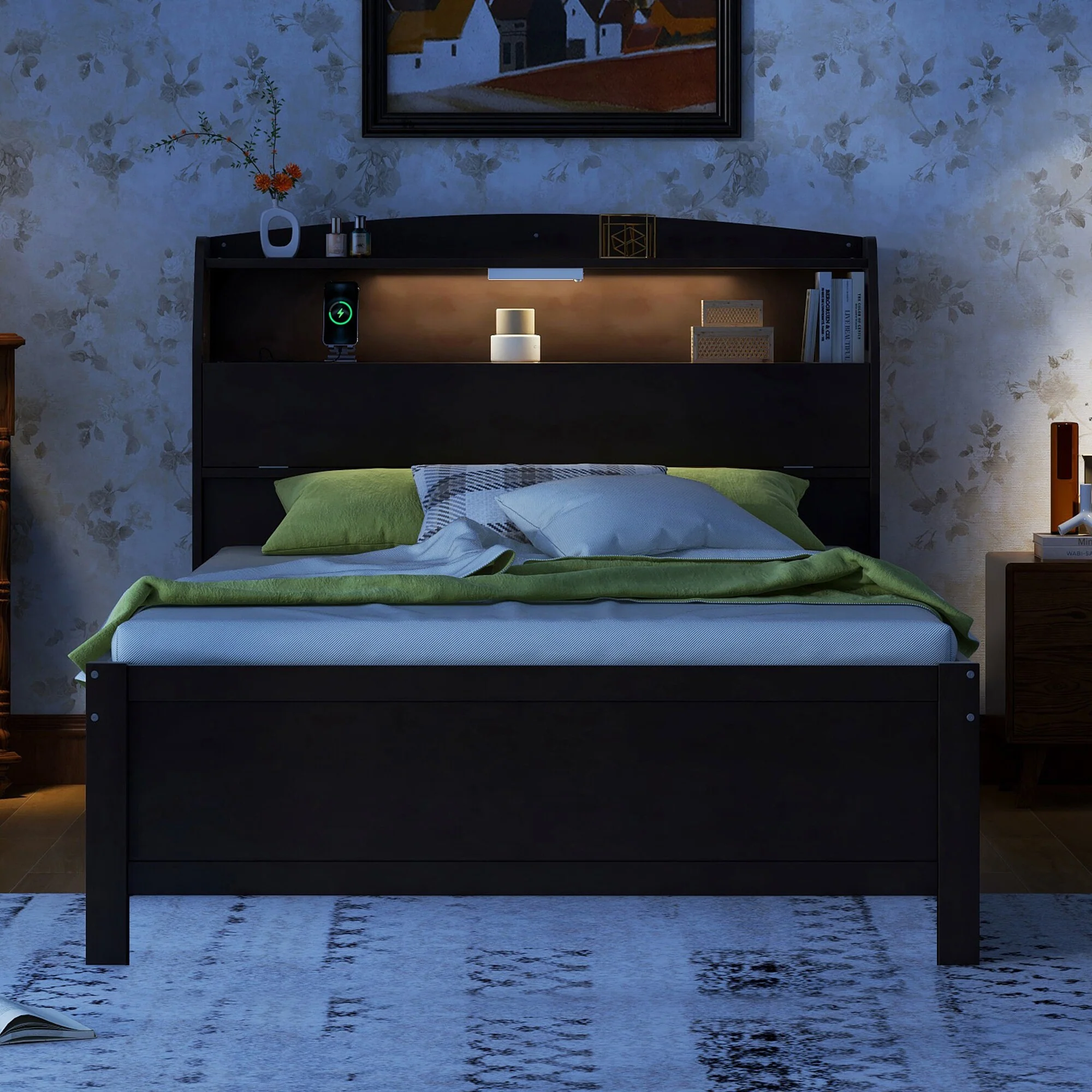 Queen Size Wood Storage Platform Bed with LED Light and Rattan Headboard