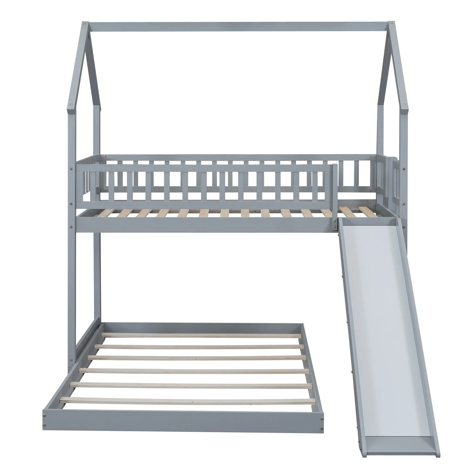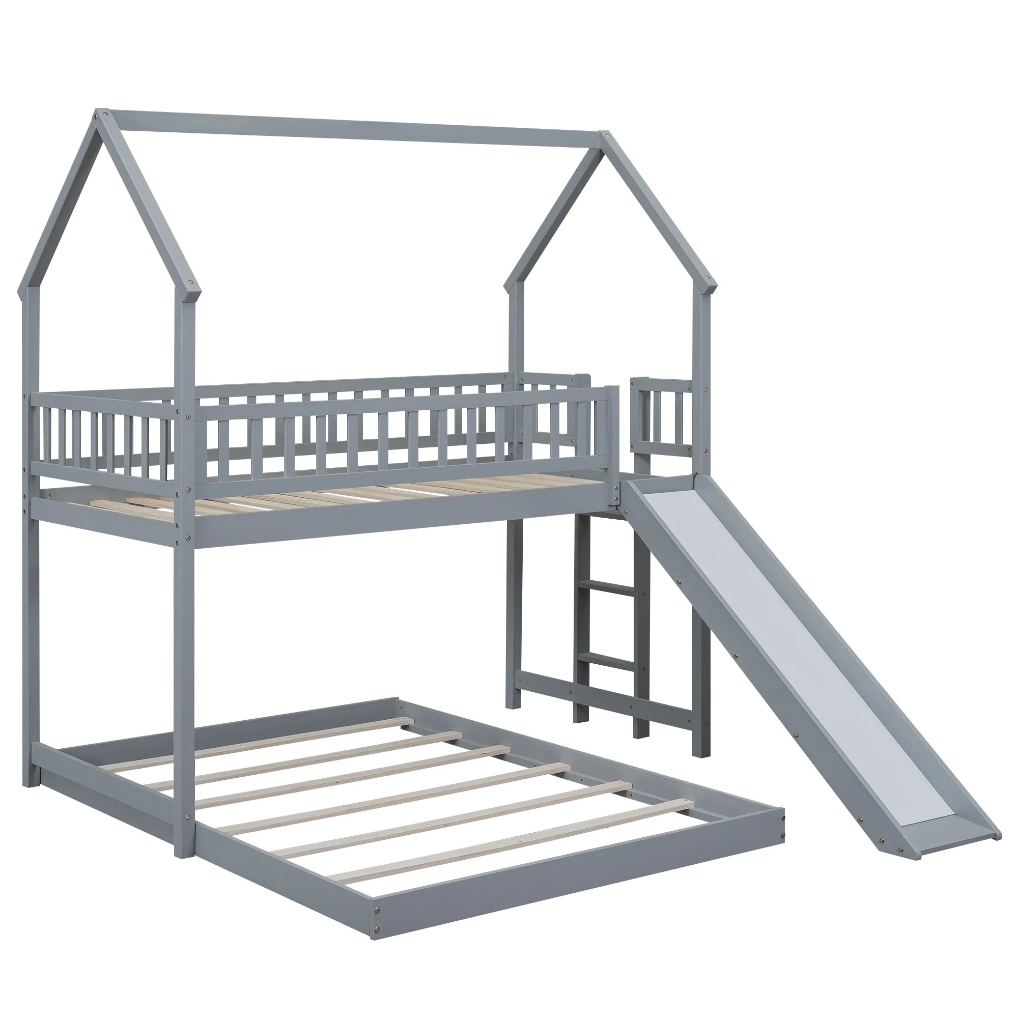 Kids' Grey Twin Floor Bed with Wooden House Roof Frame and Fence Guardrails