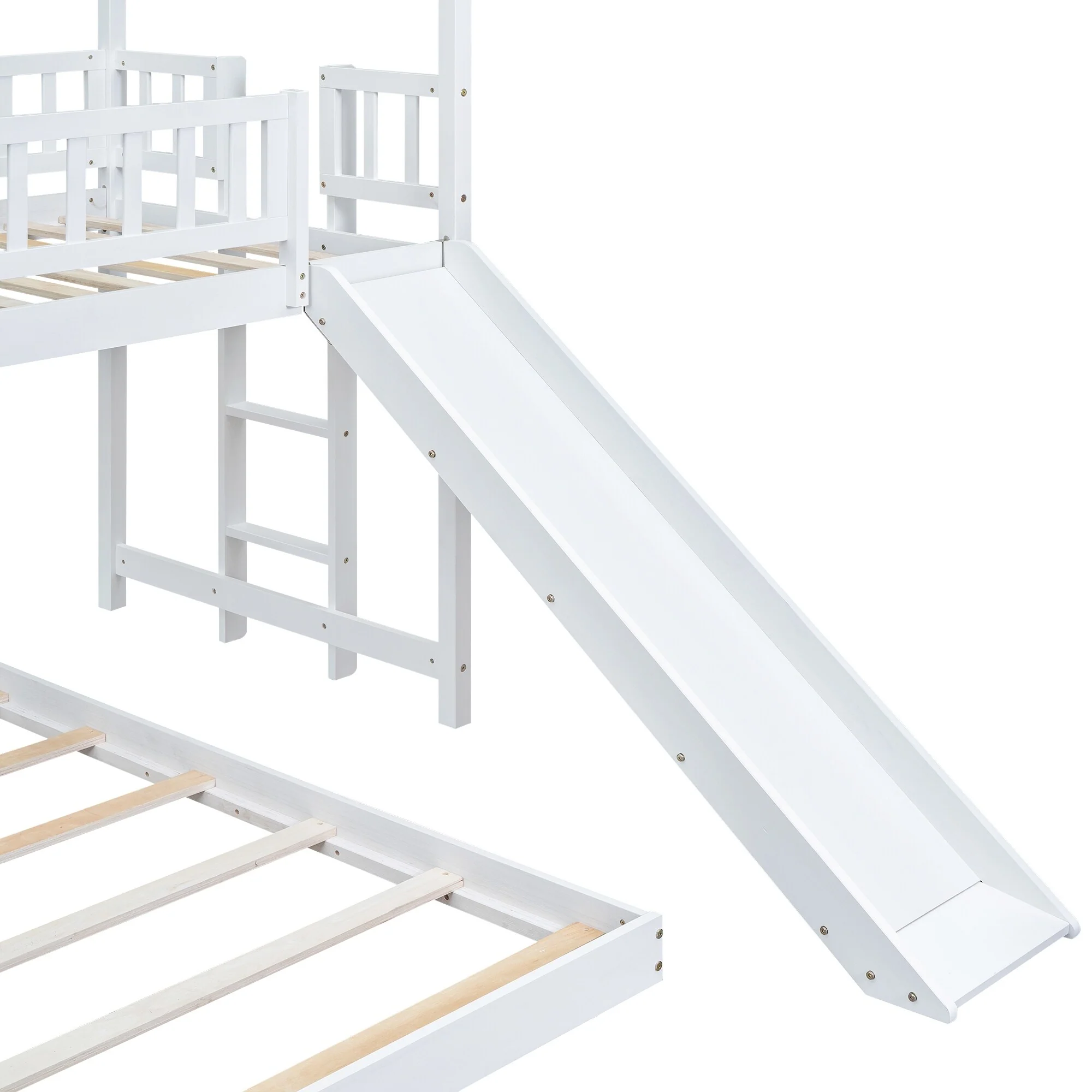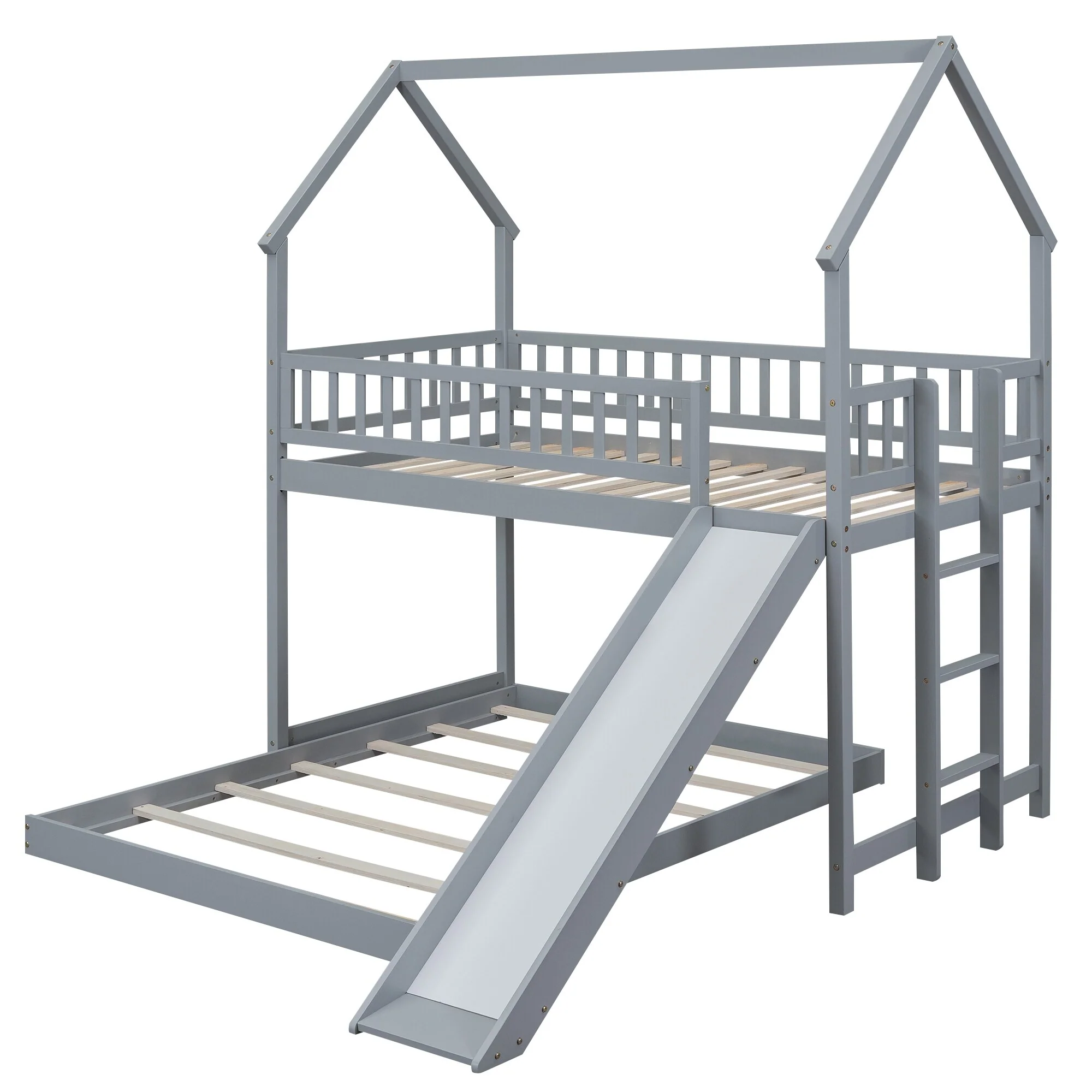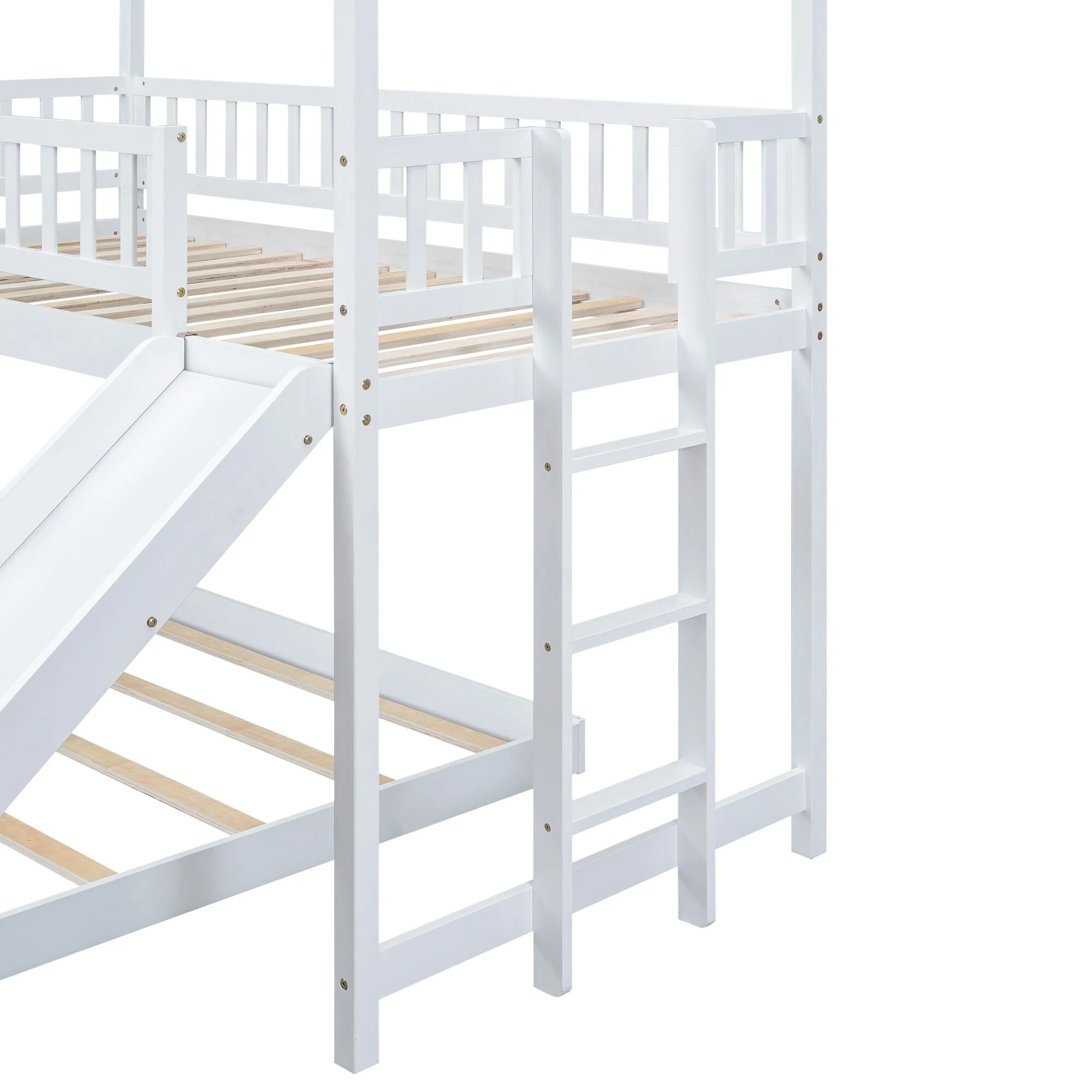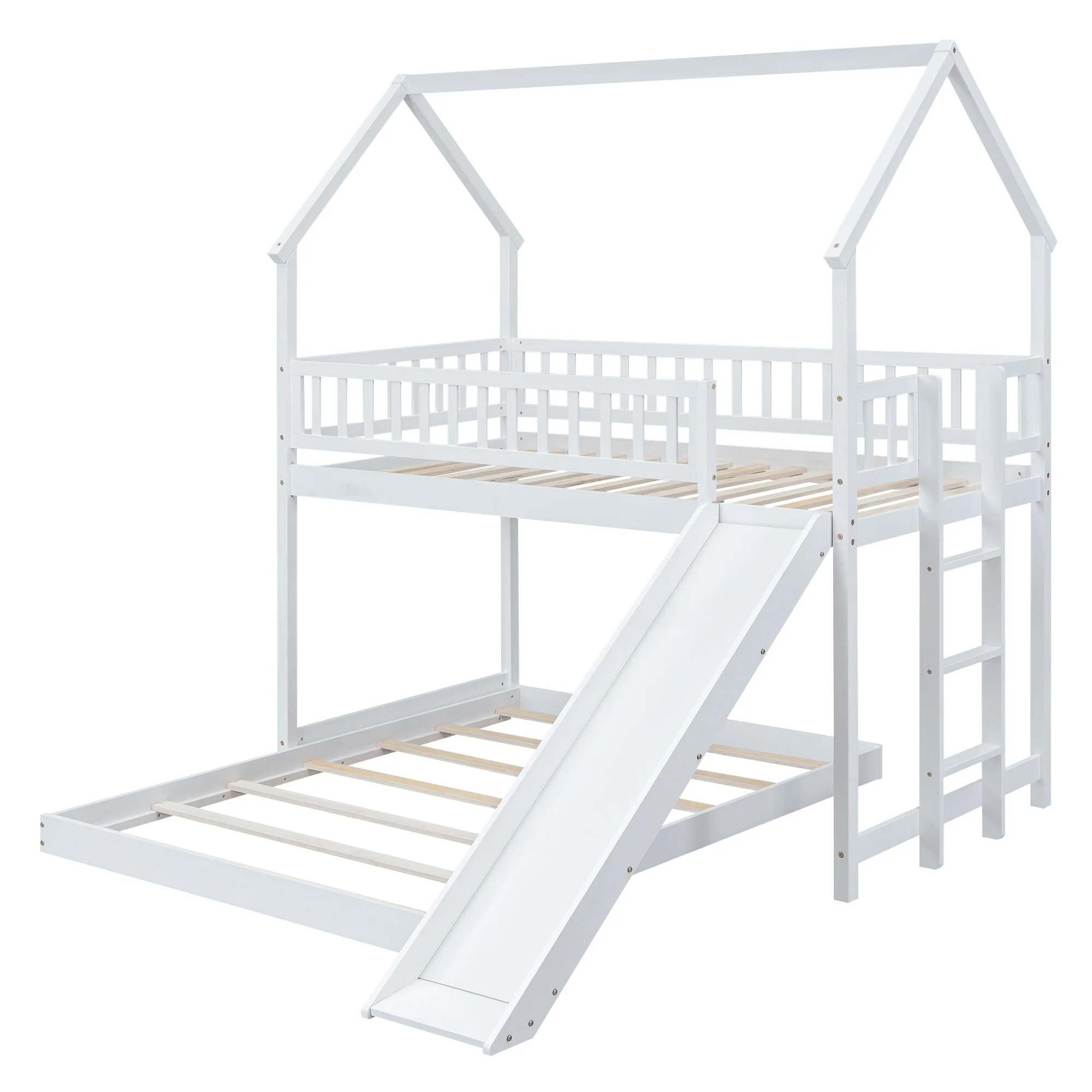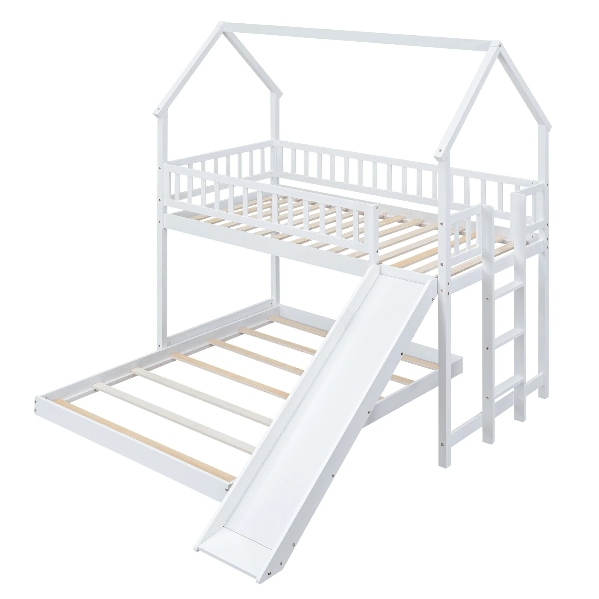 Kids' Twin Over Full Bunk Bed with Roof Design, Slide, and Built-in Ladder