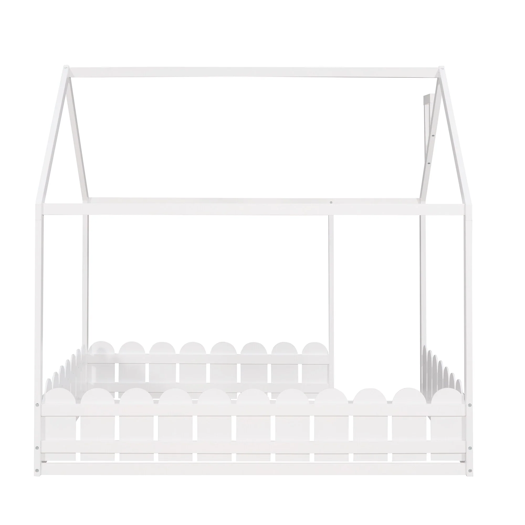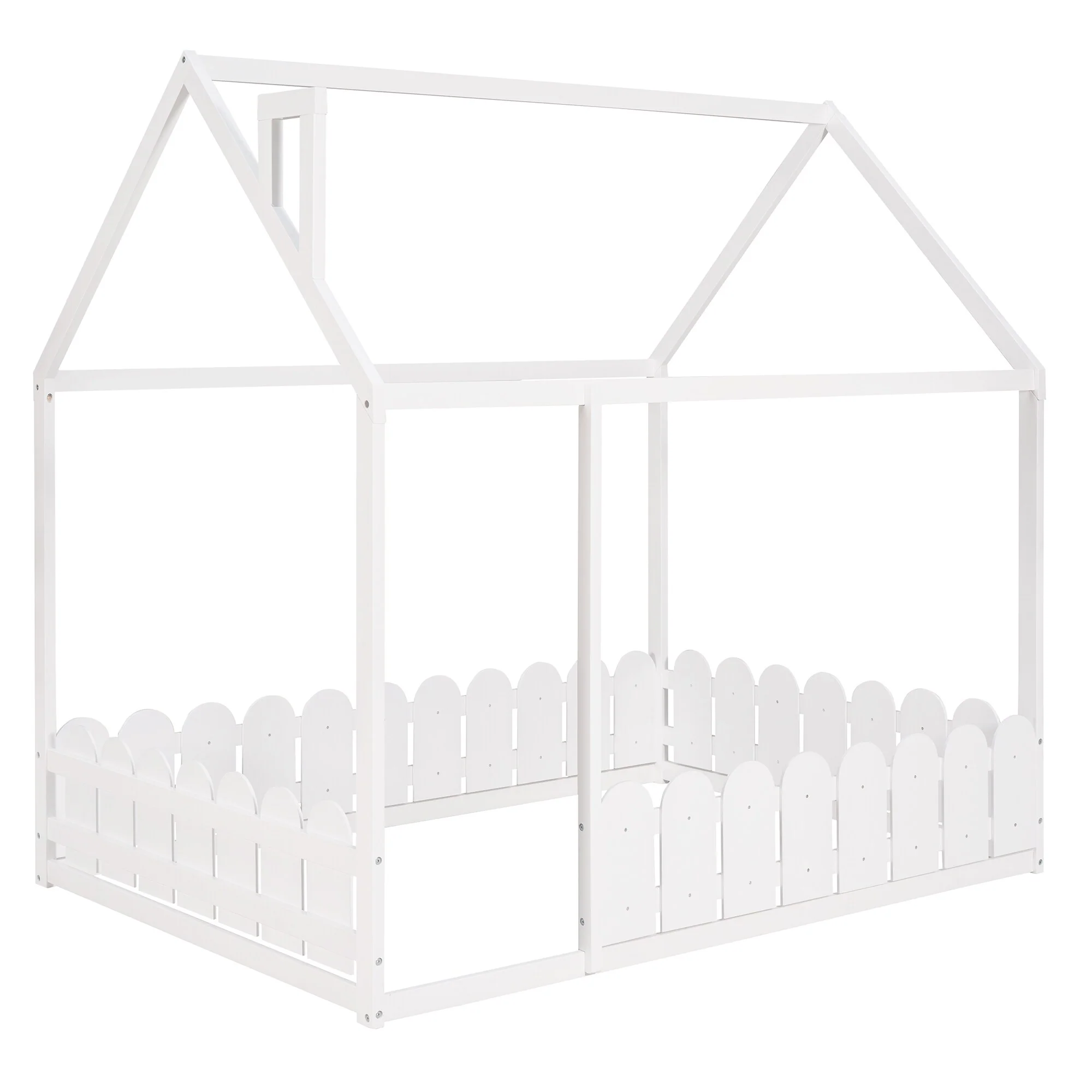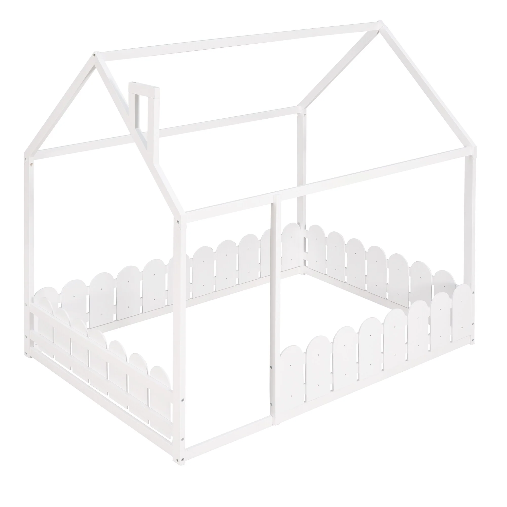 Elegant Queen Size Floor Bed with Fence and Door, Pine Wood Frame for Kids or Play Space