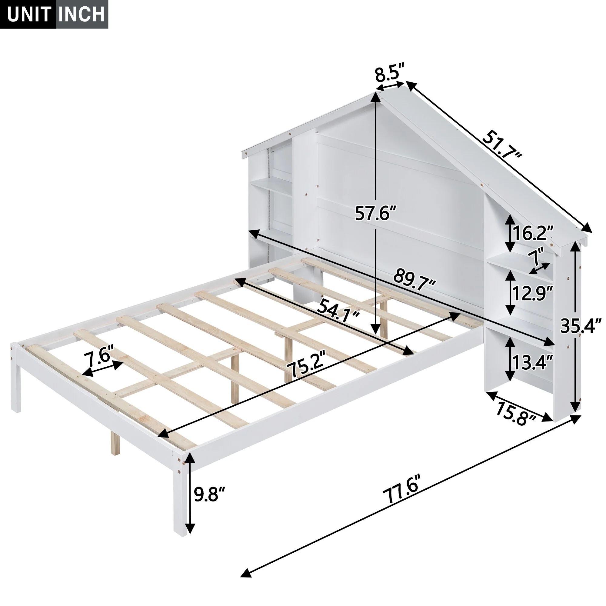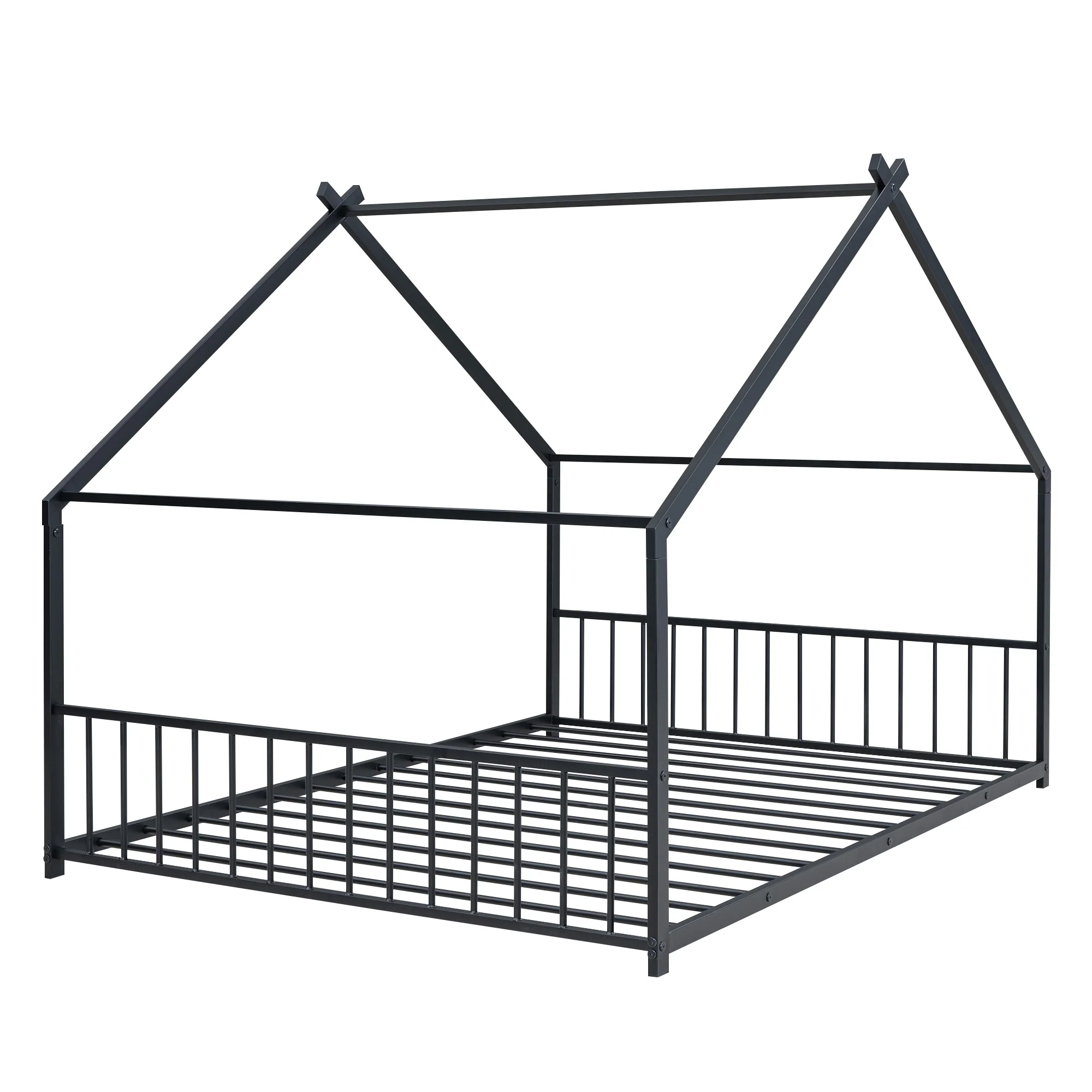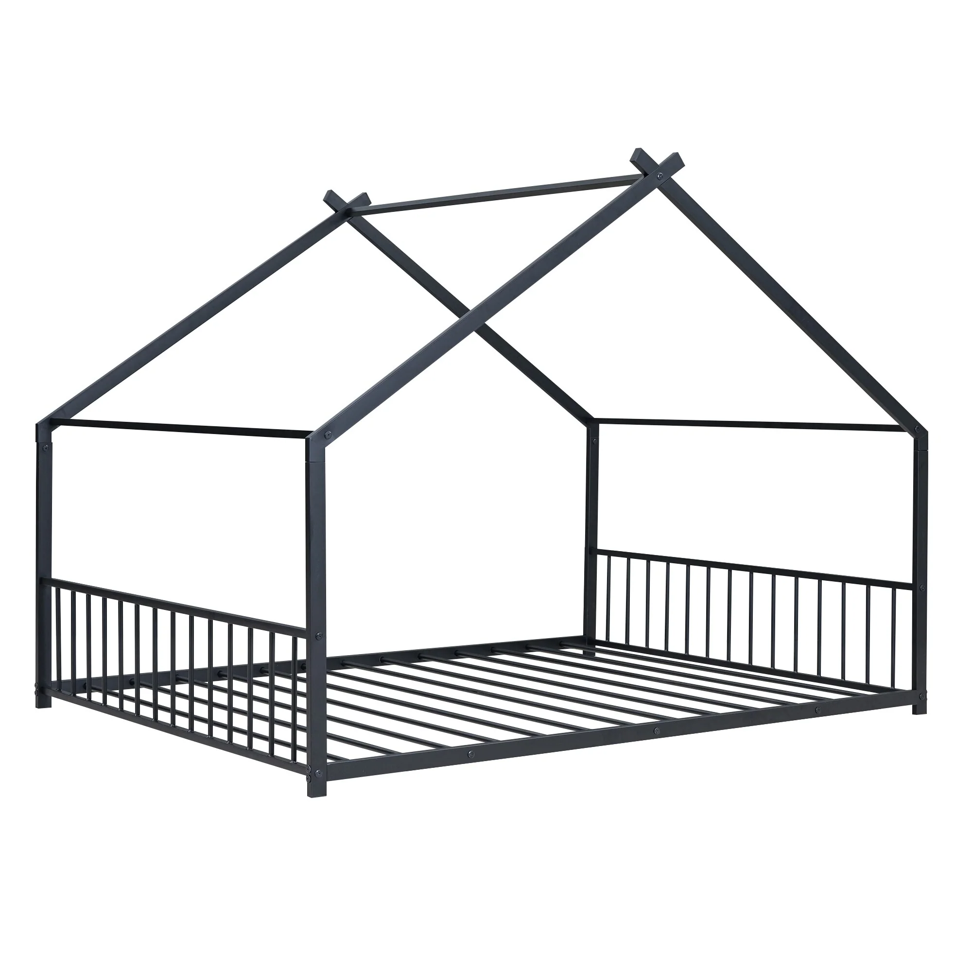 Kids Full Size Playhouse Bed with Roof, Metal Frame and Slats for Safe Sleeping