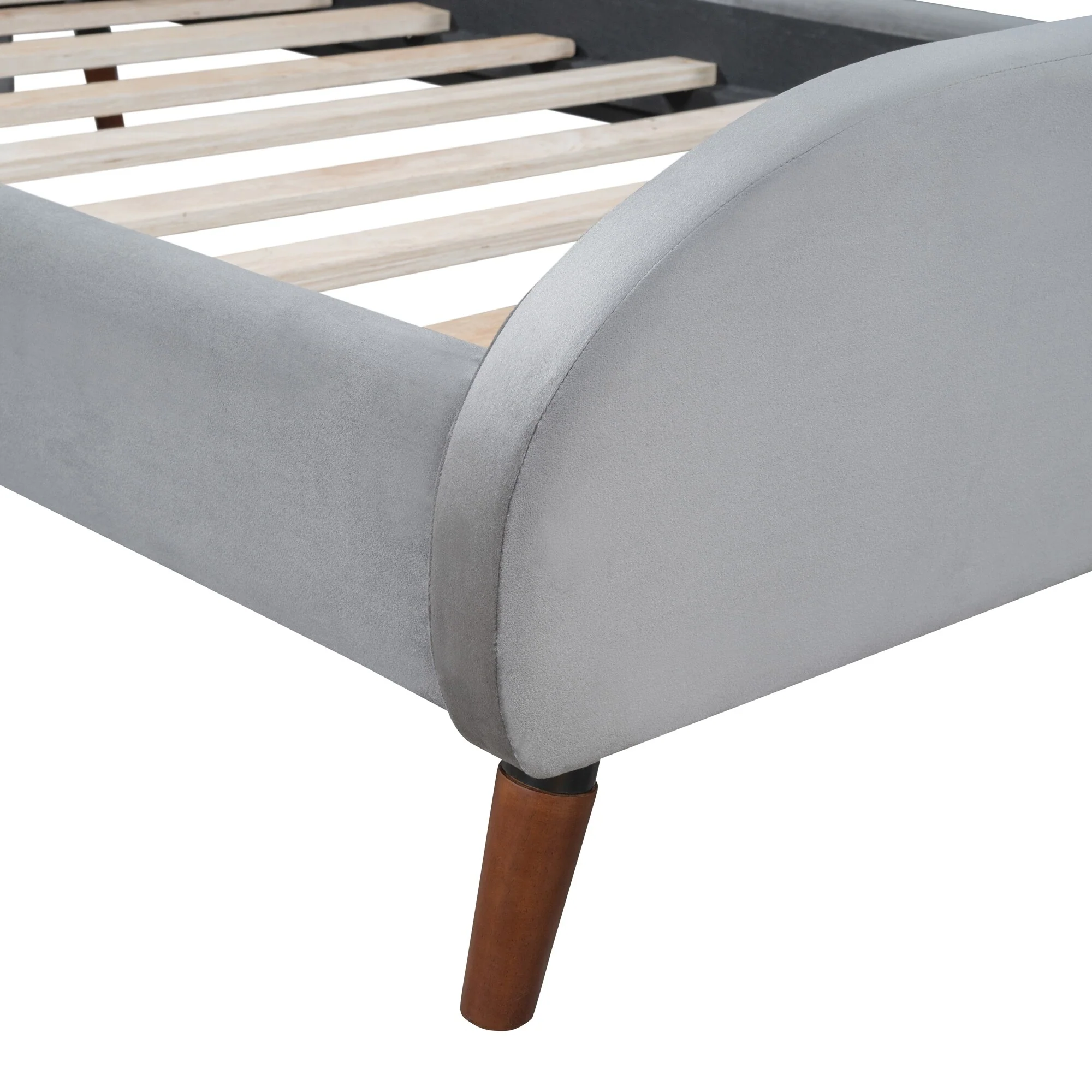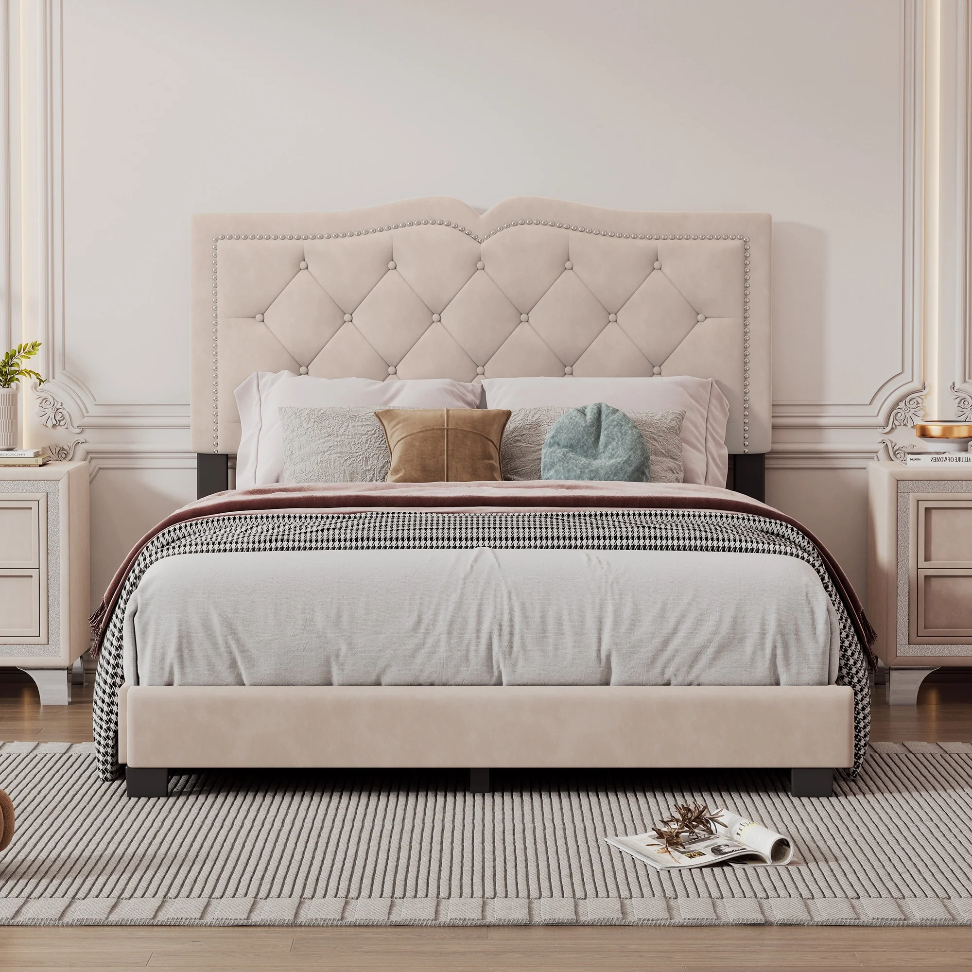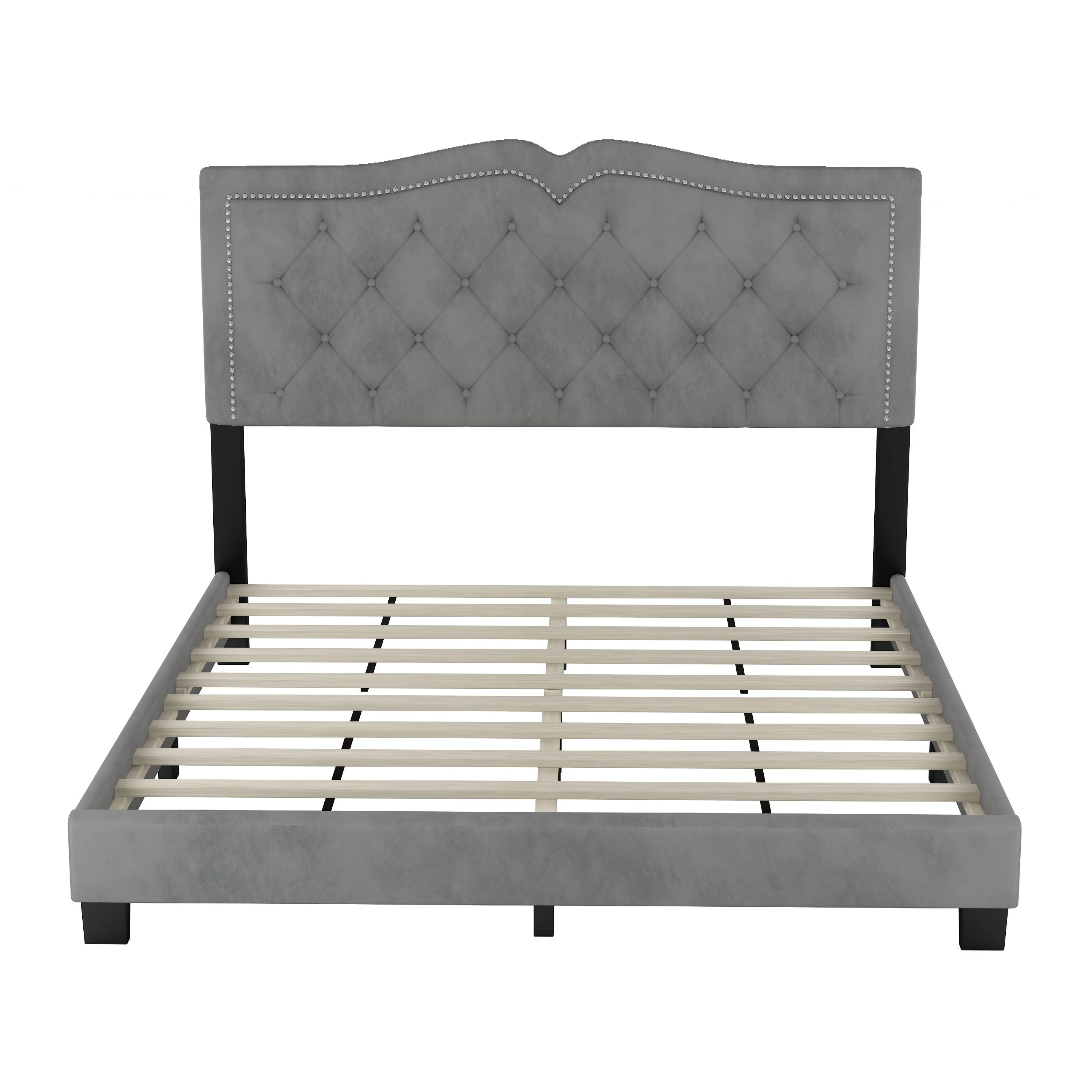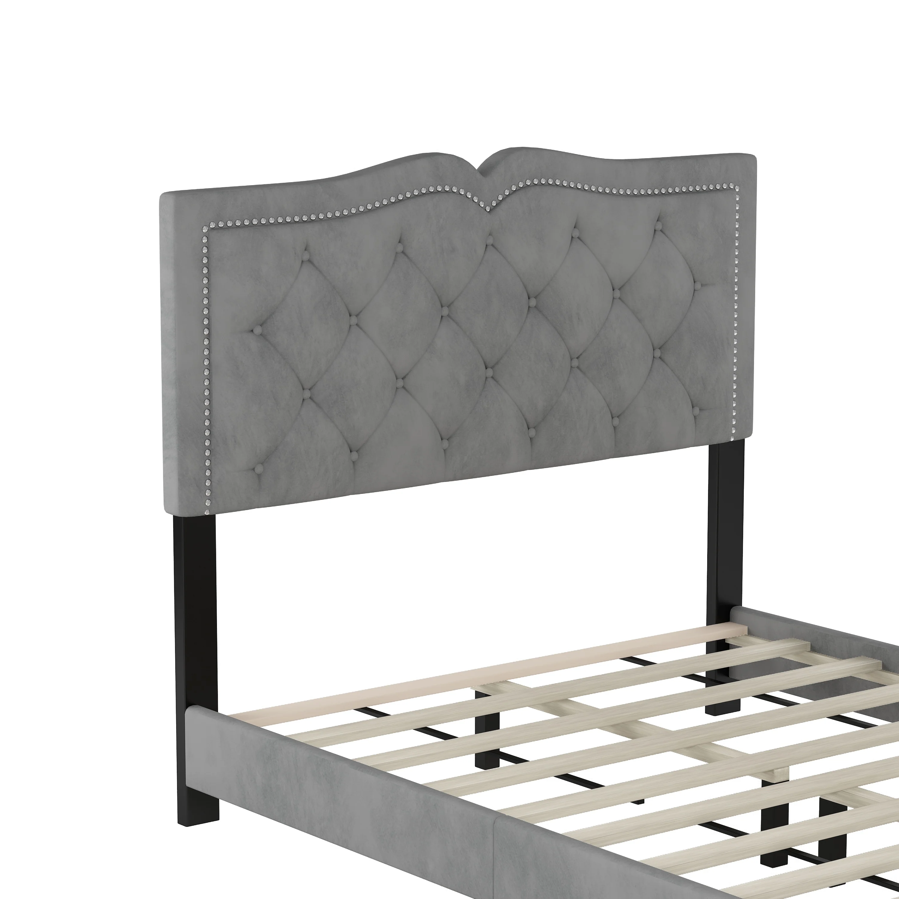 Queen Size Velvet Platform Bed with Tufted Headboard and Rivet Design
