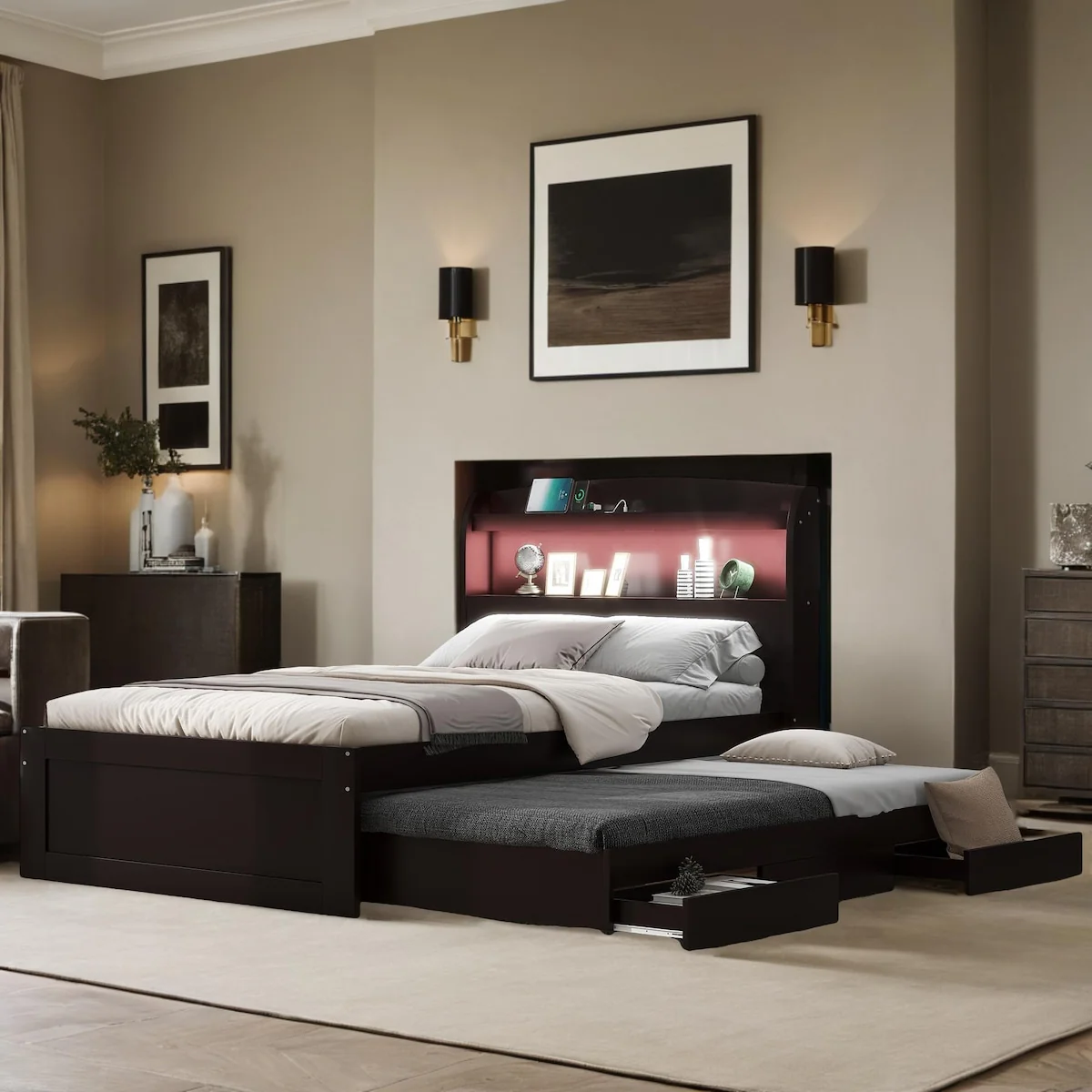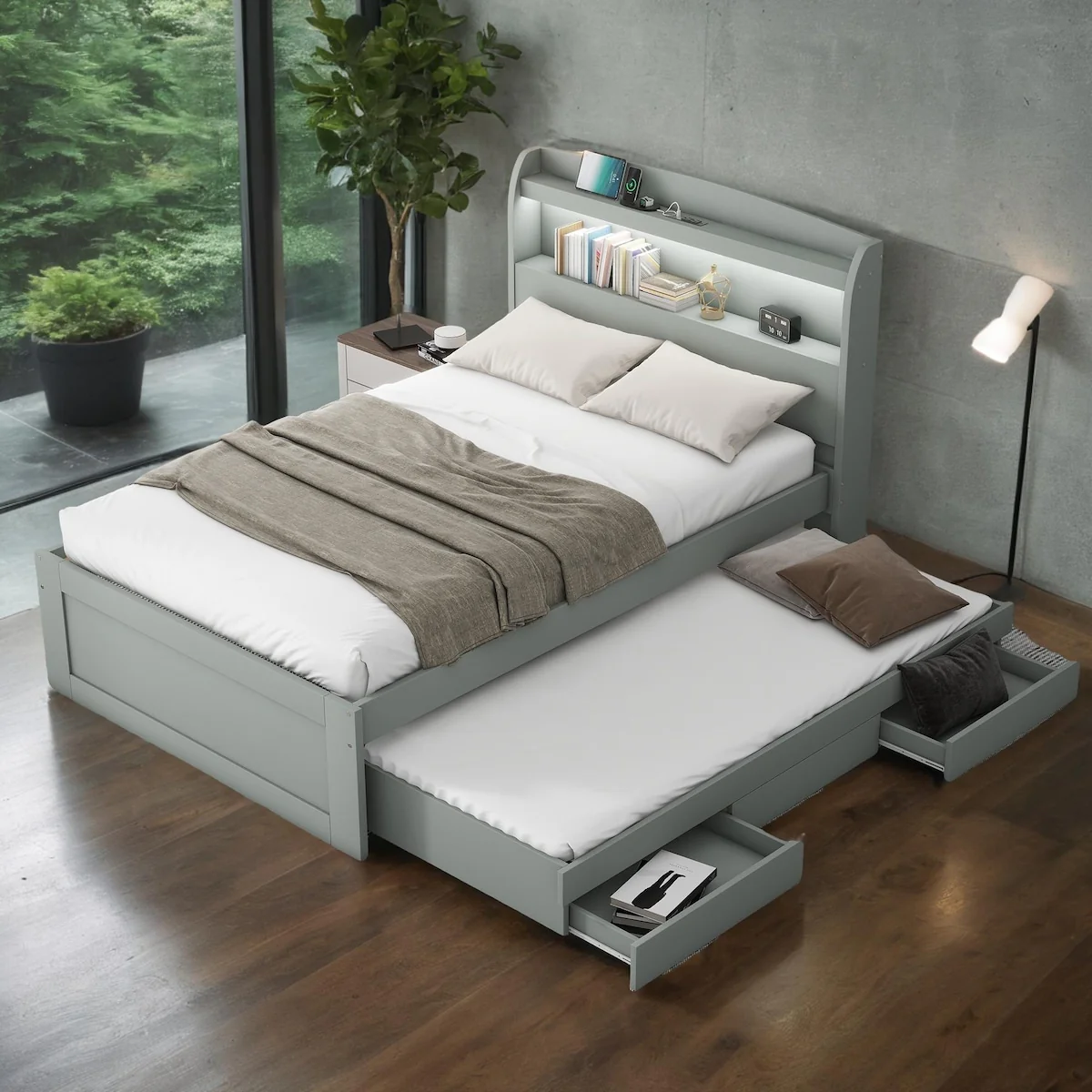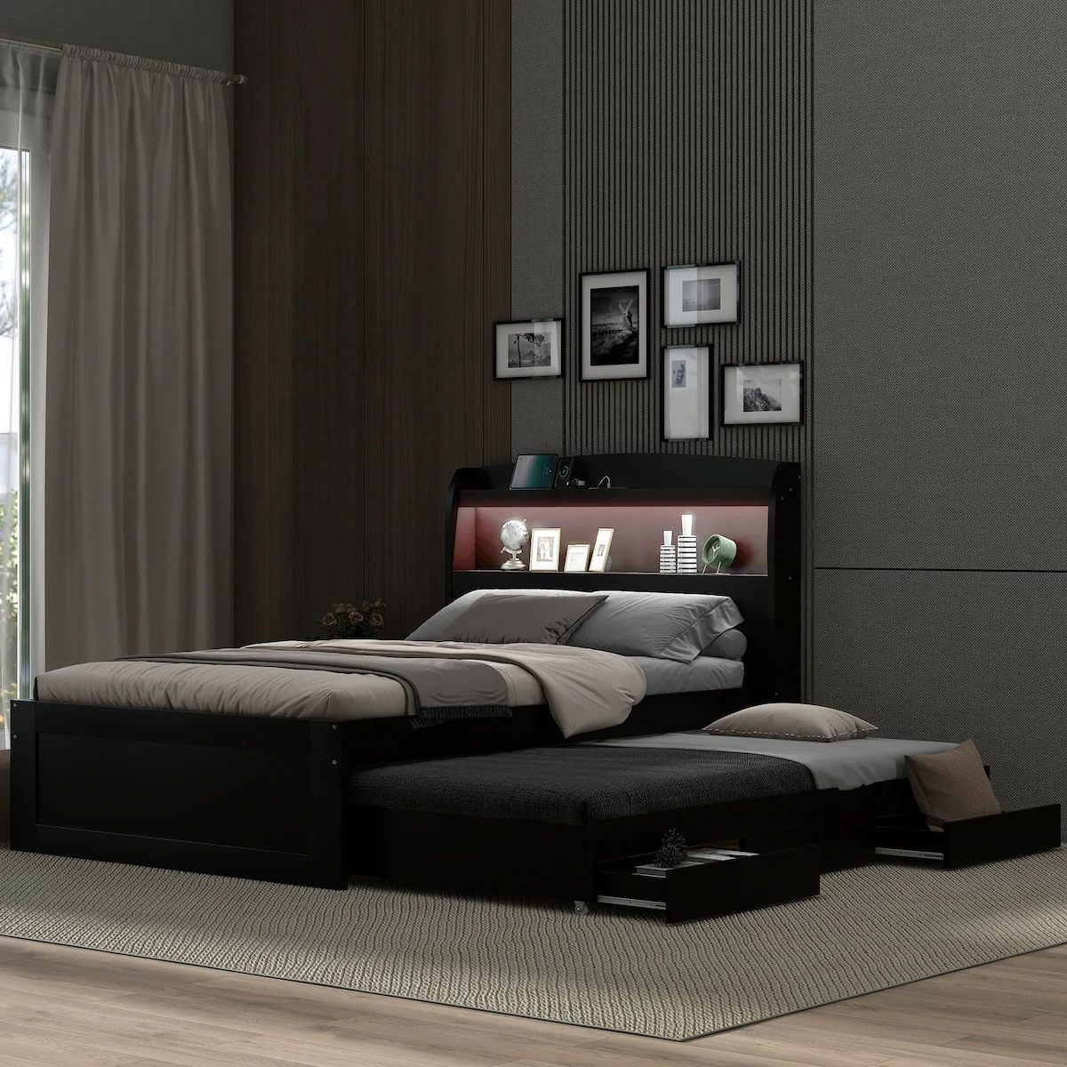Queen Upholstered Bed with Storage and Twin Trundle for Extra Sleeping Space