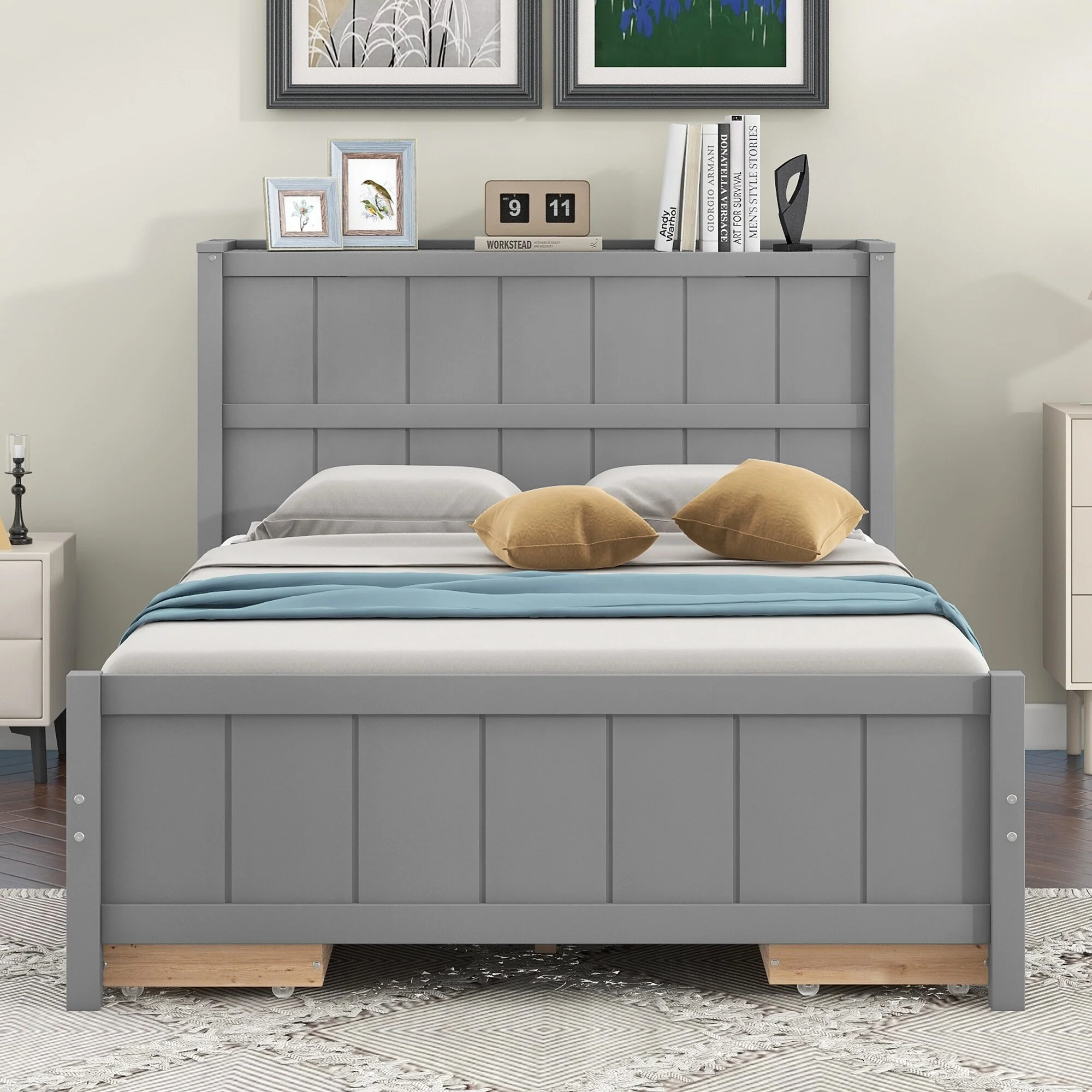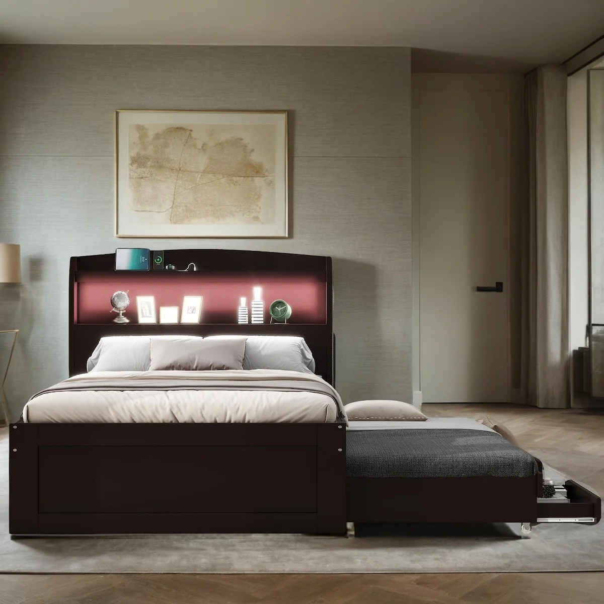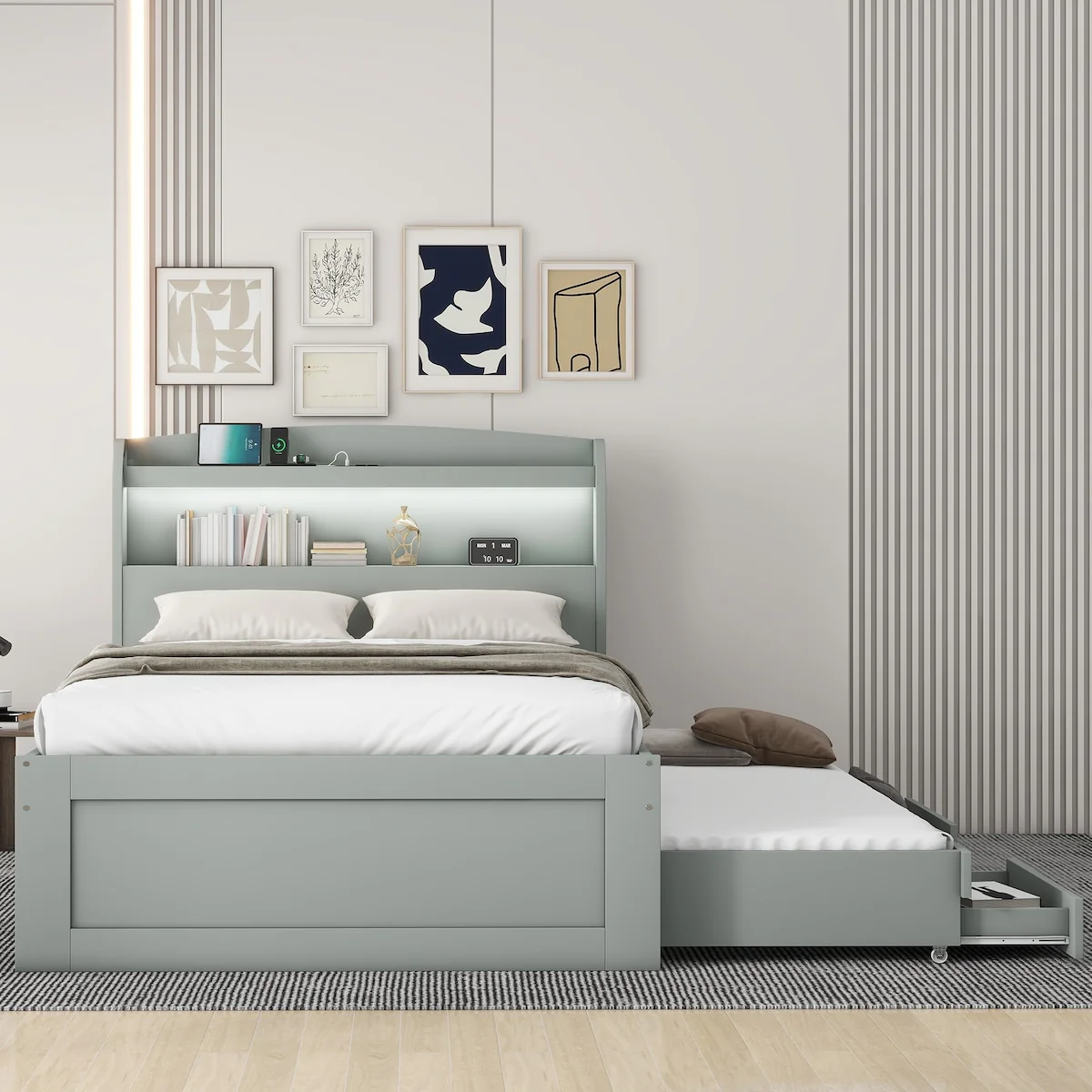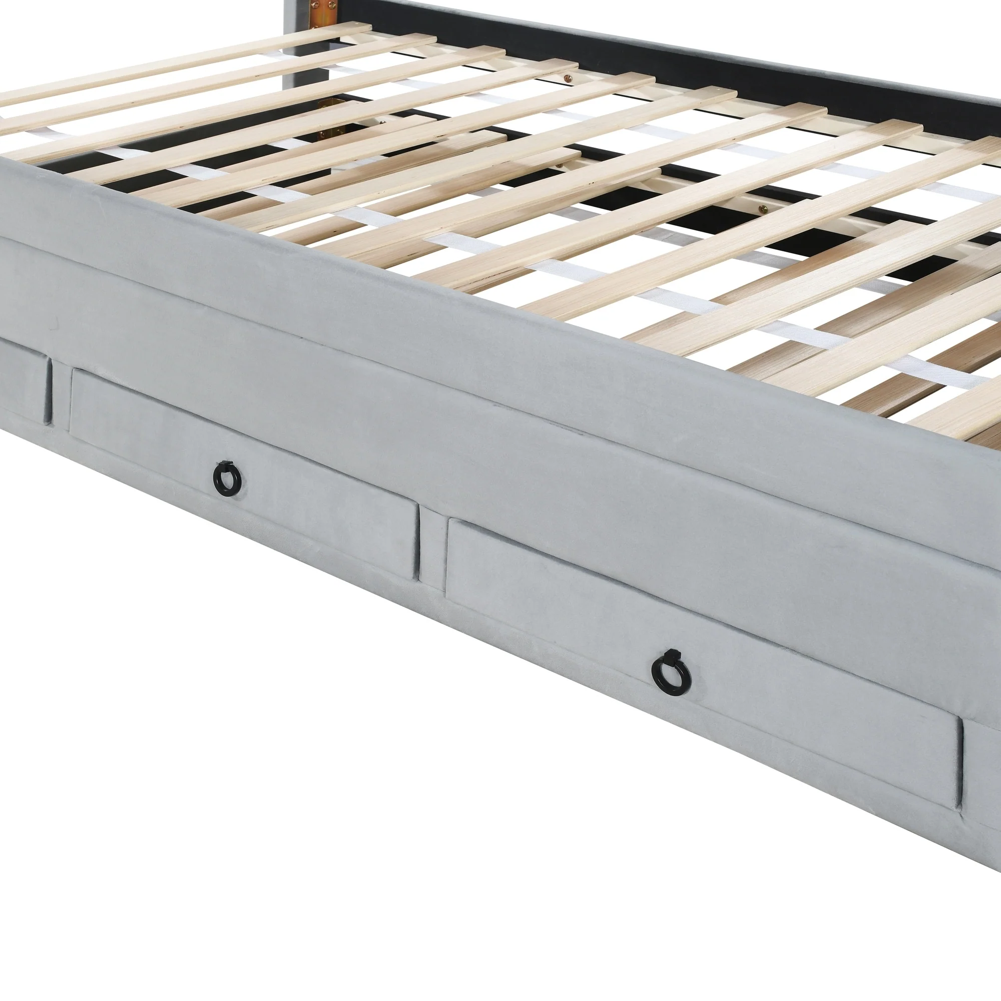 Queen Upholstered Bed with Storage and Twin Trundle for Extra Sleeping Space