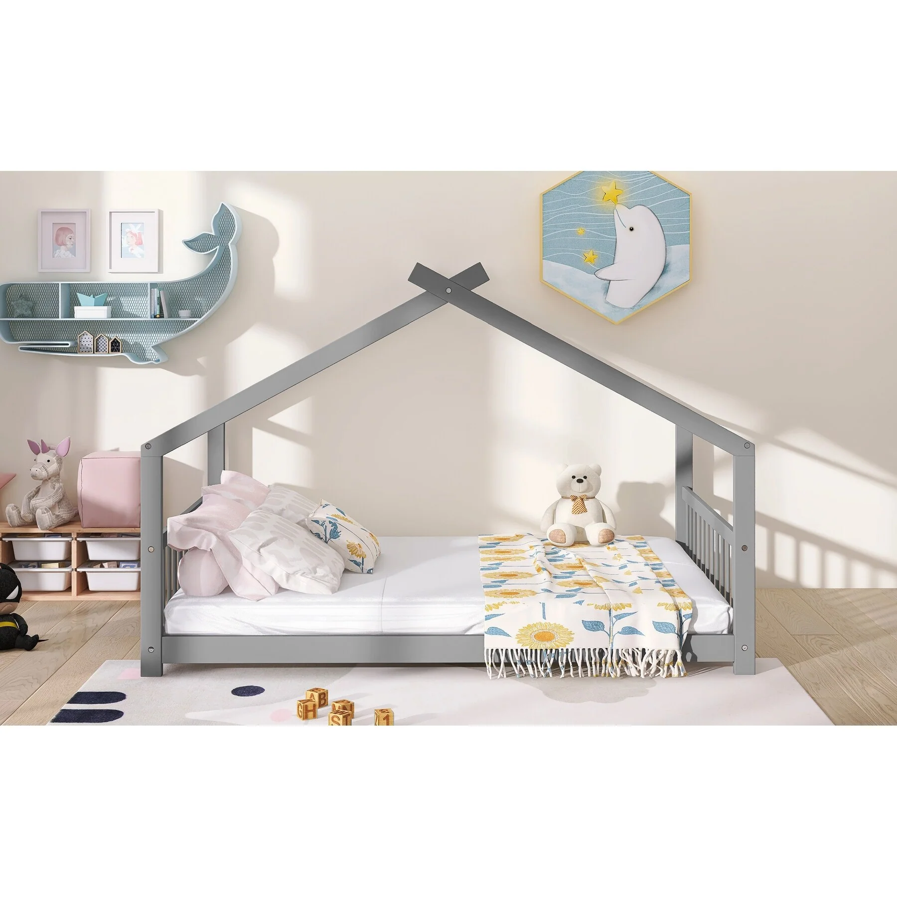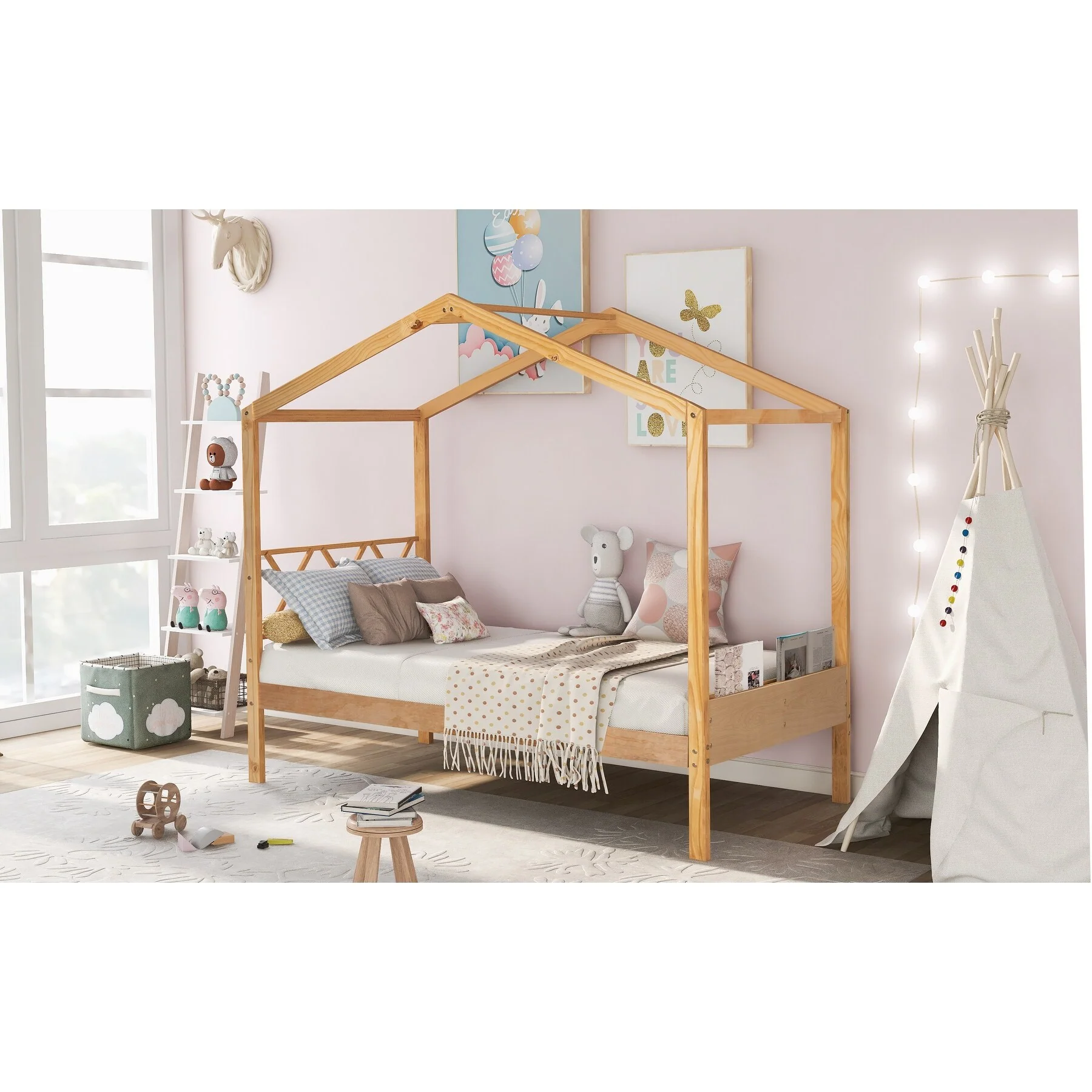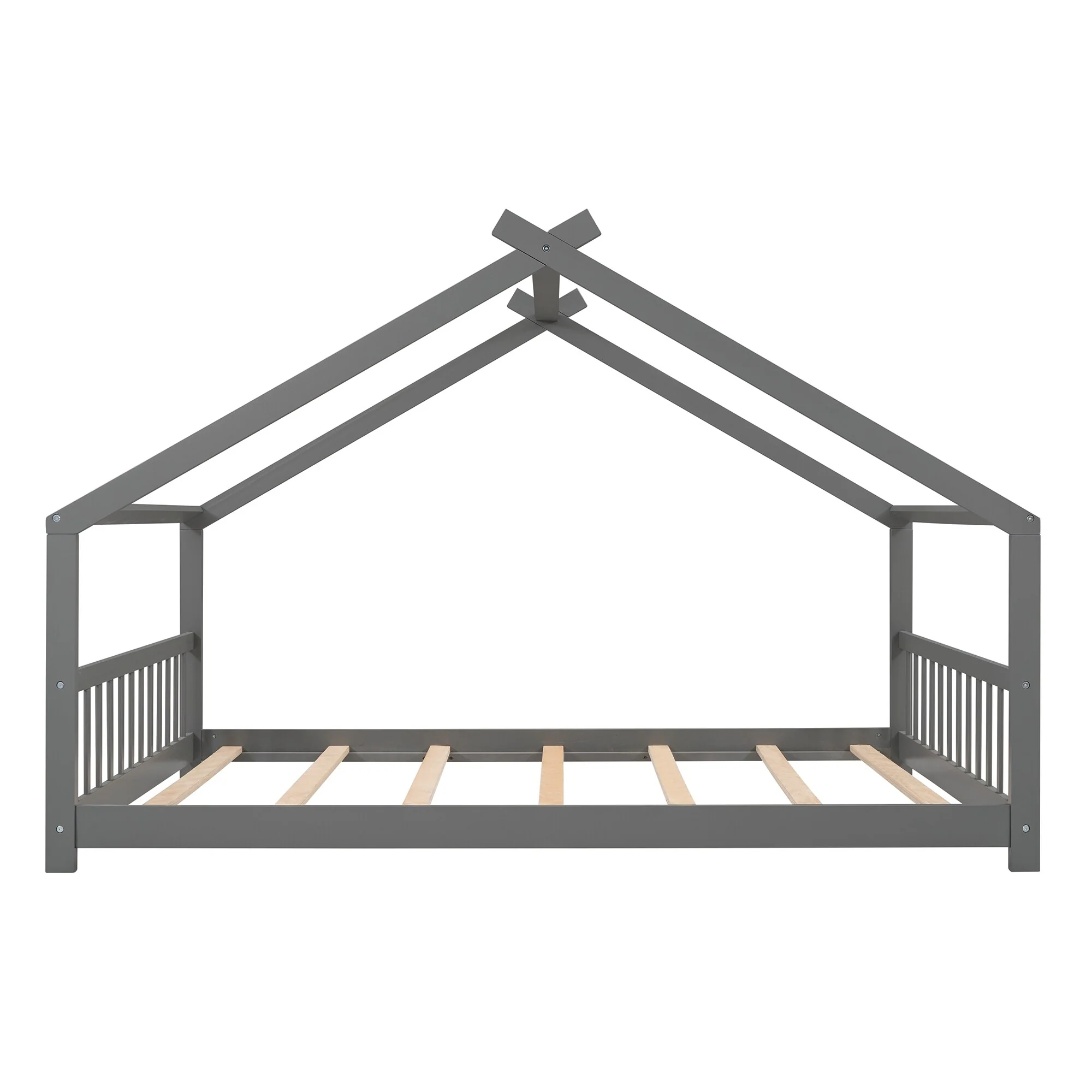 Kids Twin House Bed with Low Platform and Sturdy Pine Frame