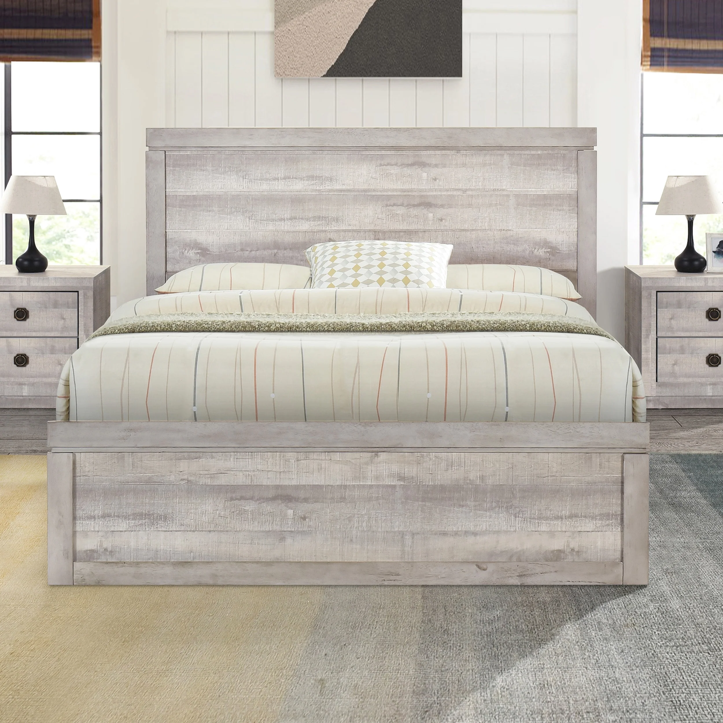 Full Size Wood Platform Bed with Rattan Headboard, Footboard, and 2 Storage Drawers
