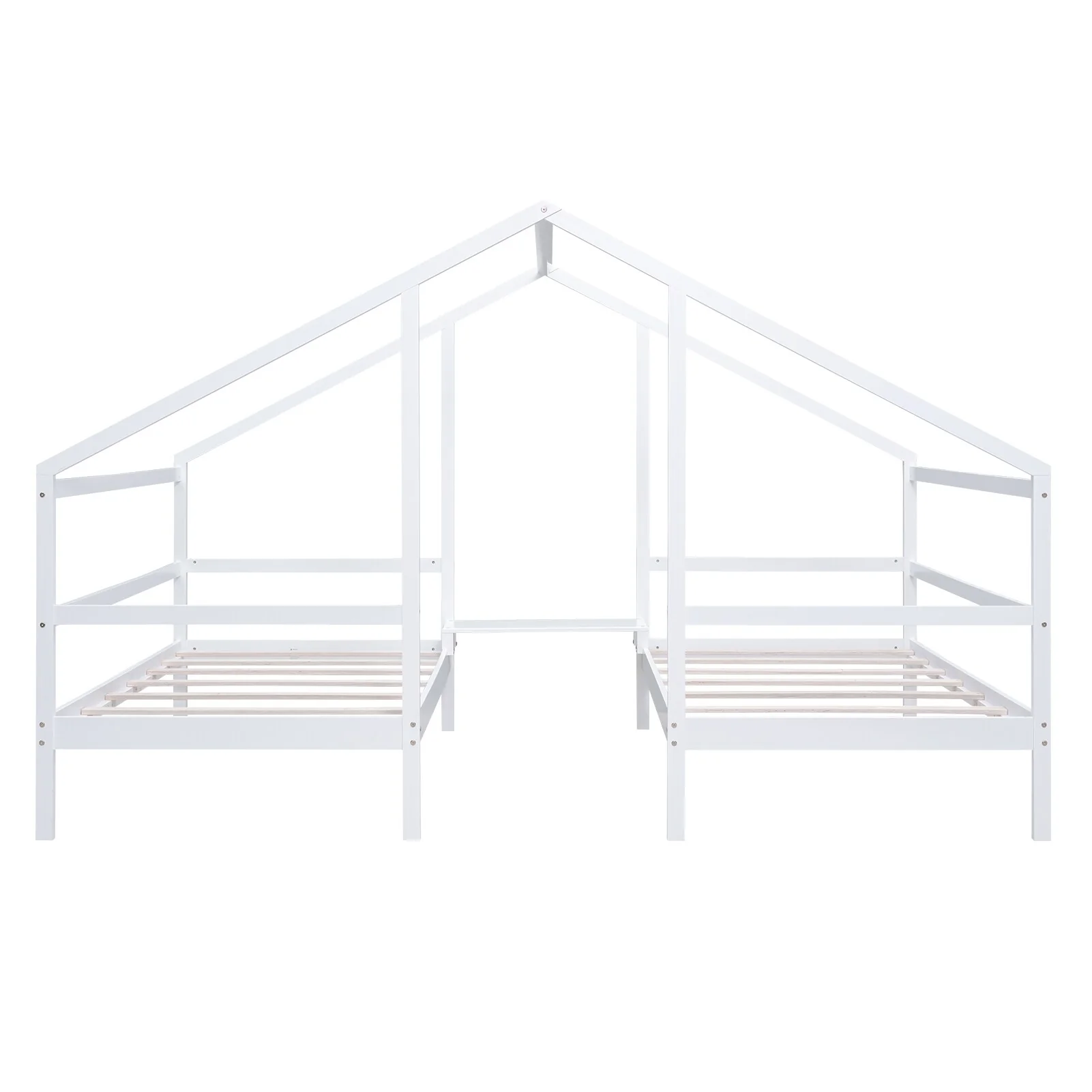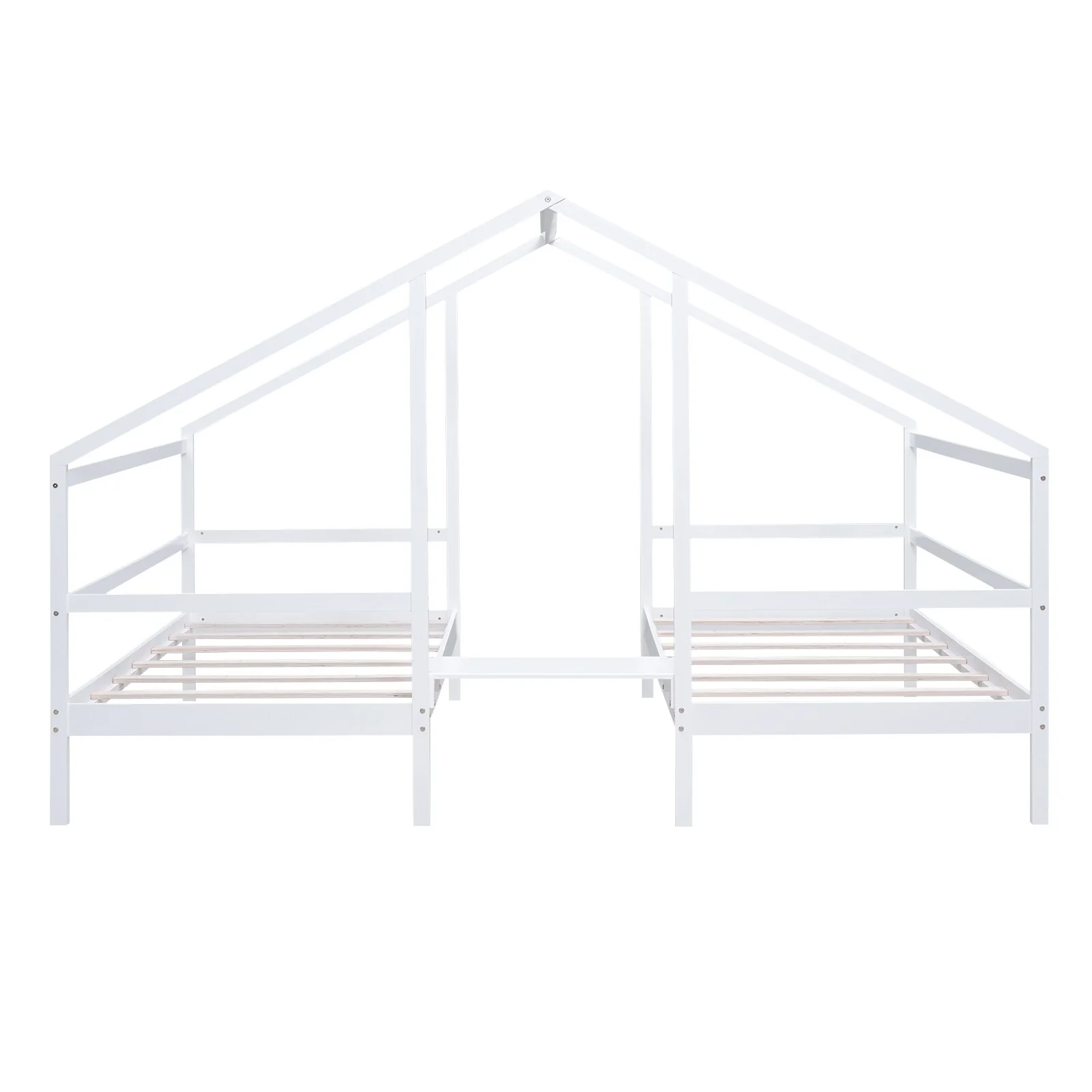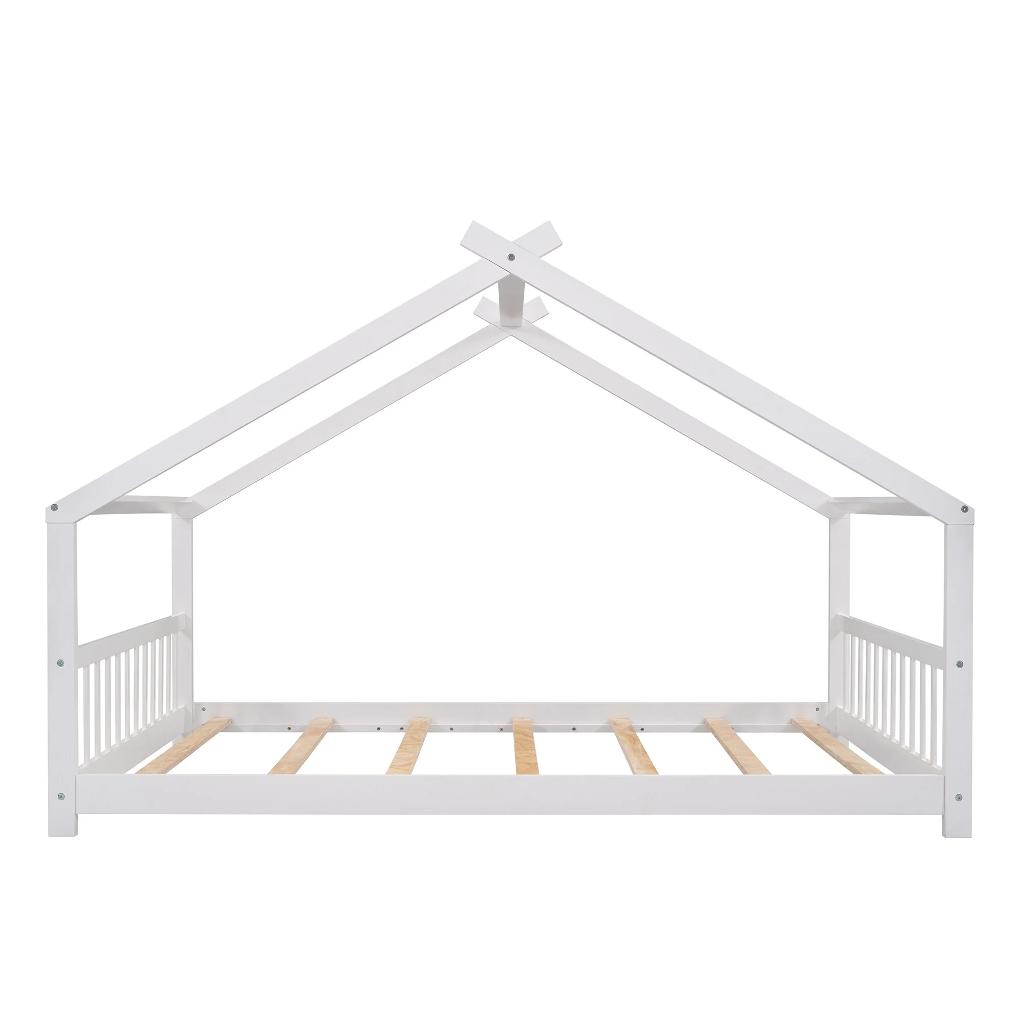 White Twin Floor Bed with House-Style Roof and Safety Fence Guardrails