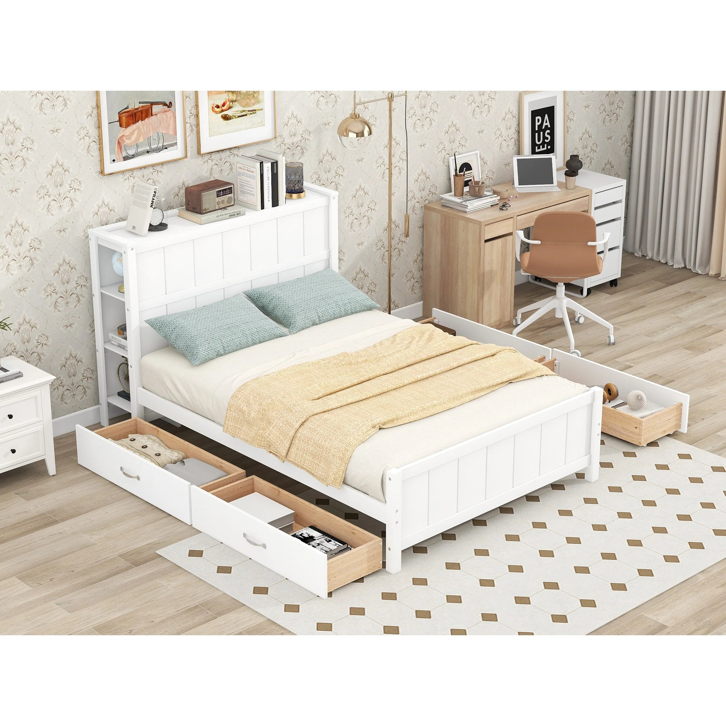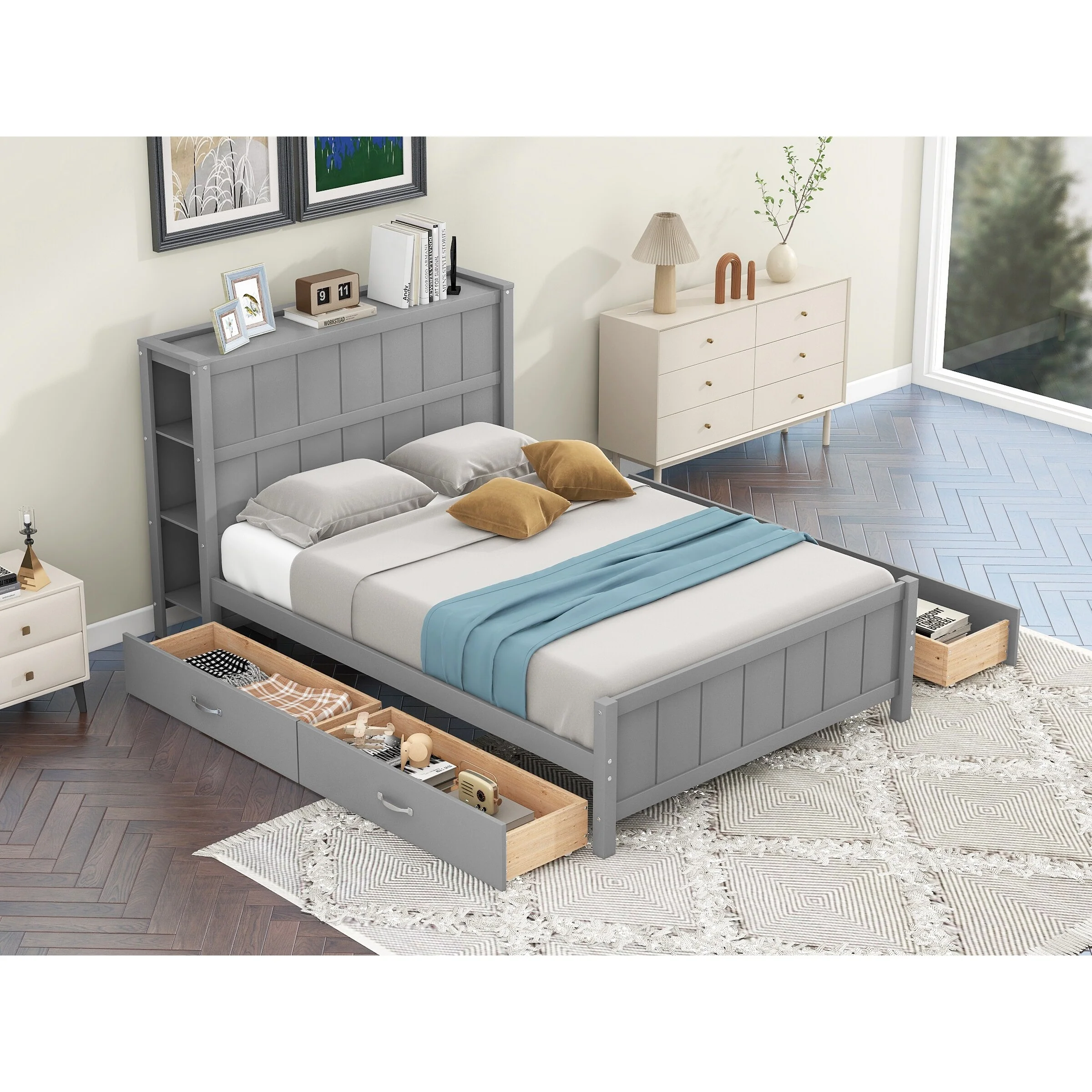 Full Size Platform Bed with Drawers and Shelves, Space-Saving Storage