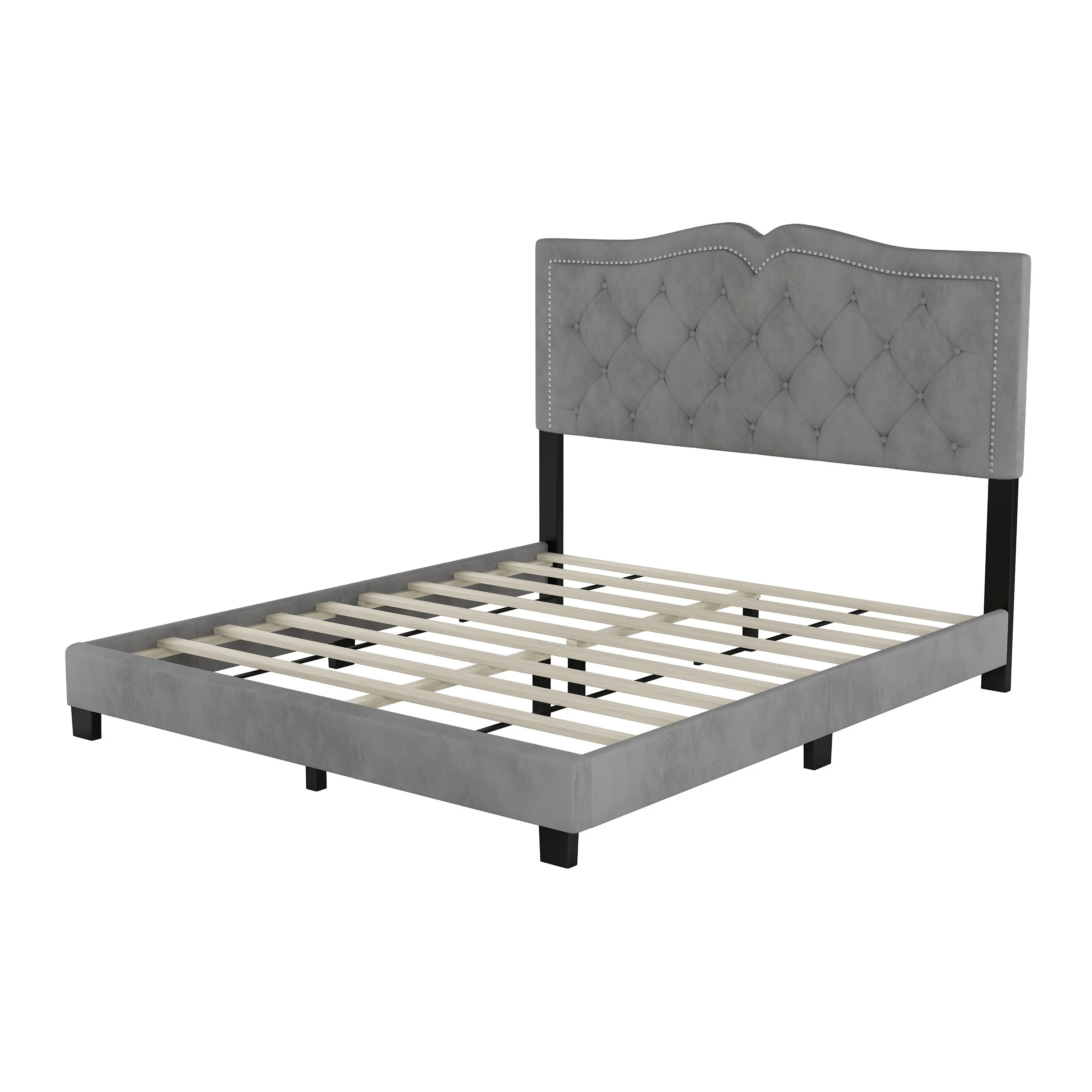 Queen Size Velvet Upholstered Platform Bed with Tufted Headboard and Rivet Design