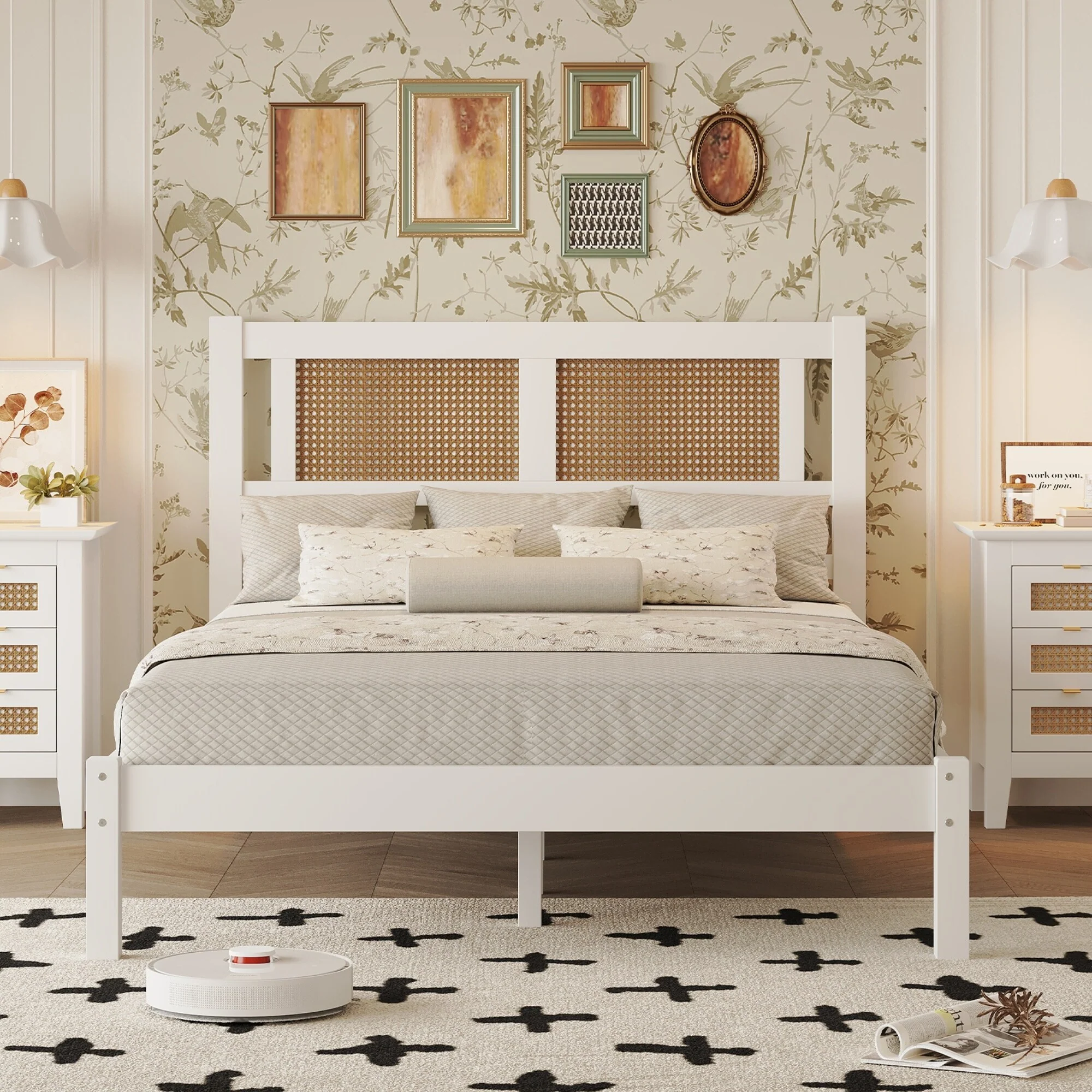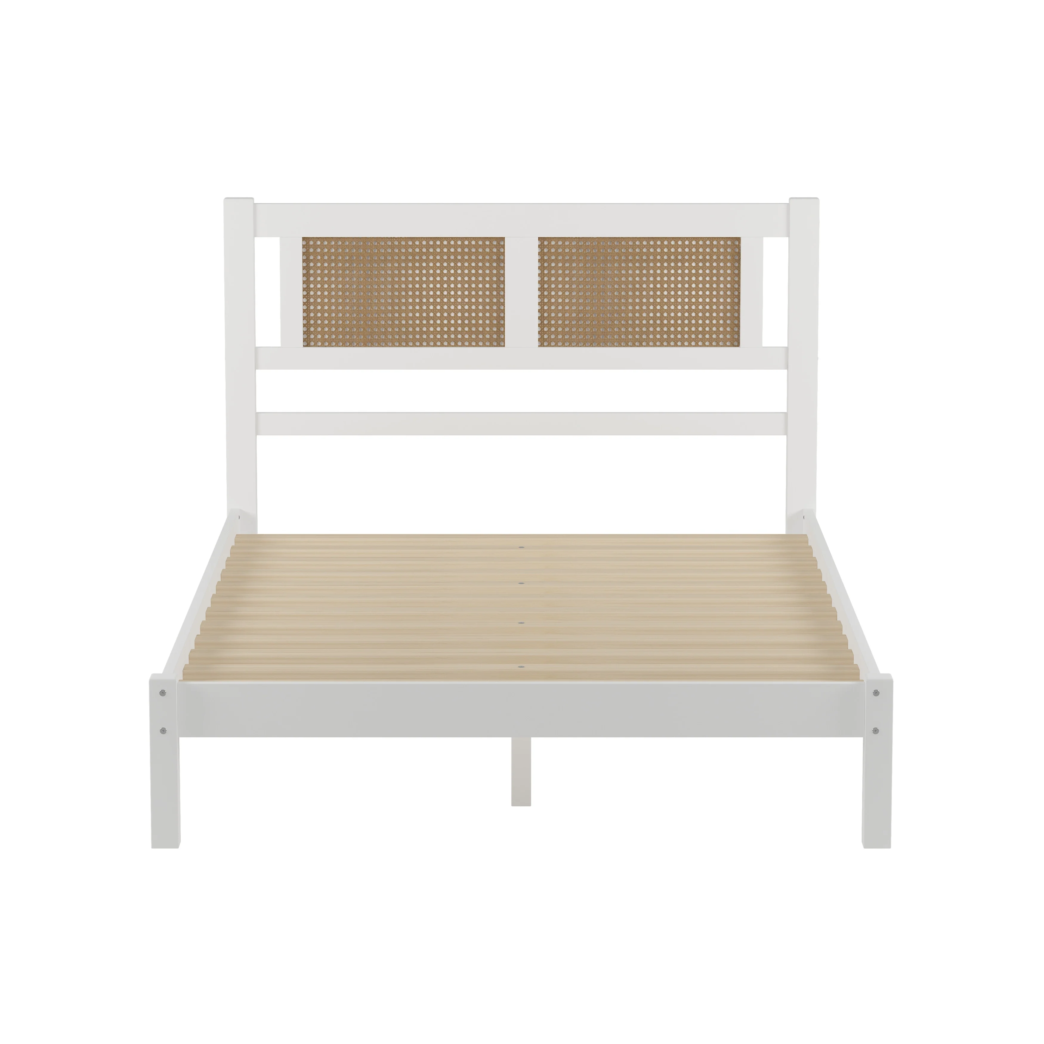 Full Size Platform Bed with Natural Rattan Headboard, Minimalist Design