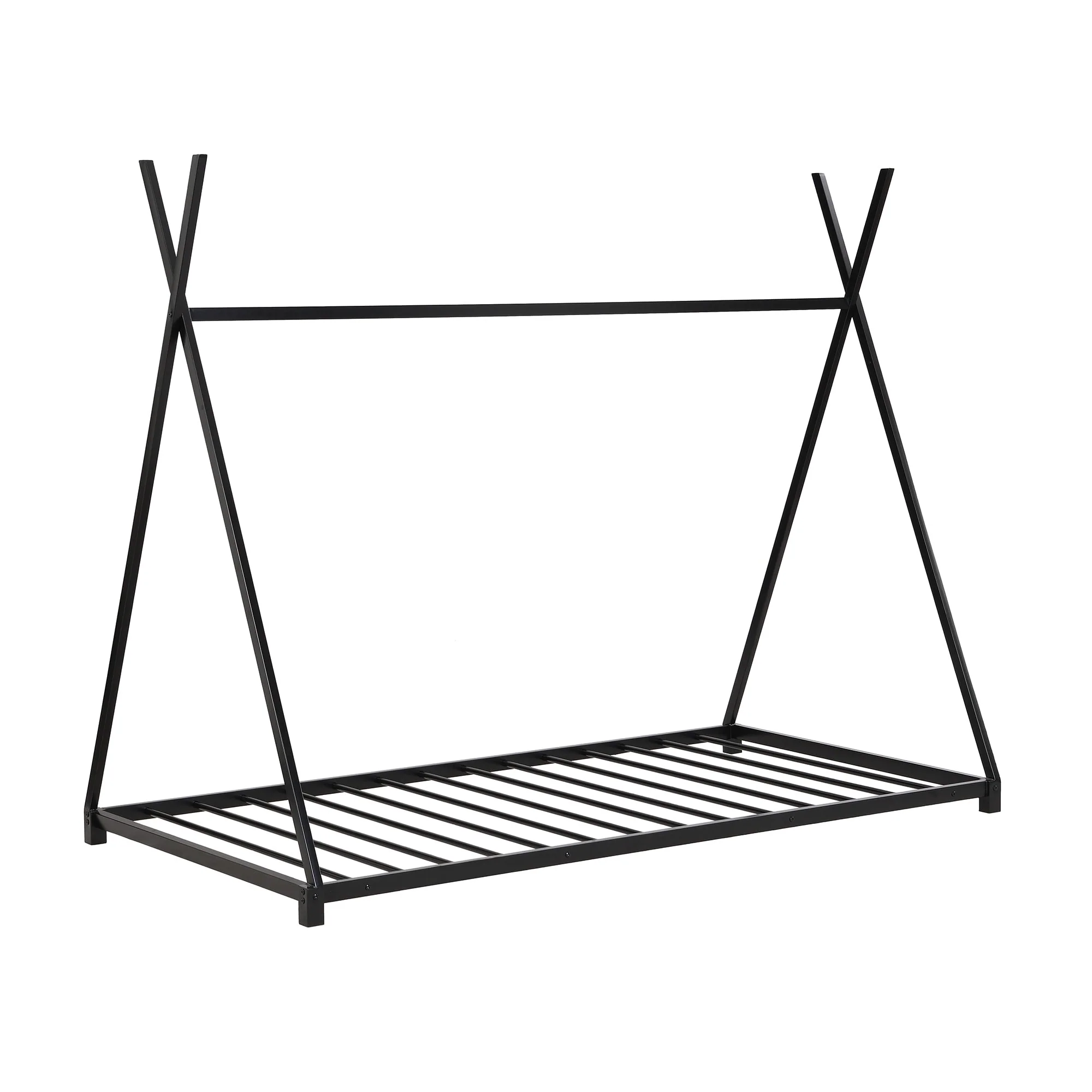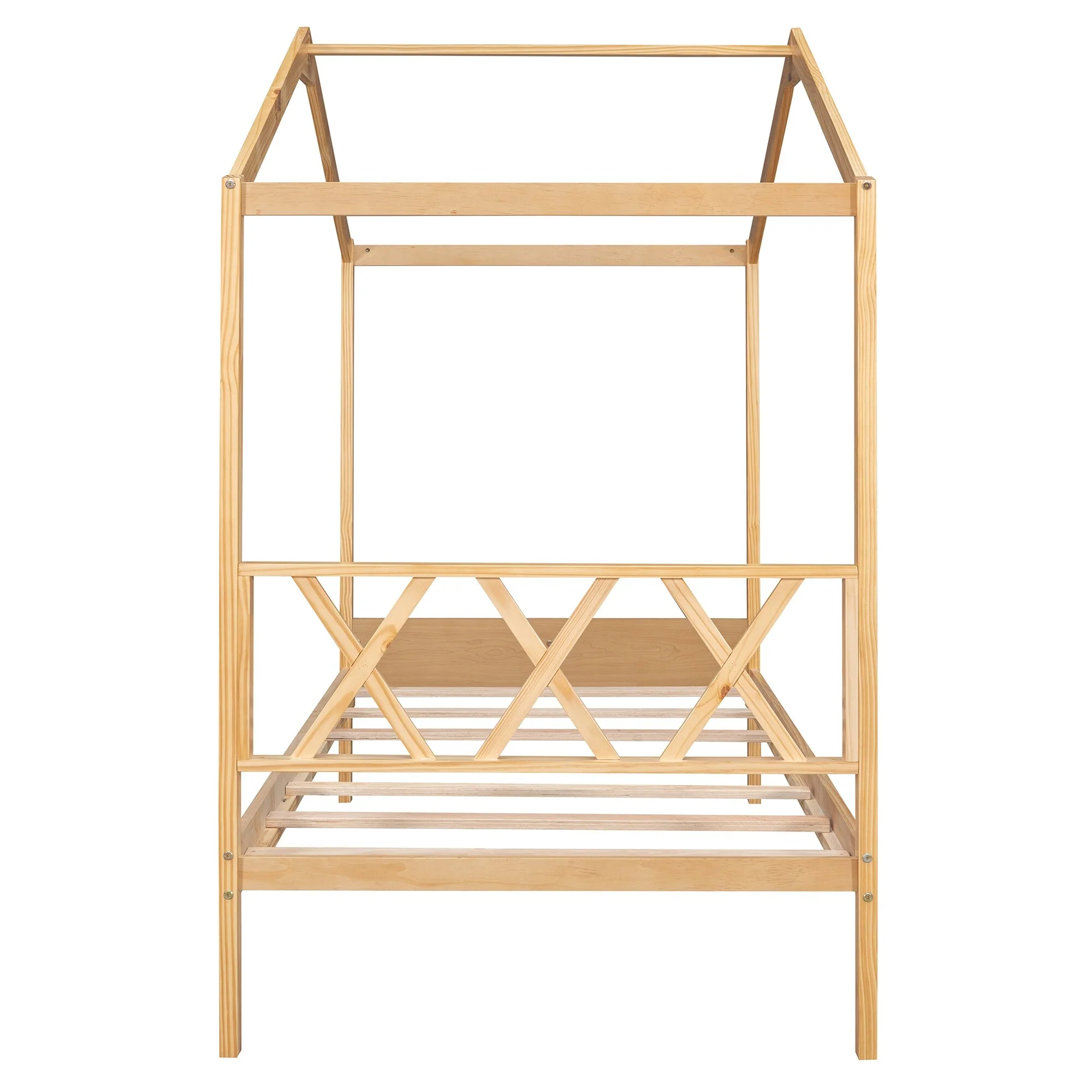 Sturdy Metal Twin House Bed with X-Shaped Safety Railings, No Box Spring Required