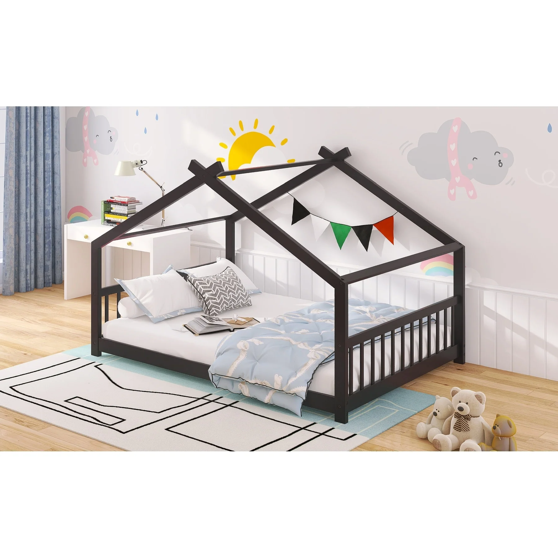 Full House Bed for Kids with Roof Design, Sturdy Pinewood Frame, Espresso Finish