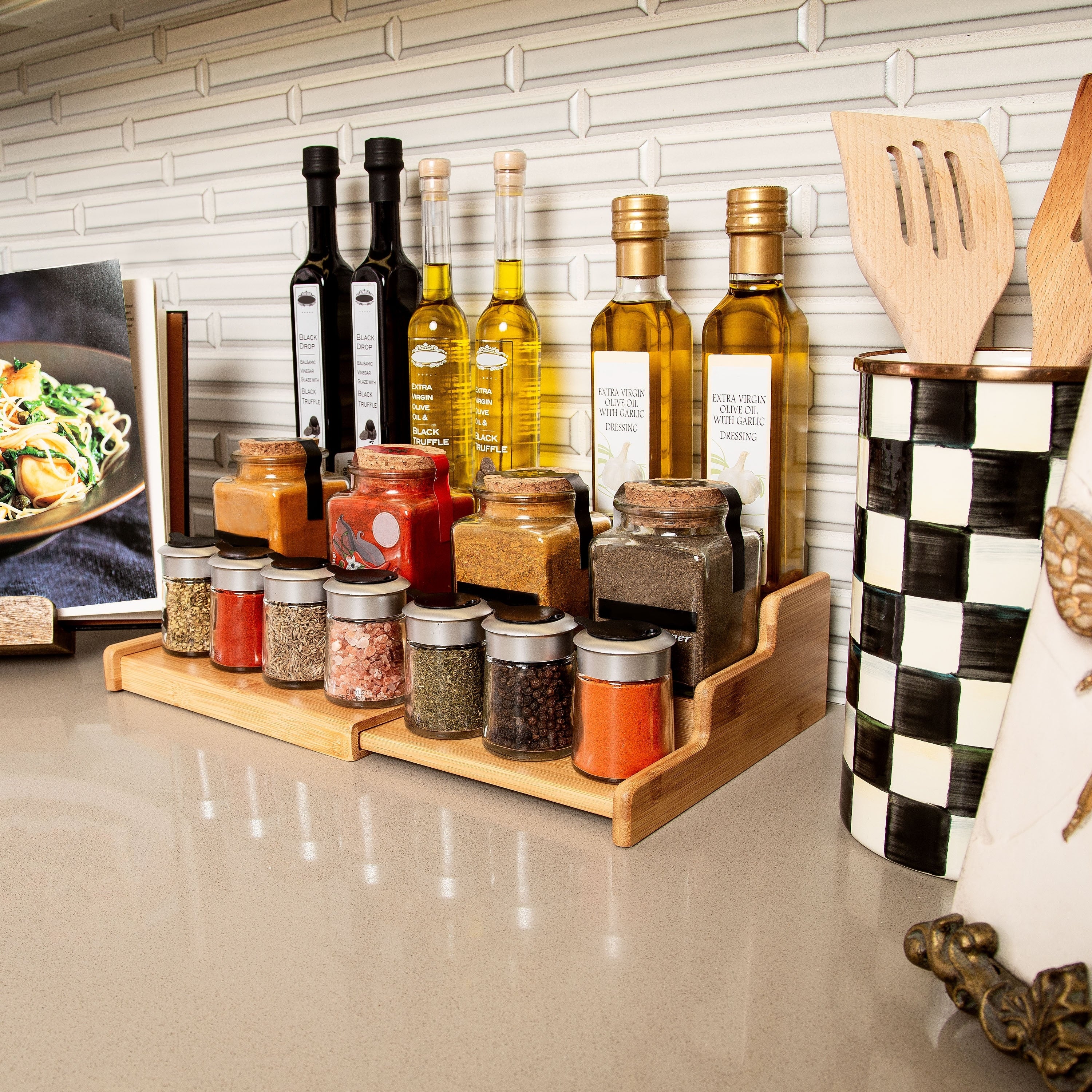 Seville Classics 3-Tier Expandable Bamboo Spice Rack Step Shelf Cabinet Organizer