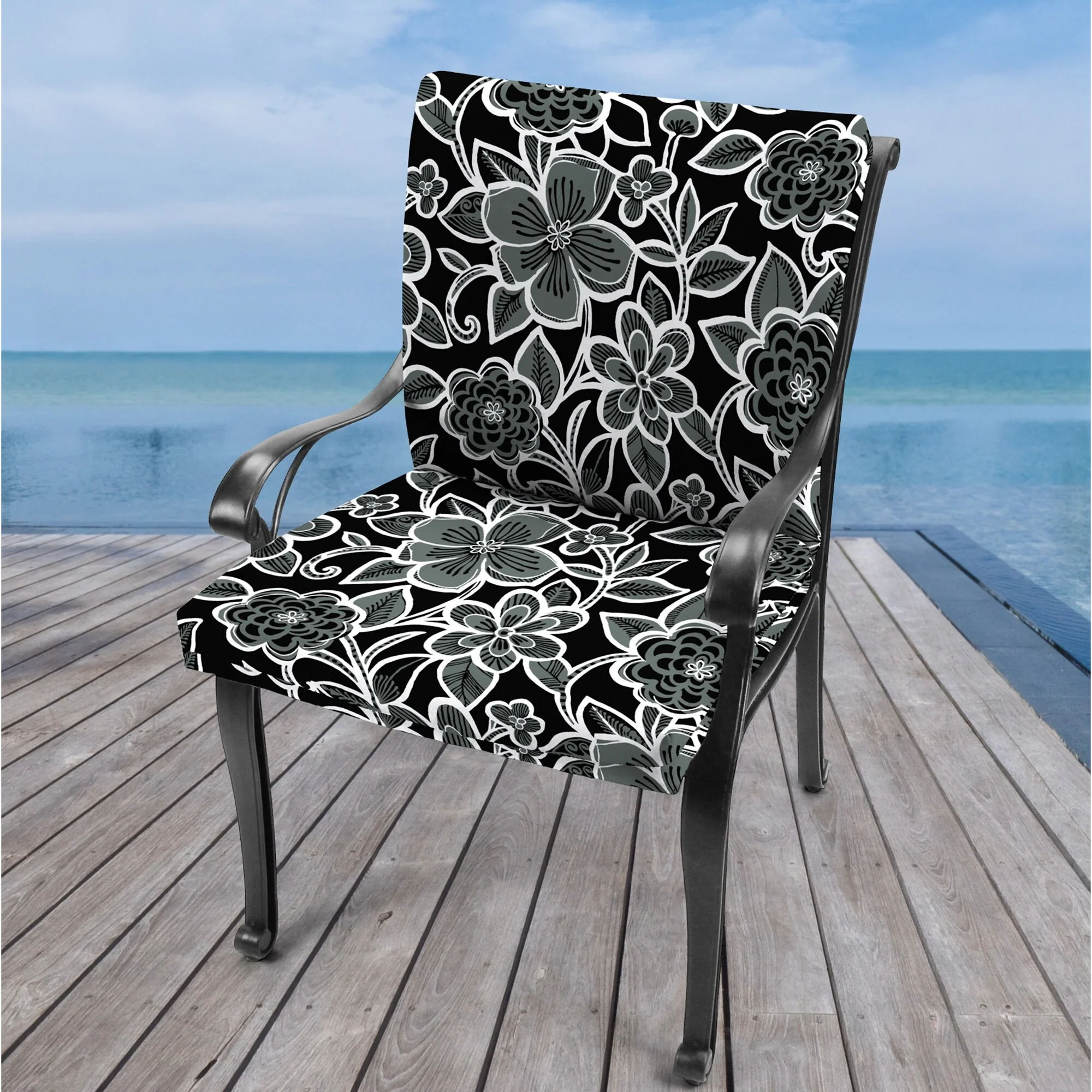 21" x 44" Black Floral Outdoor Chair Cushion with Ties and Loop - 44'' L x 21'' W x 3.5'' H