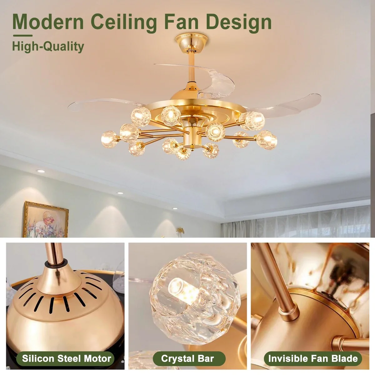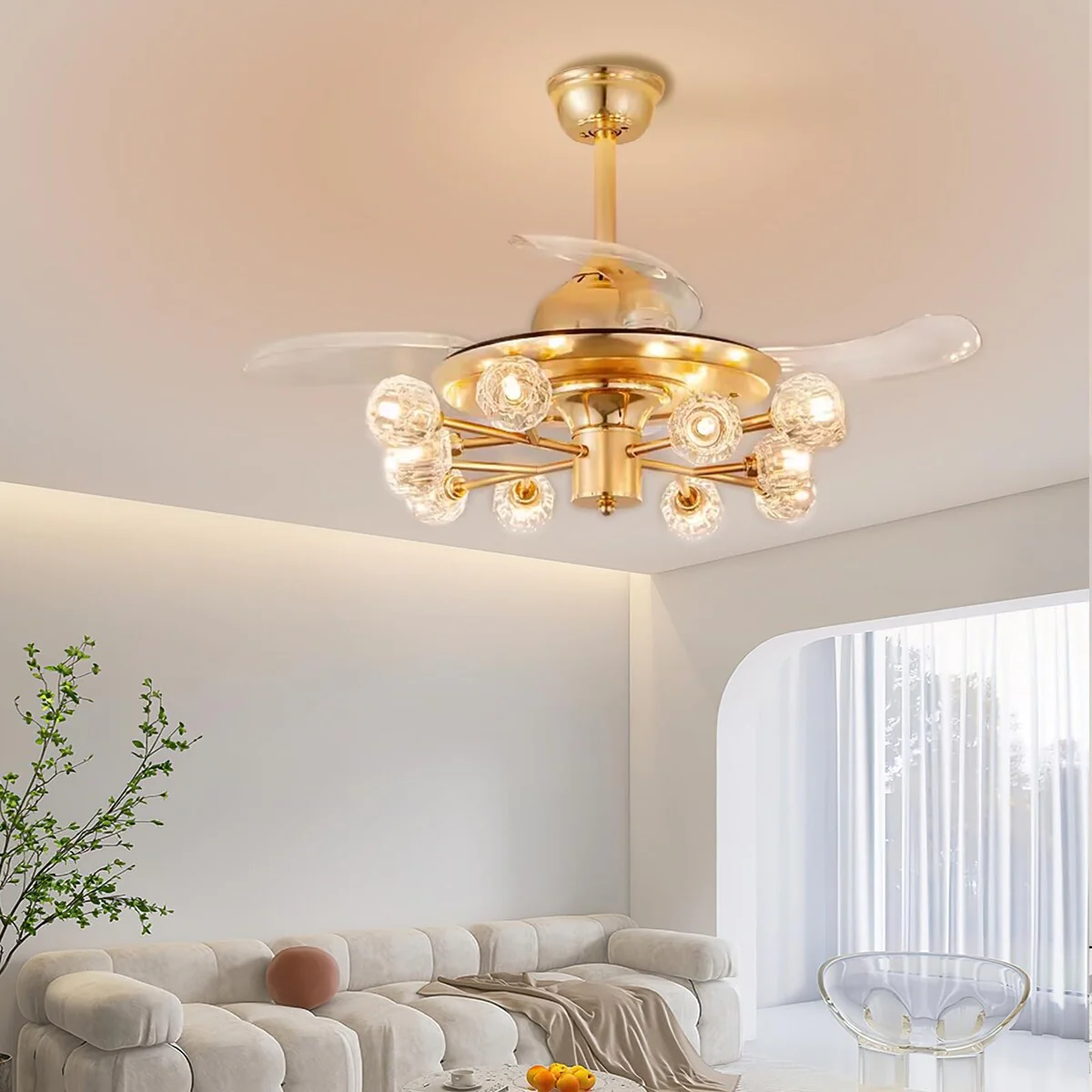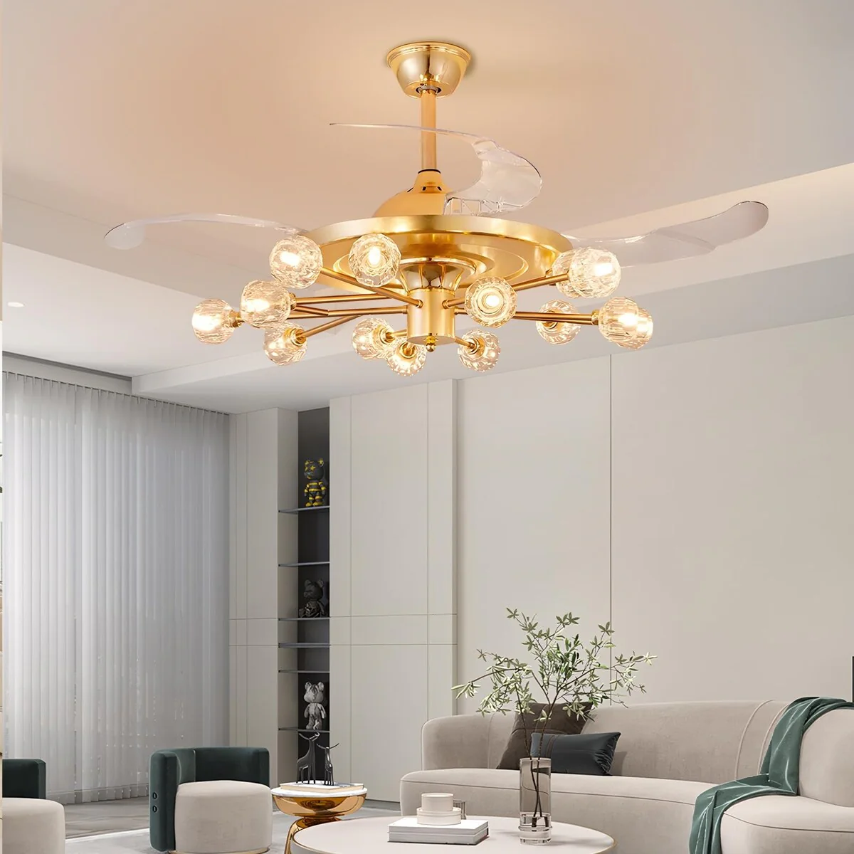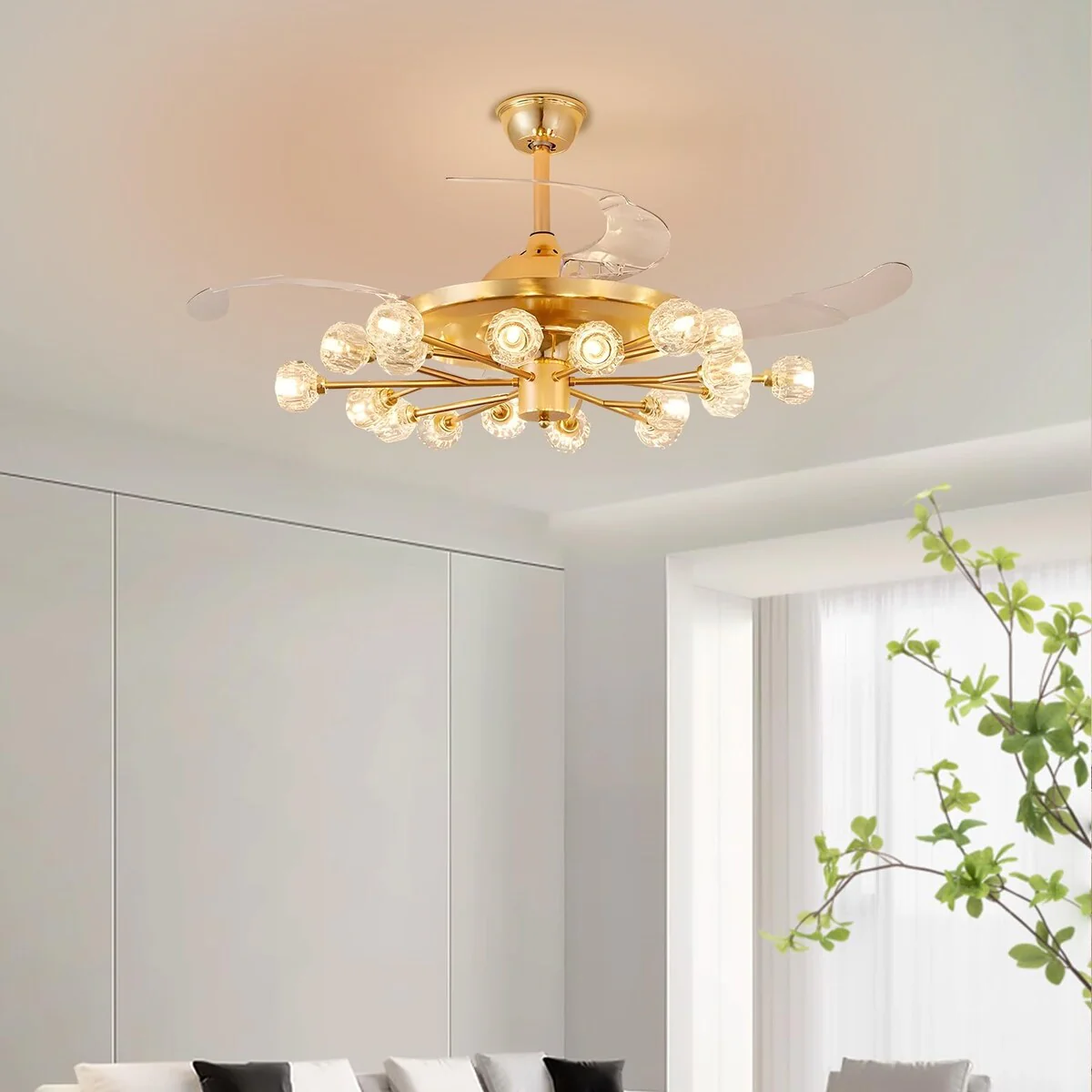 Chandelier Ceiling Fans with Lights and Remote, Sputnik Crystal, Modern Retractable Fandelier, 6 Speeds, Timing
