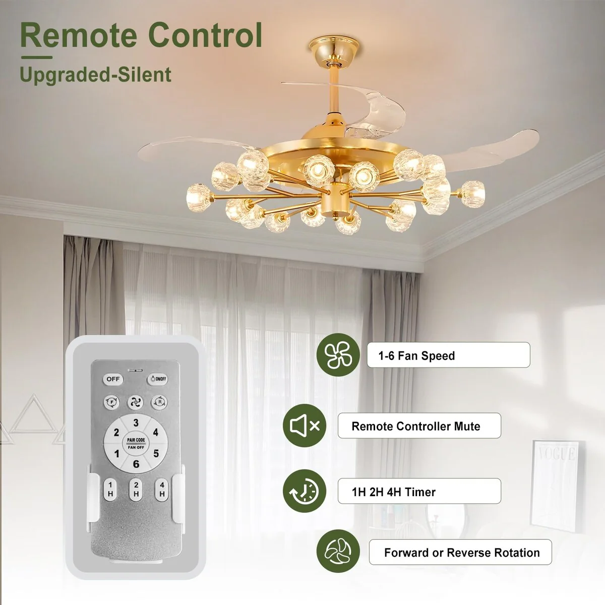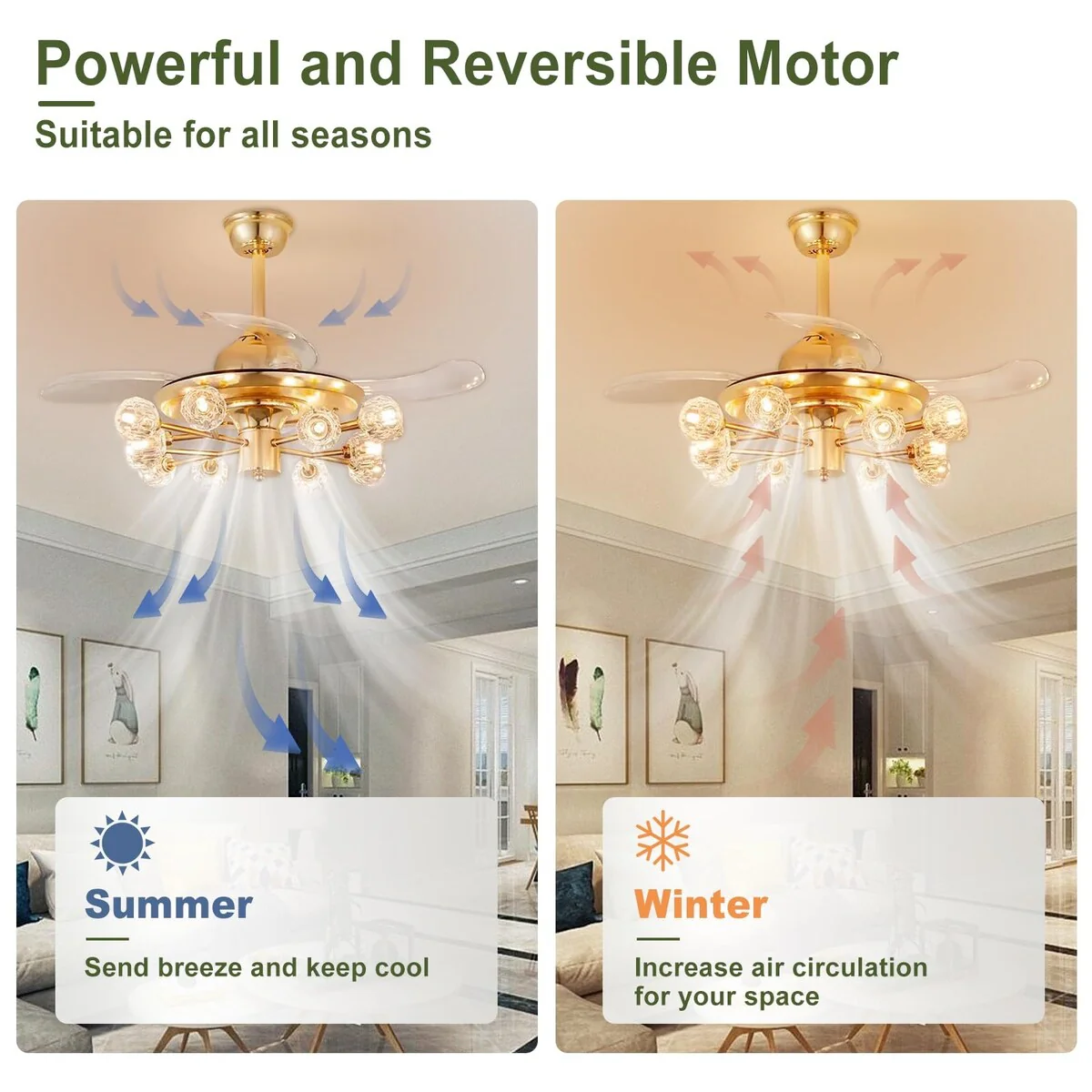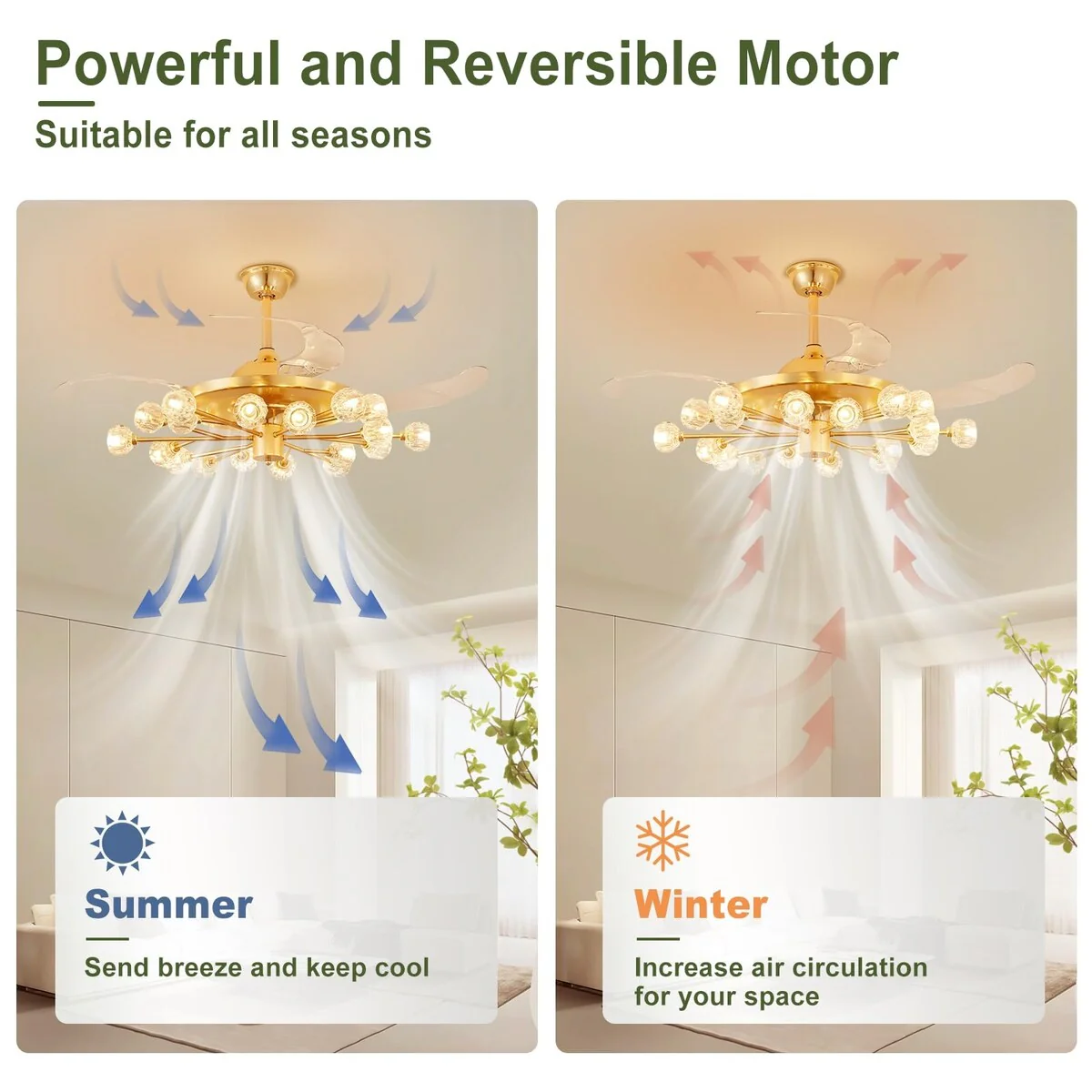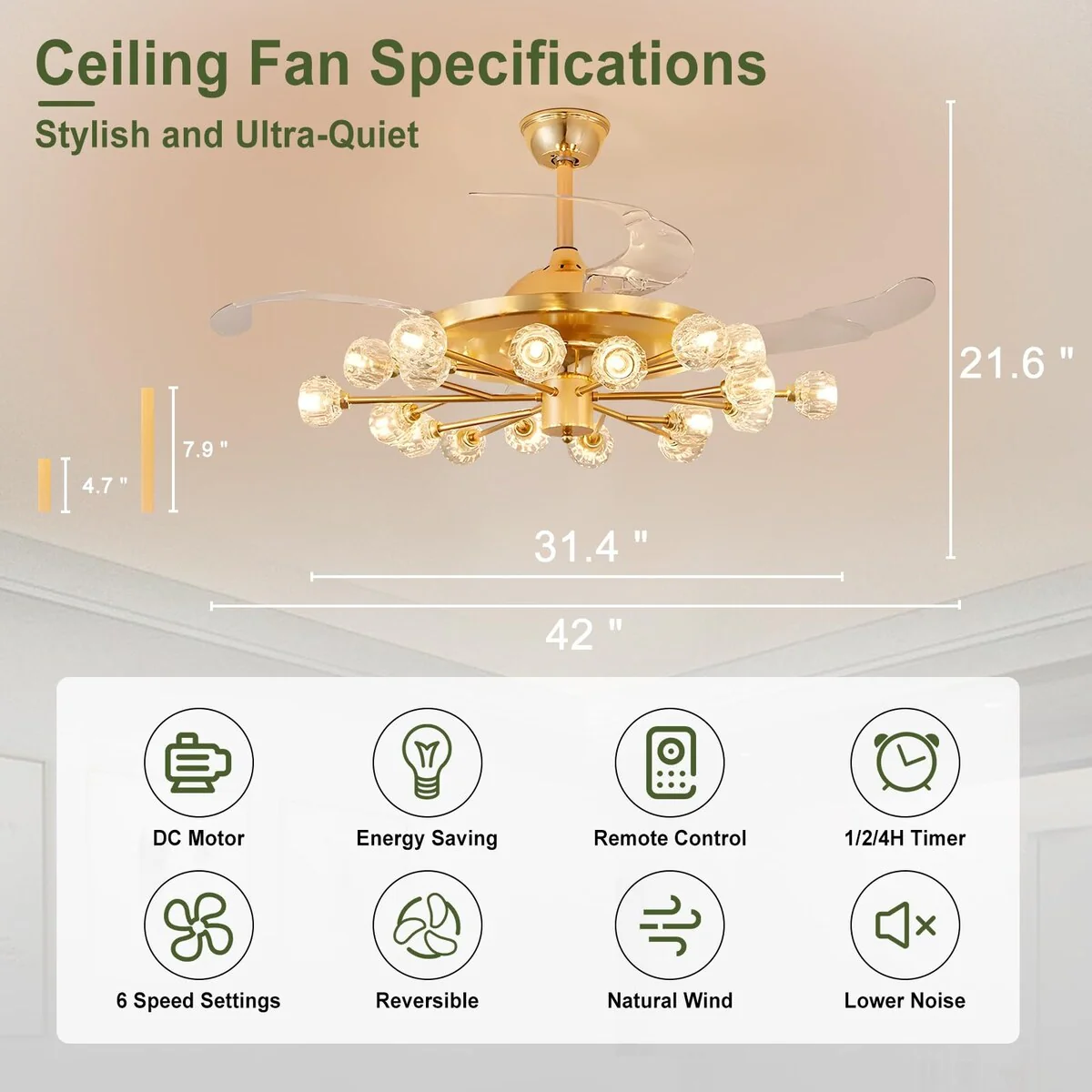 Chandelier Ceiling Fans with Lights and Remote, Sputnik Crystal, Modern Retractable Fandelier, 6 Speeds, Timing