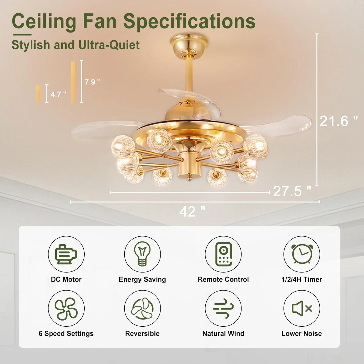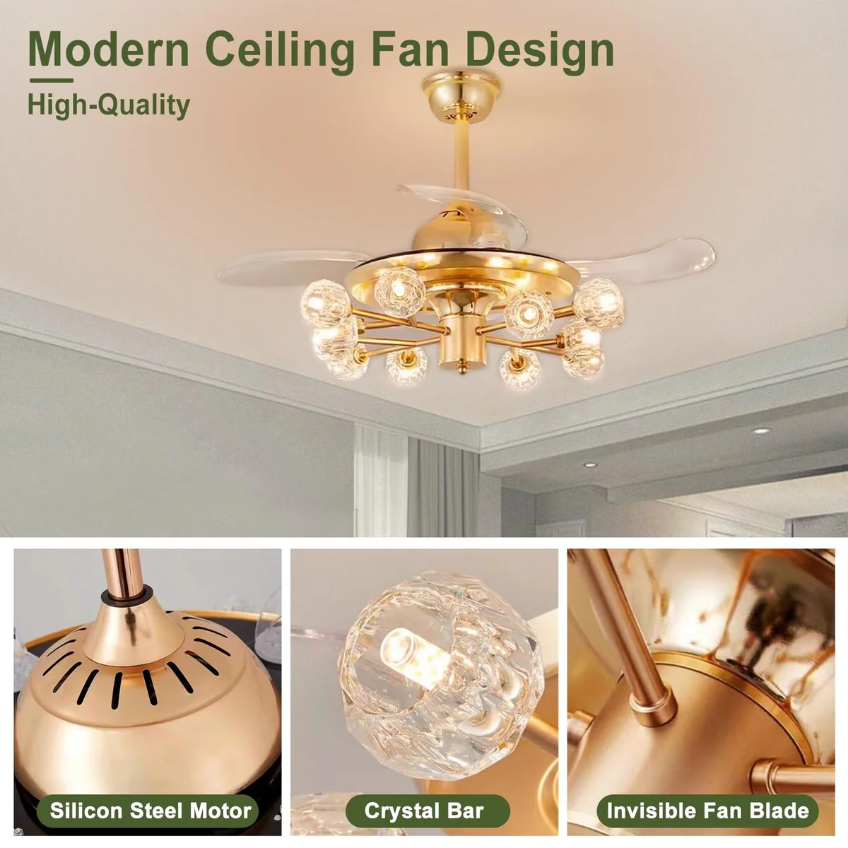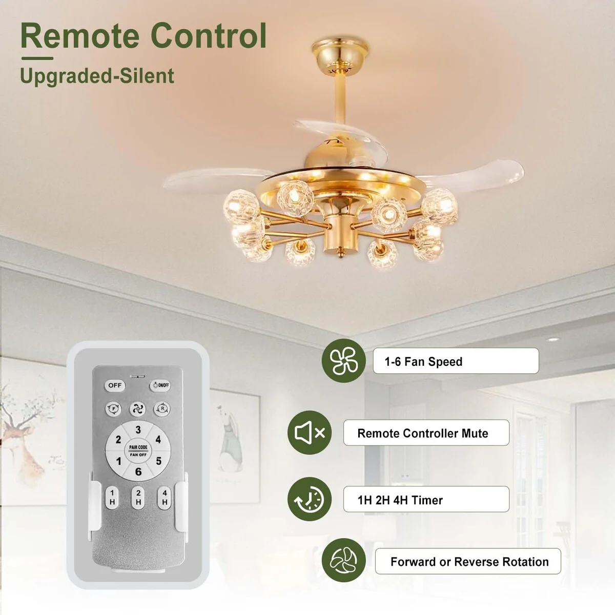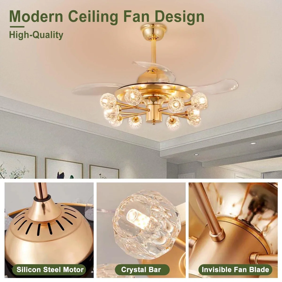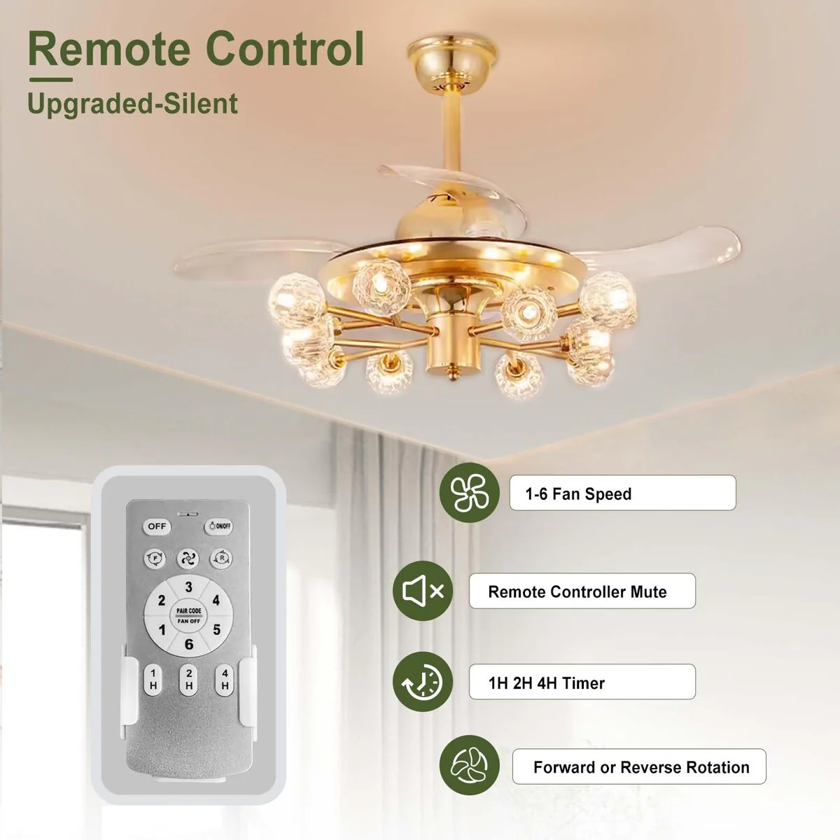 Chandelier Ceiling Fans with Lights and Remote, Sputnik Crystal, Modern Retractable Fandelier, 6 Speeds, Timing