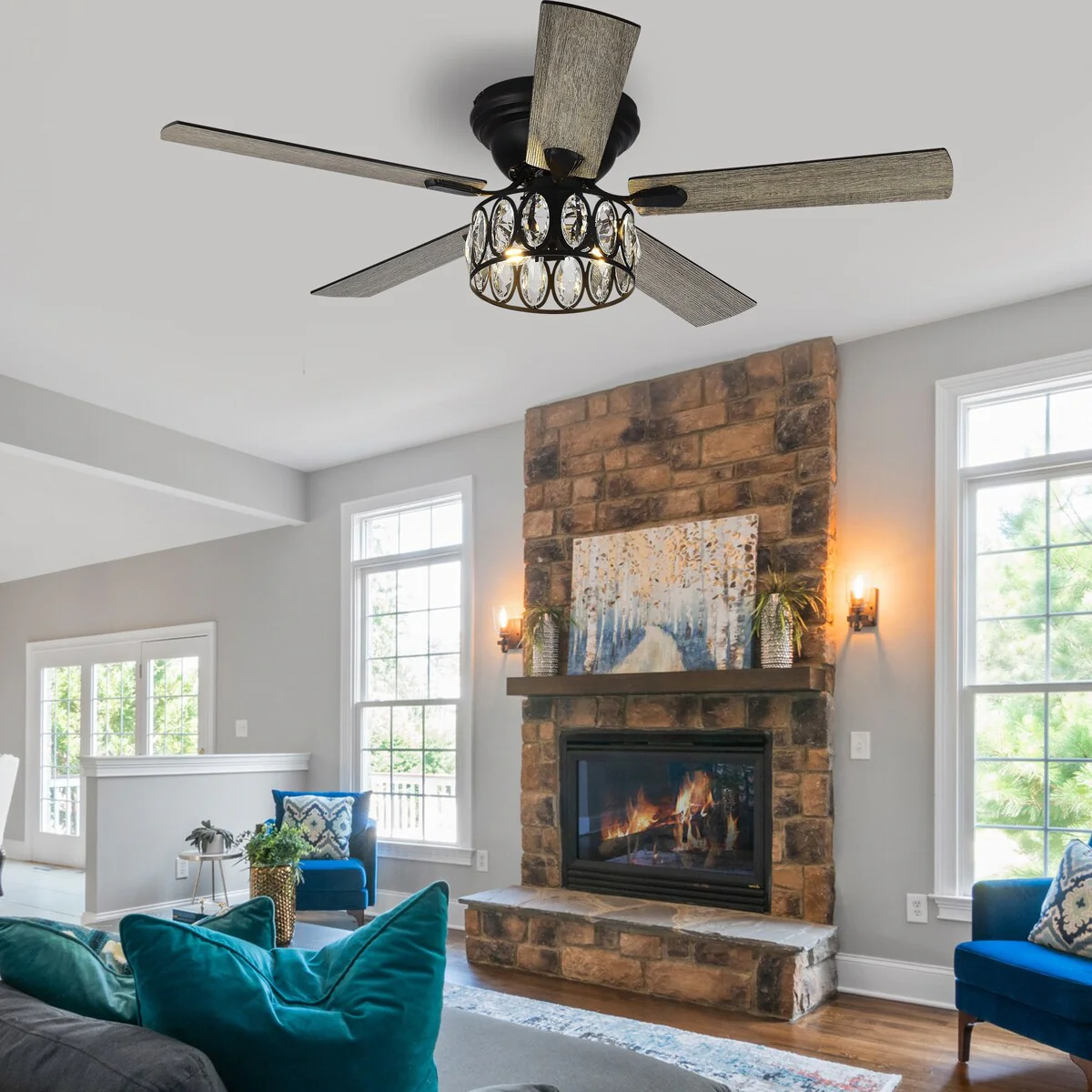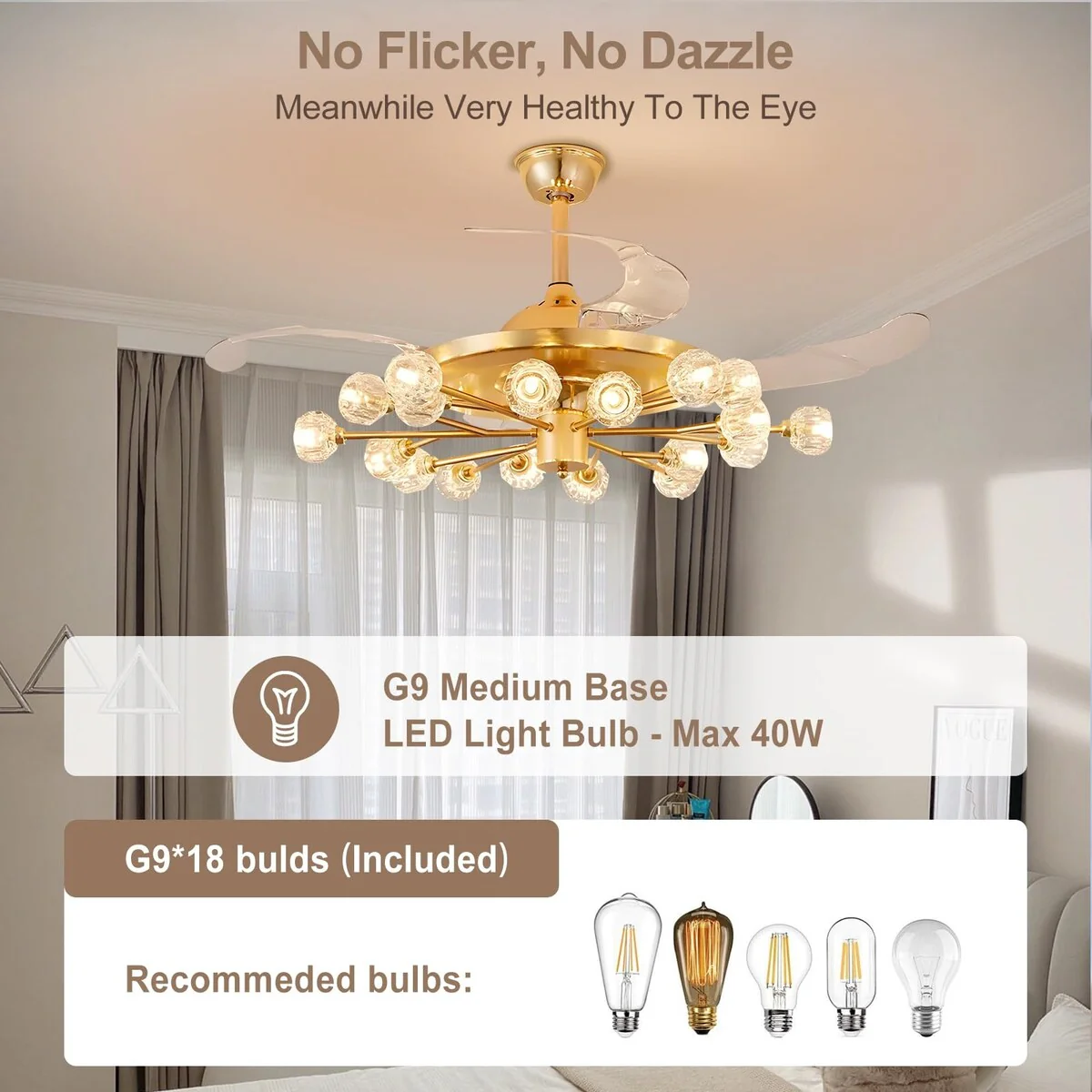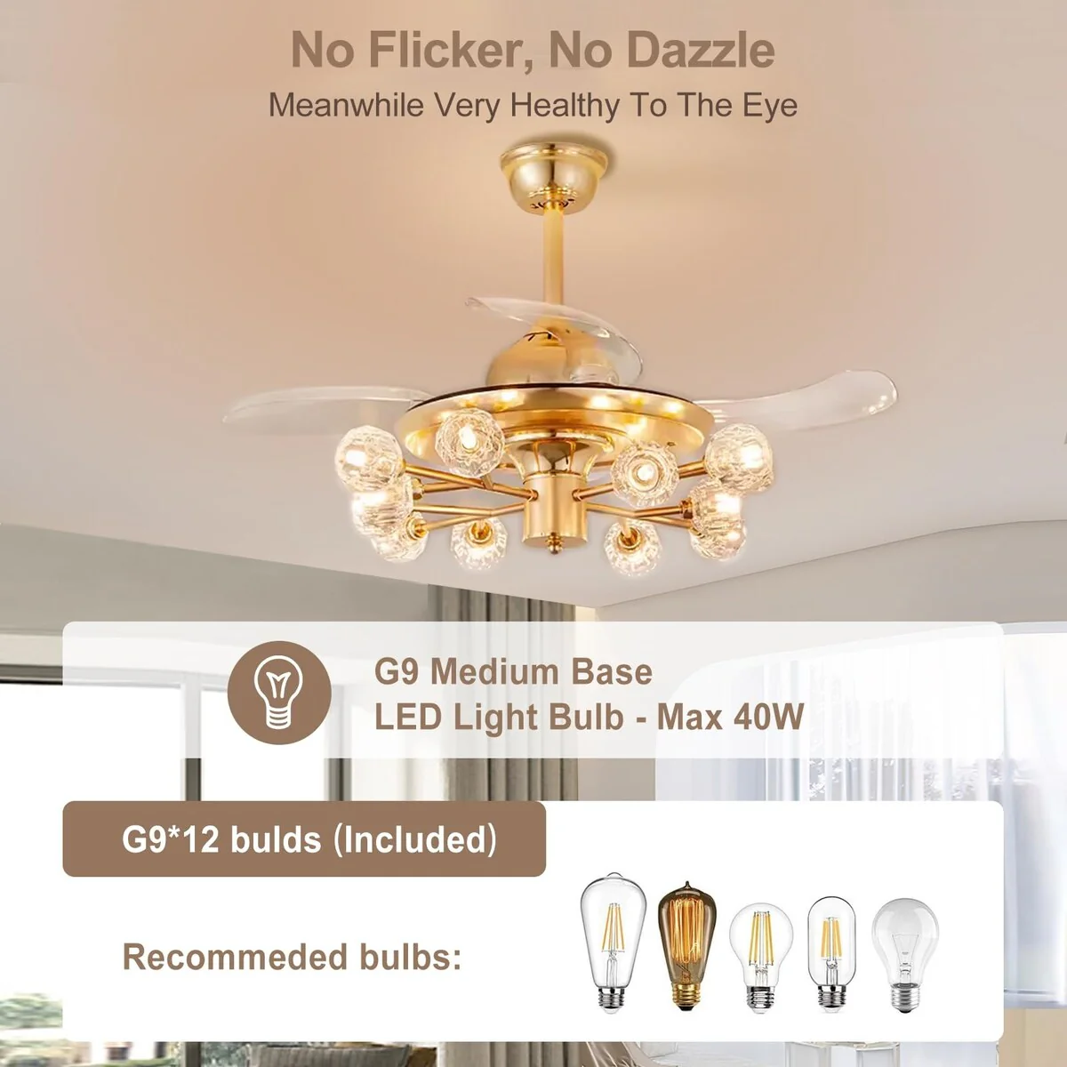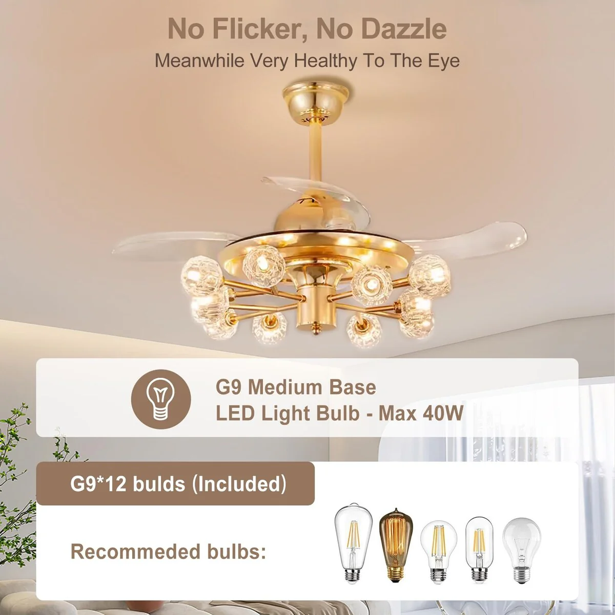 Chandelier Ceiling Fans with Lights and Remote, Sputnik Crystal, Modern Retractable Fandelier, 6 Speeds, Timing
