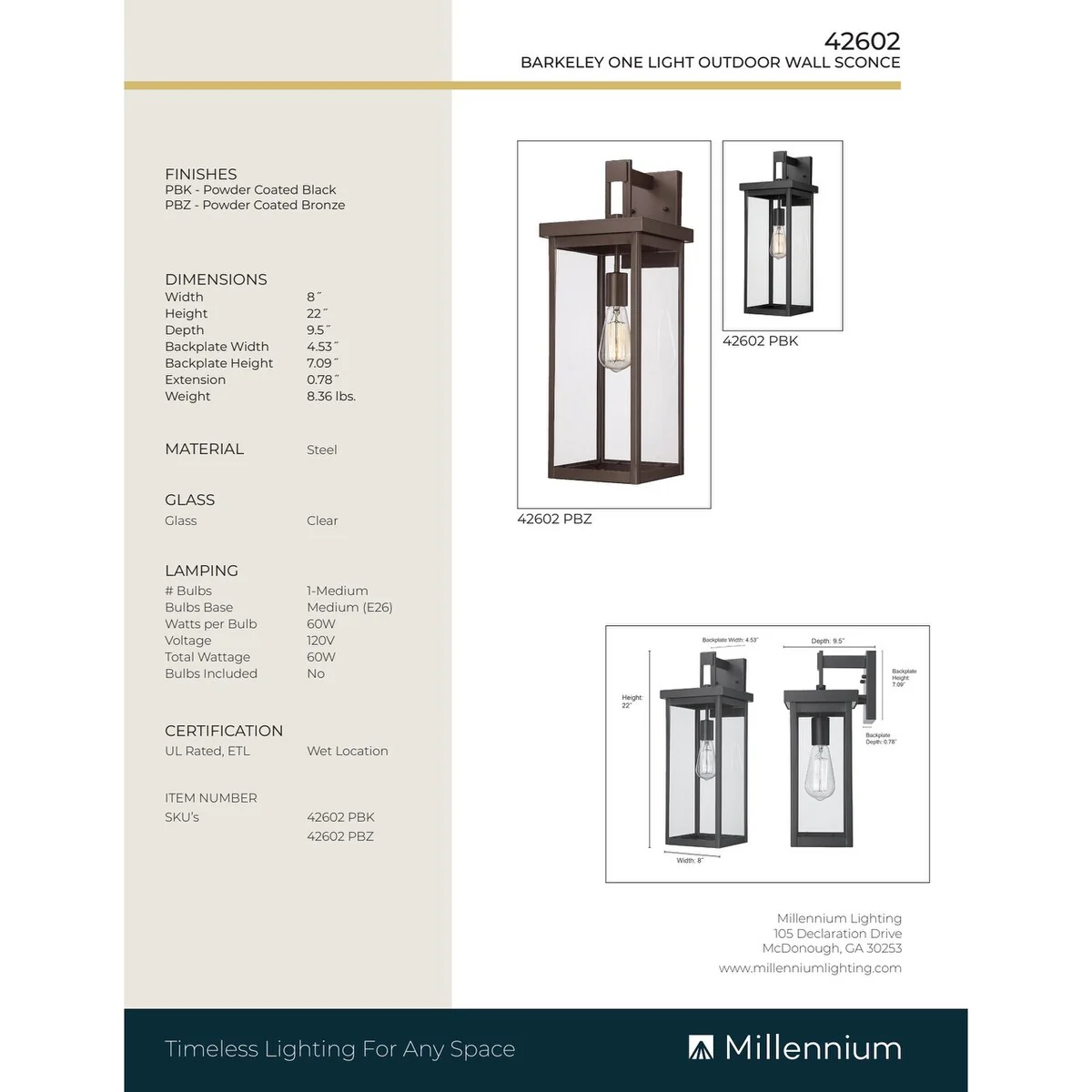 Millennium Lighting Barkeley 1 Light 22 inch Outdoor Wall Sconce