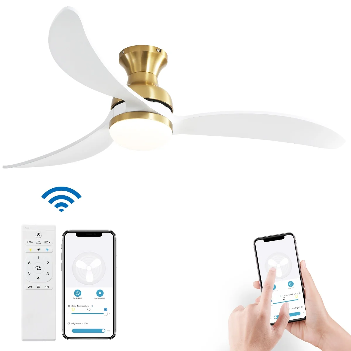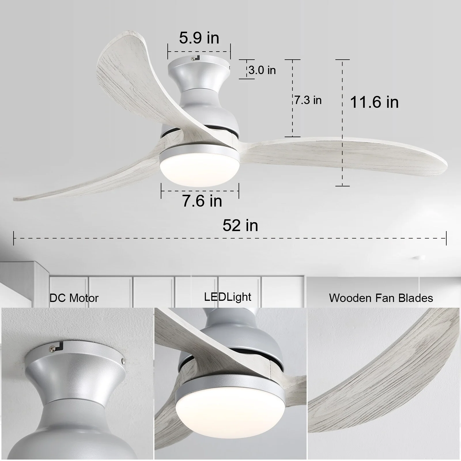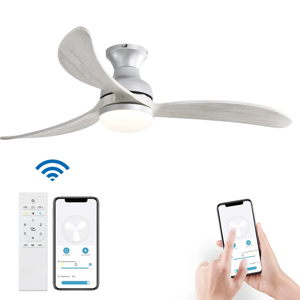 52 inch Smart Ceiling Fan Light with Remote Control with 3 Wood Blades,Flush Mount,Dimmable LED - 52 inch