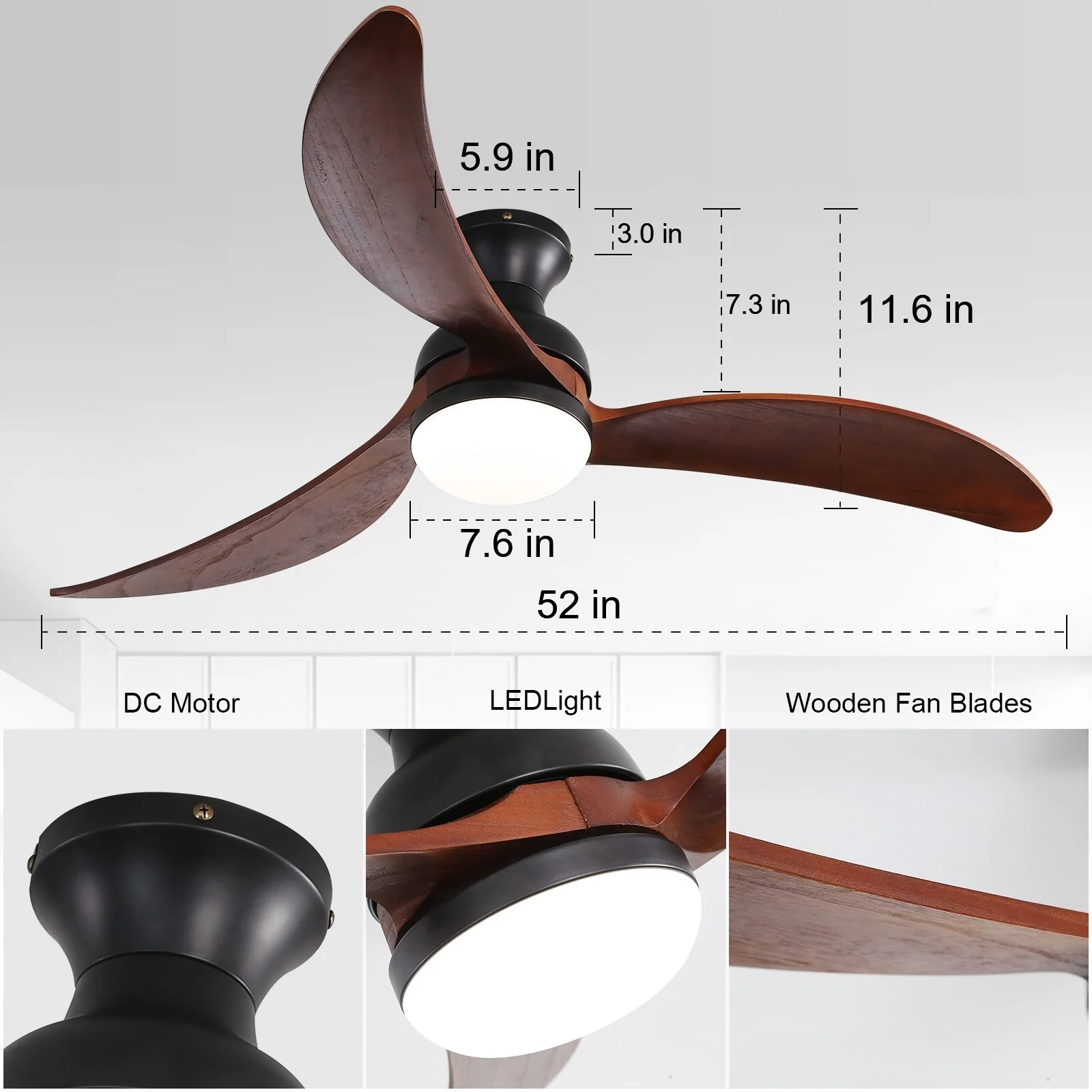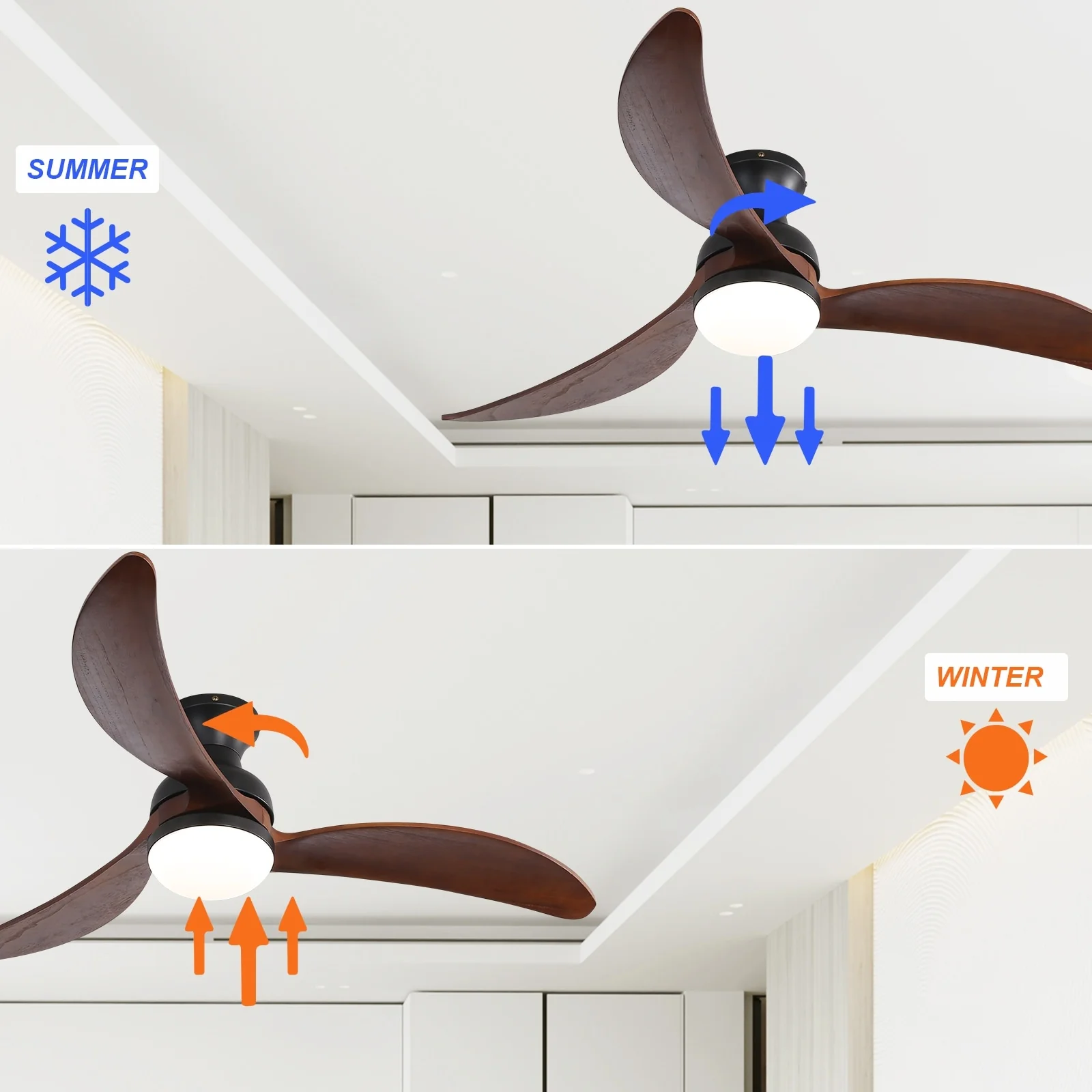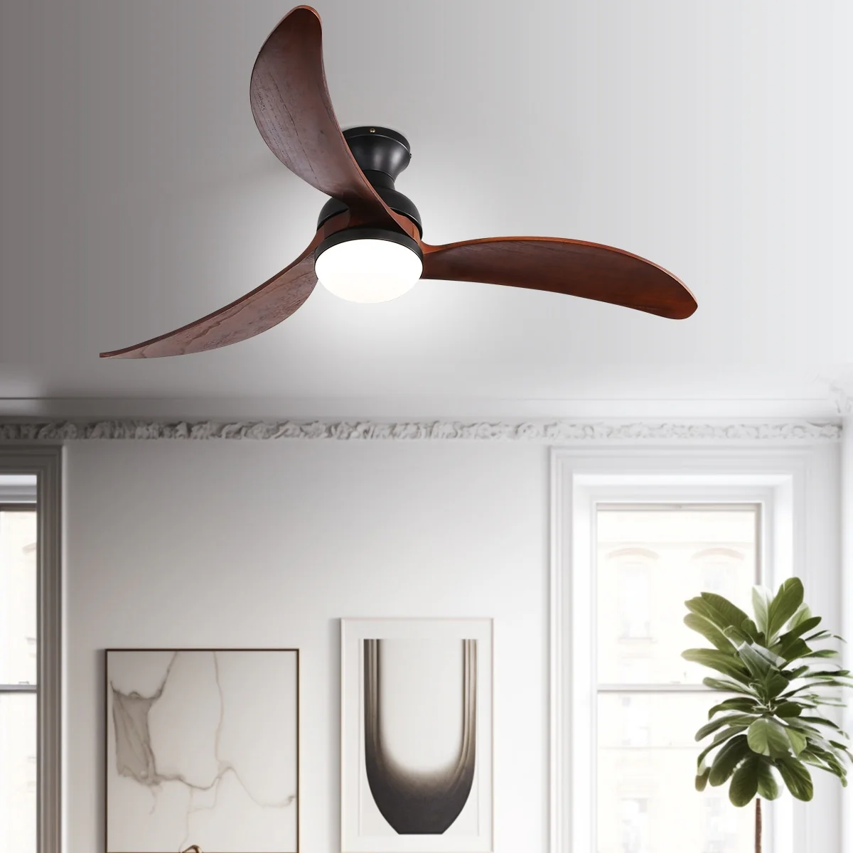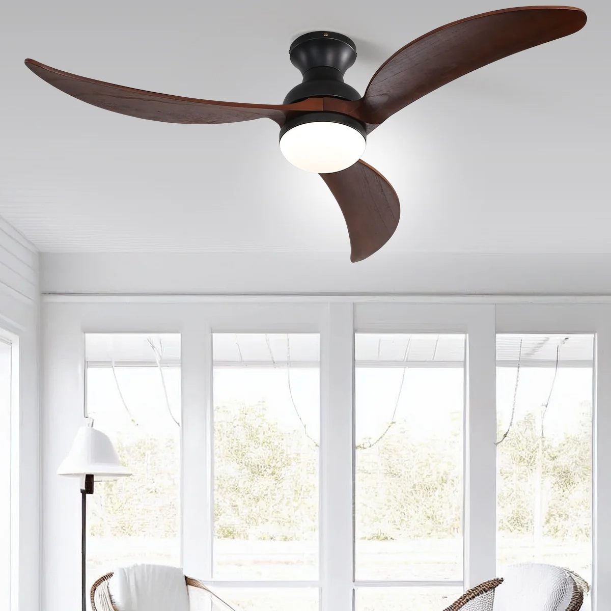 52" Flush Mount Ceiling Fan without Light,Reversible DC Motor,Wood Blades,Black and Walnut - 52 inch diameter