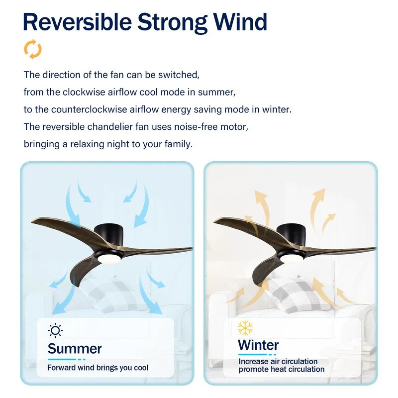 52" Flush Mount Ceiling Fan with Light, Noiseless Reversible Motor Ceiling Fan for Indoor Outdoor, 3 Solid Wood Fan Blades