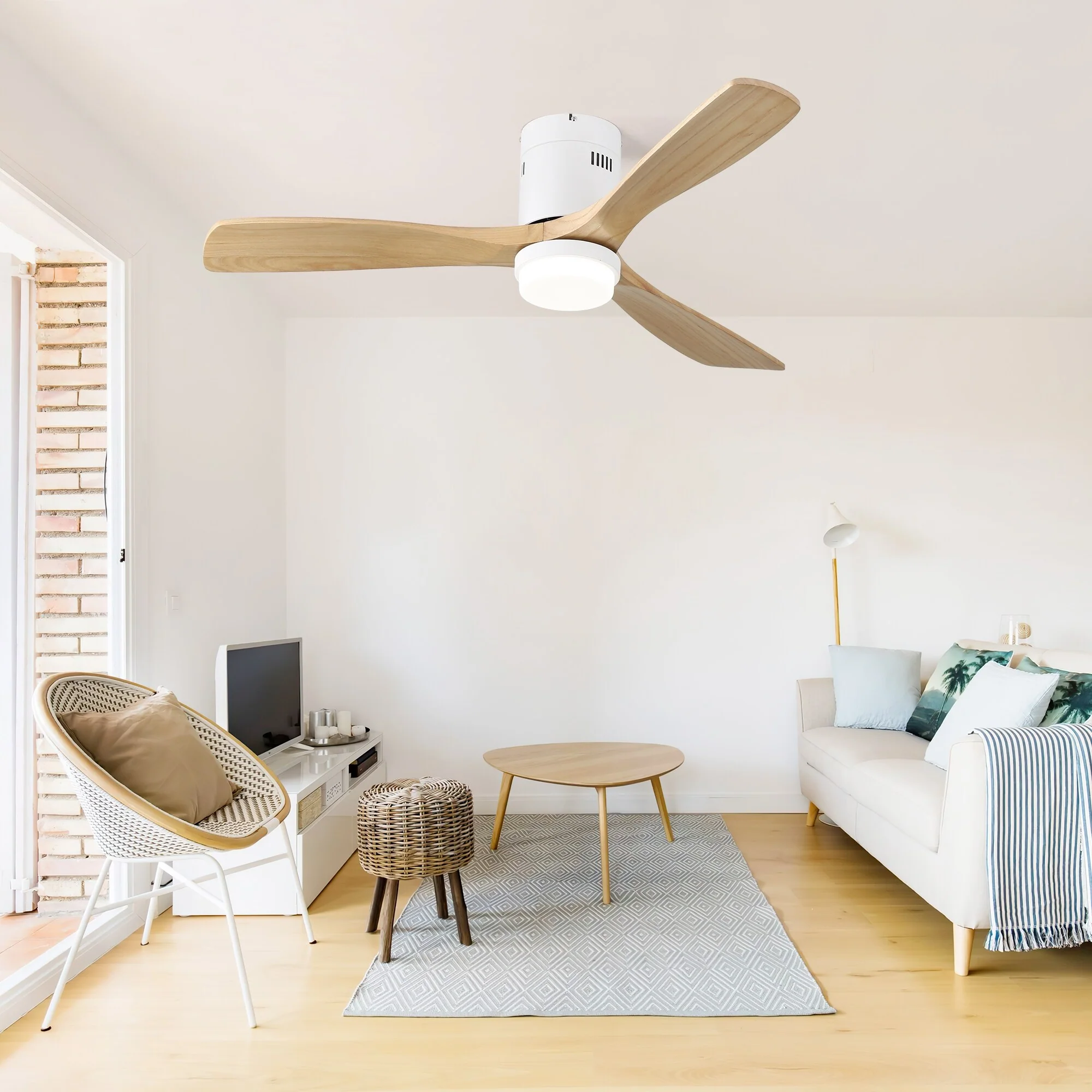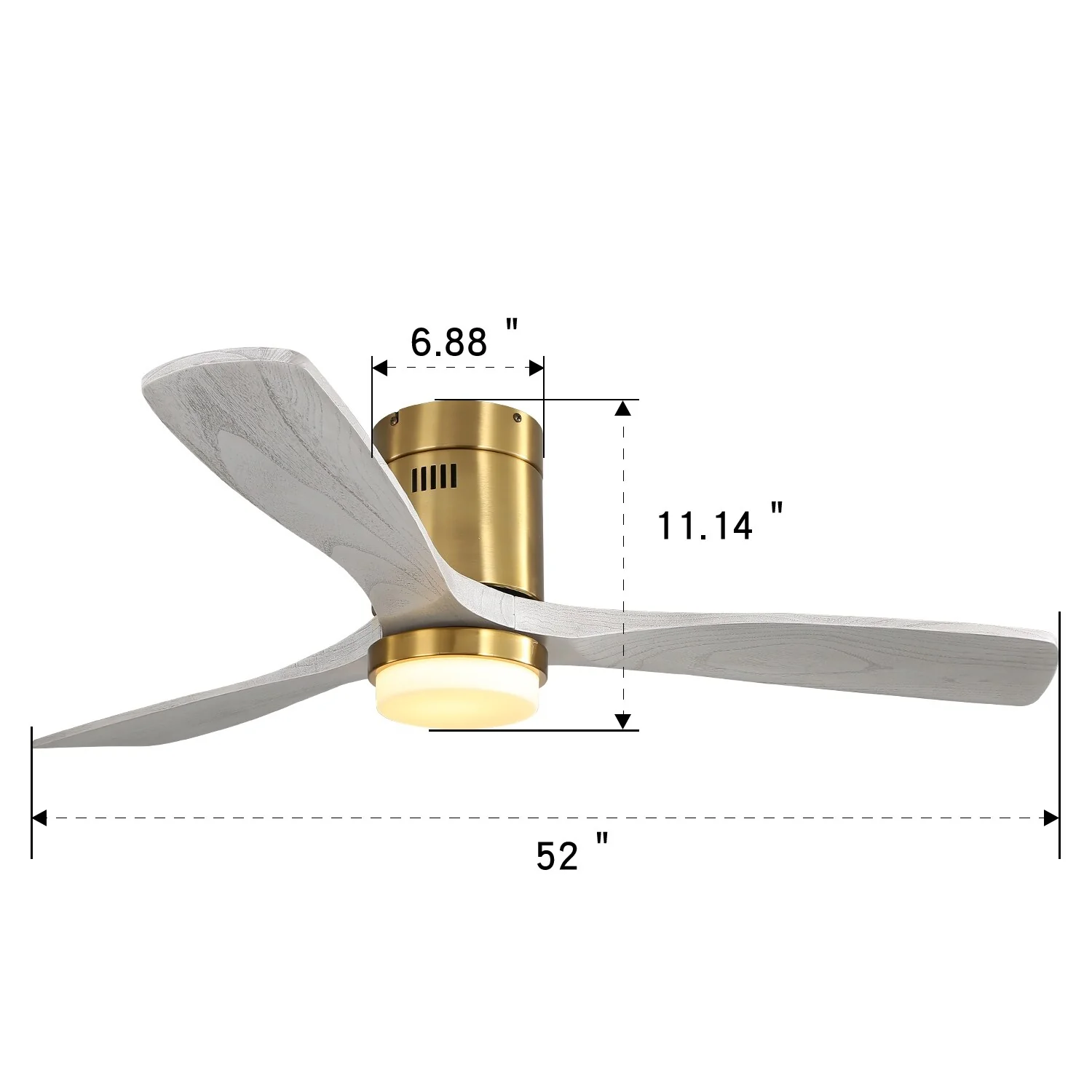 52" Flush Mount Ceiling Fan with Light, Noiseless Reversible Motor Ceiling Fan for Indoor Outdoor, 3 Solid Wood Fan Blades