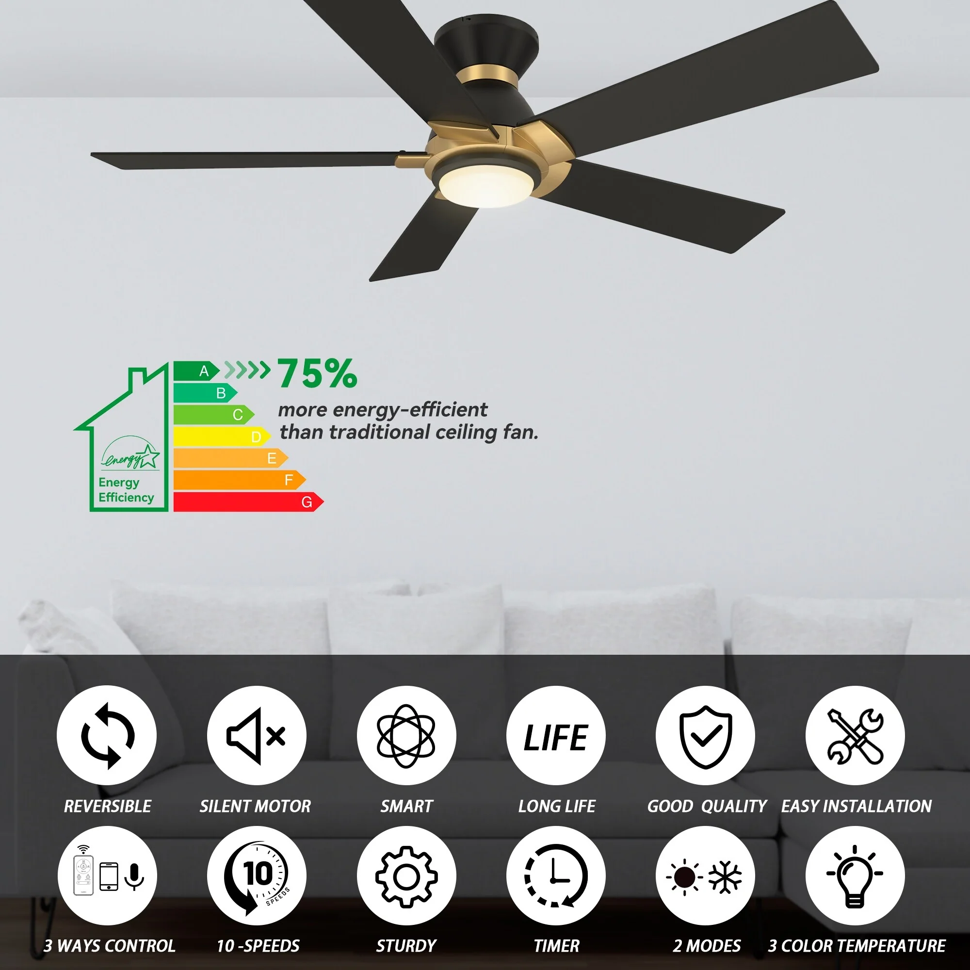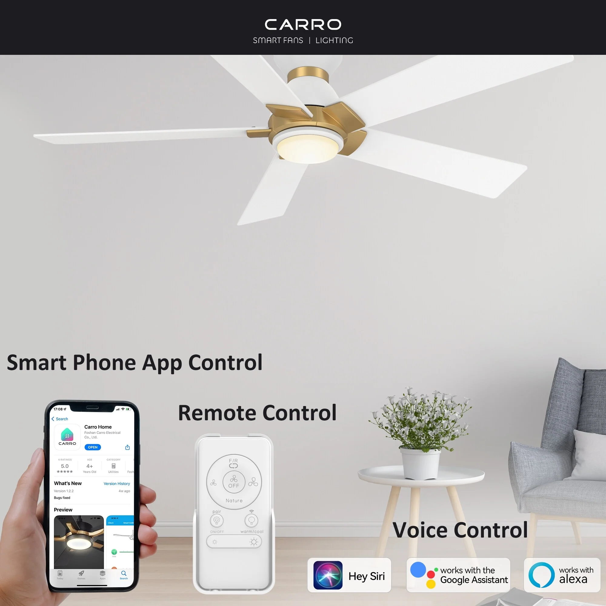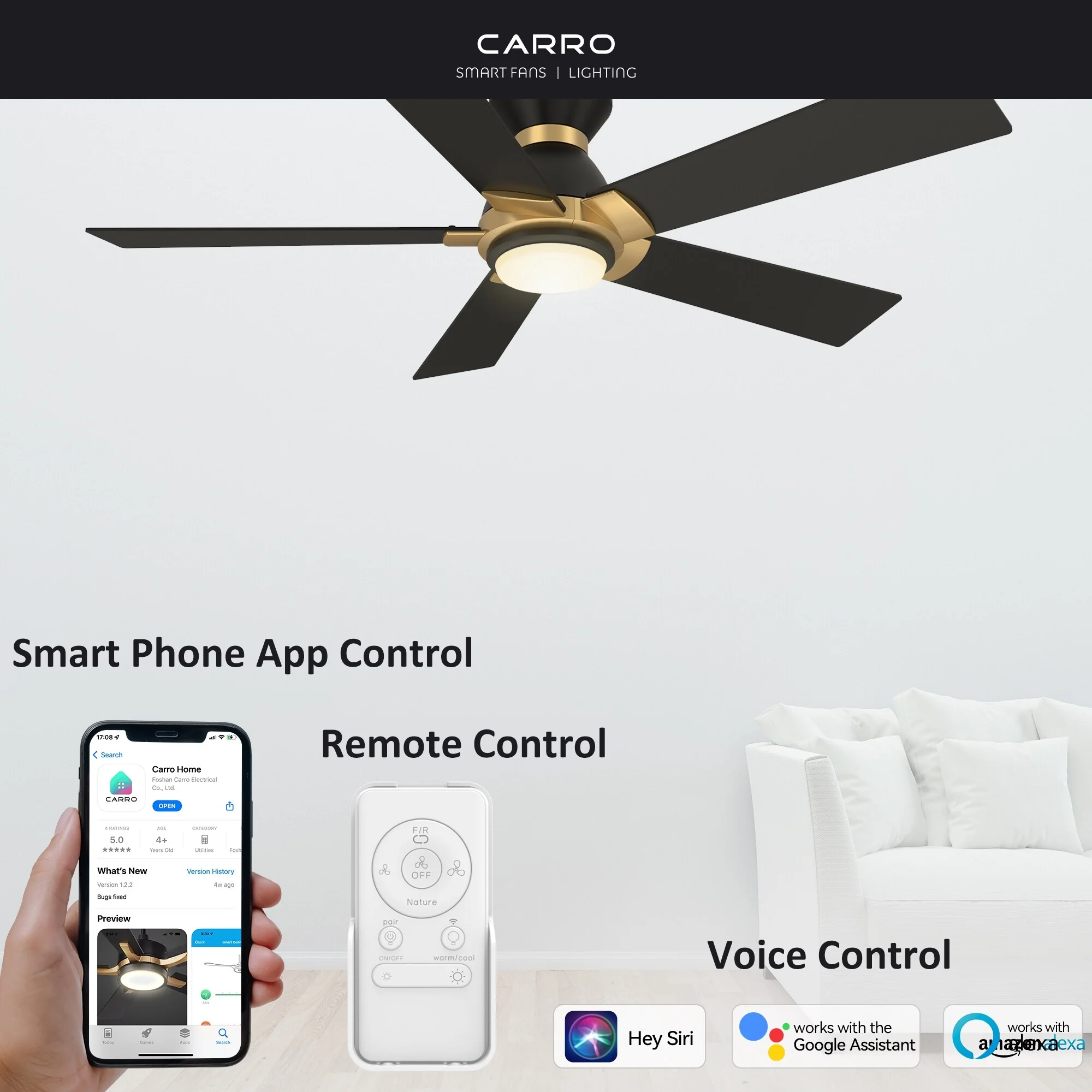CARRO Joule 52" 5-Blade Smart Ceiling Fan with Light and Remote-Flush Mount