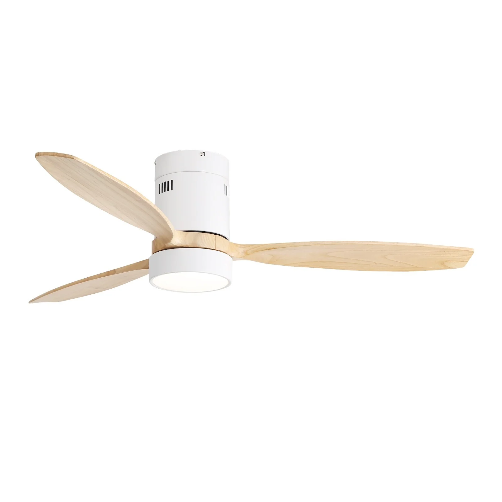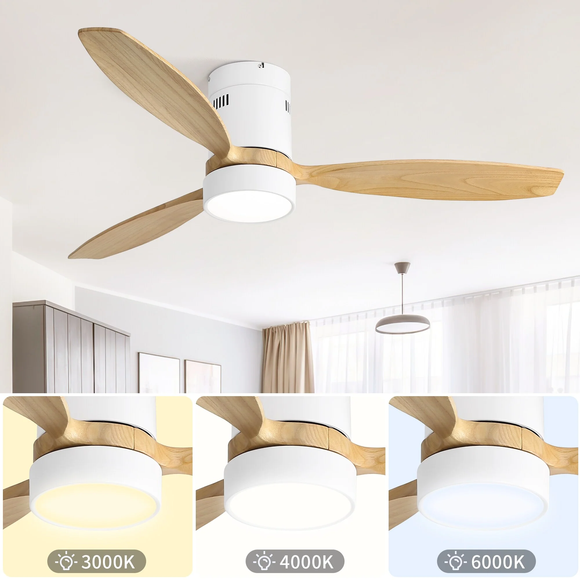 52 Inch Flush Mount Ceiling Fan with Light and Remote, 3 Solid Wood Fan Blades, Noiseless Reversible Motor Ceiling Fan, White