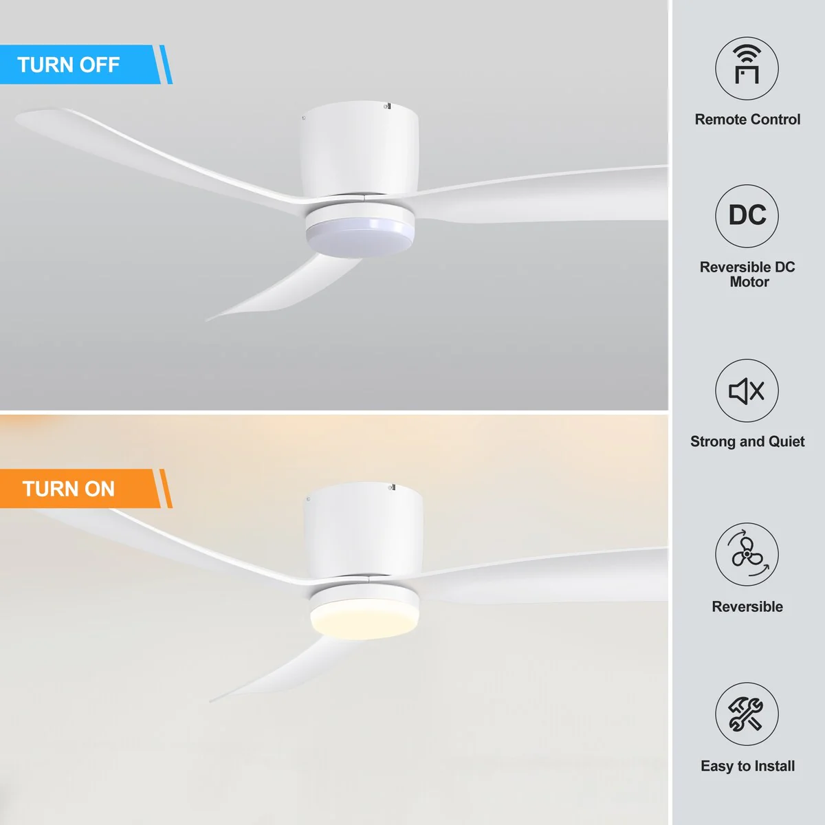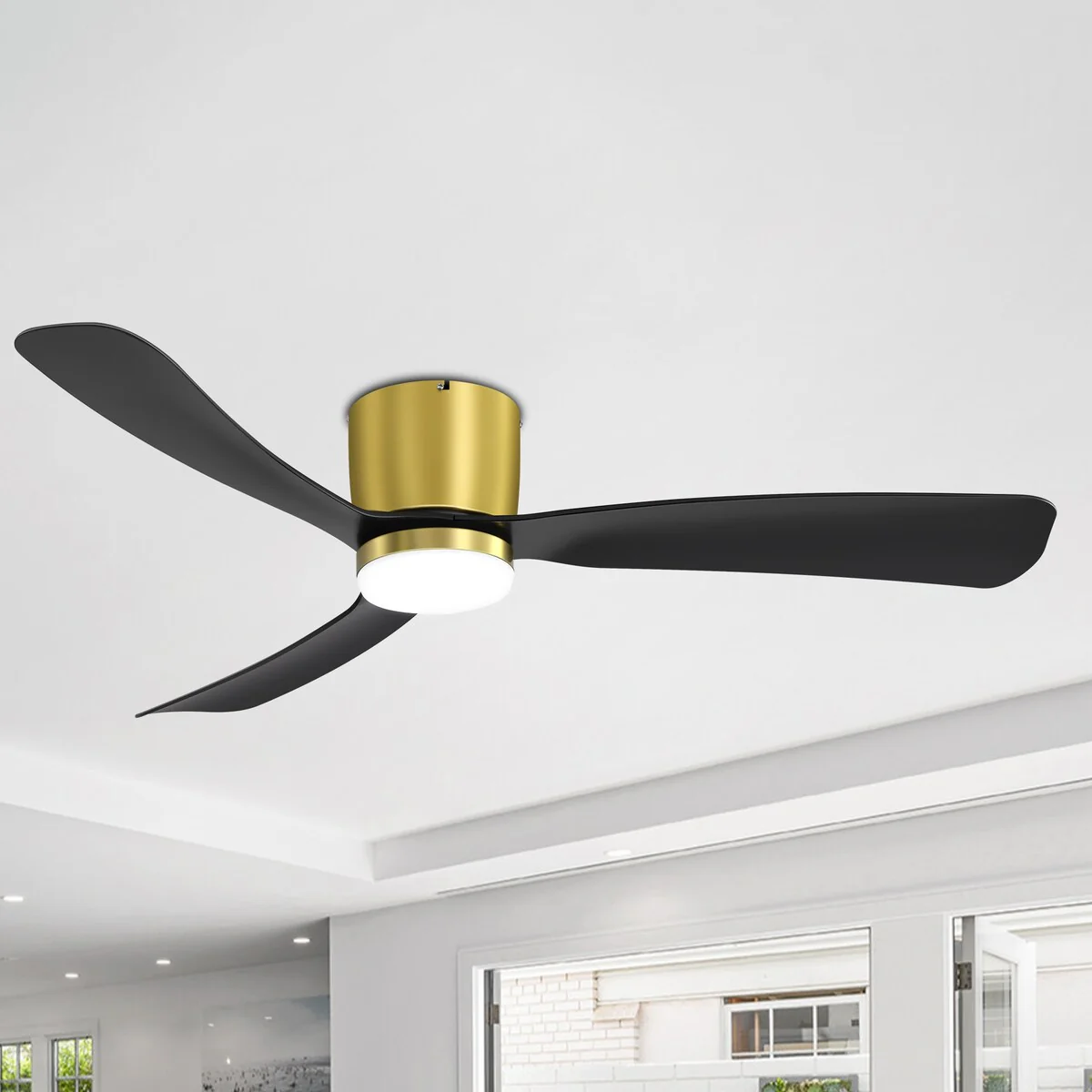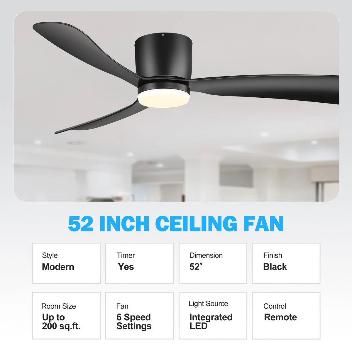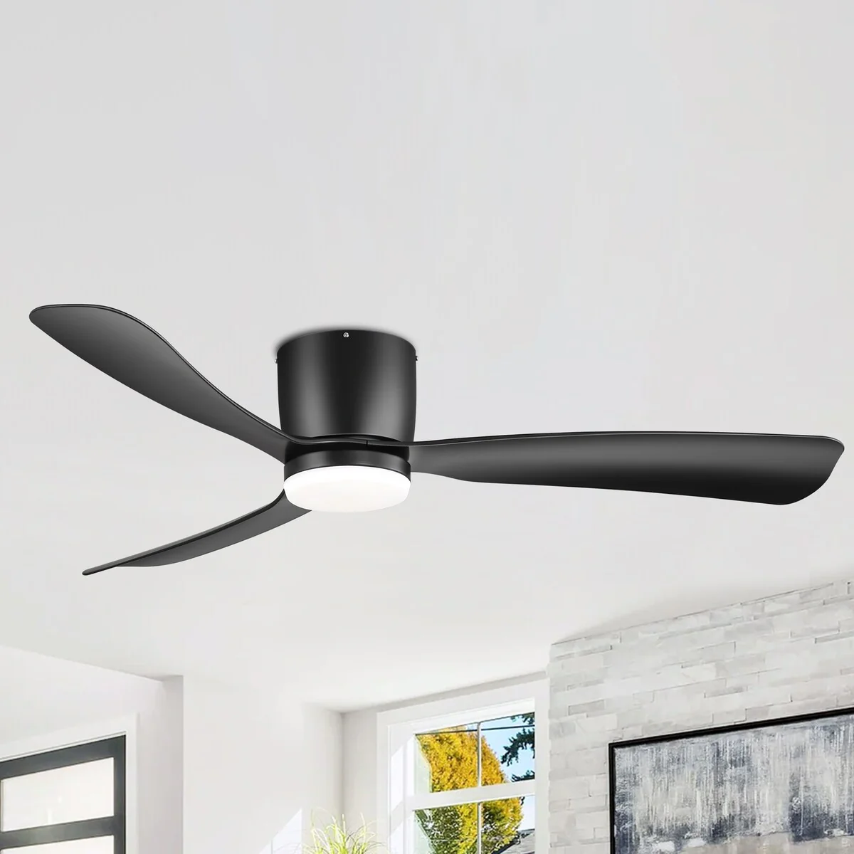 52 Inch Black/White Flush Mount LED Ceiling Fan with Lights Remote(3-Blade)