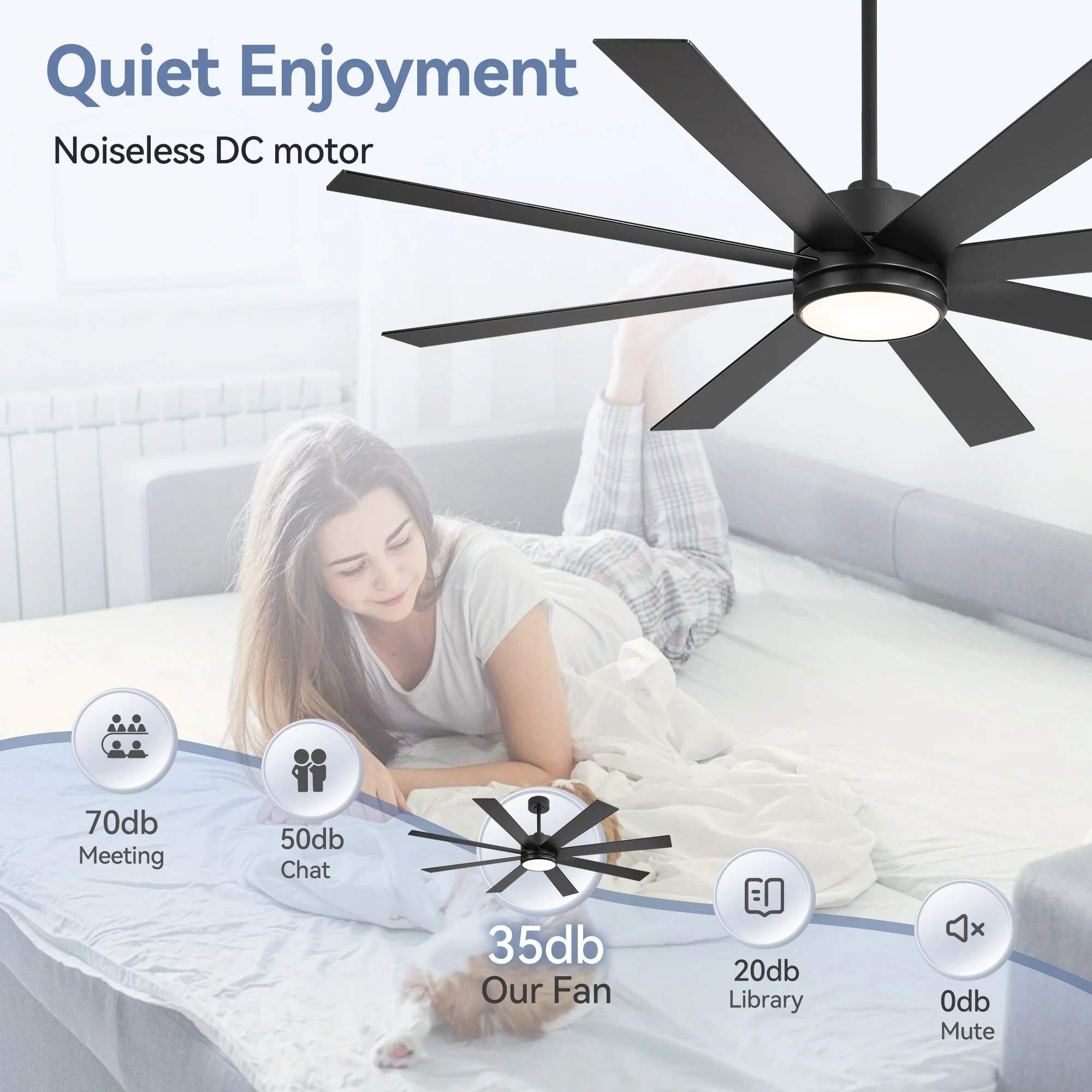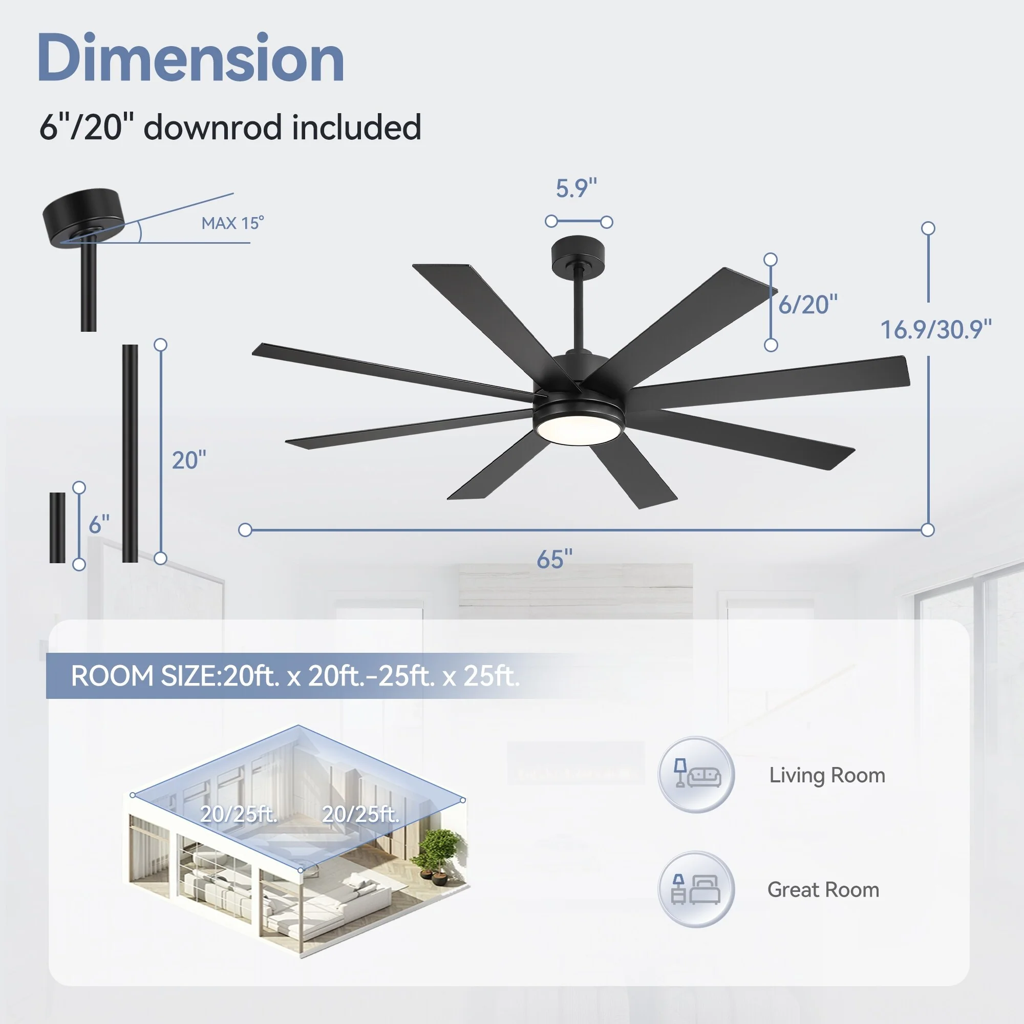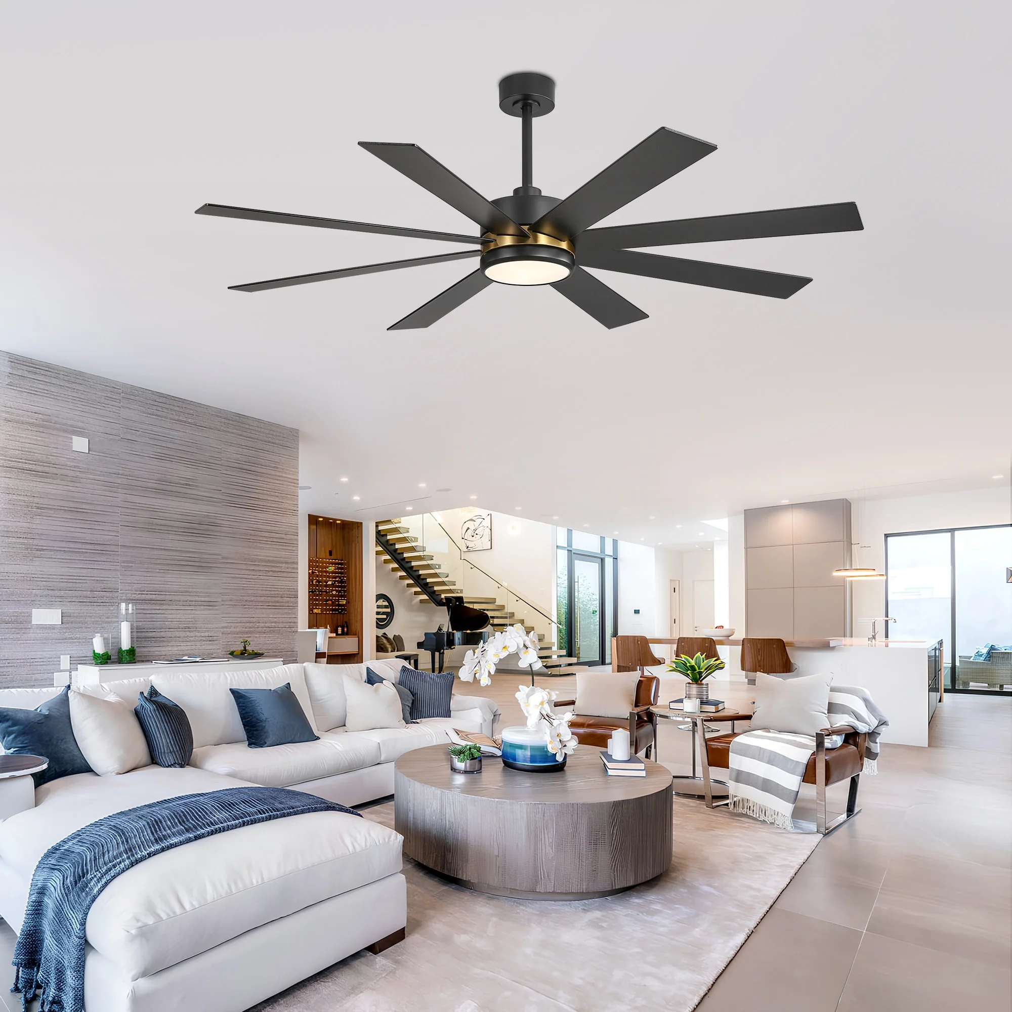 65 Inch 8-Blade Black LED Ceiling Fan with Light and Remote