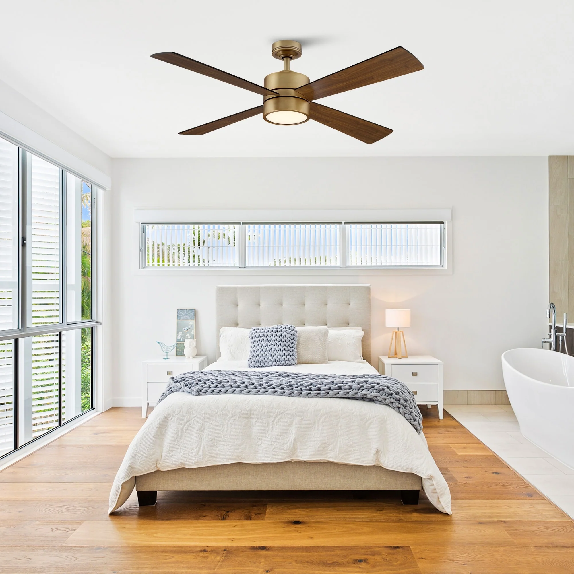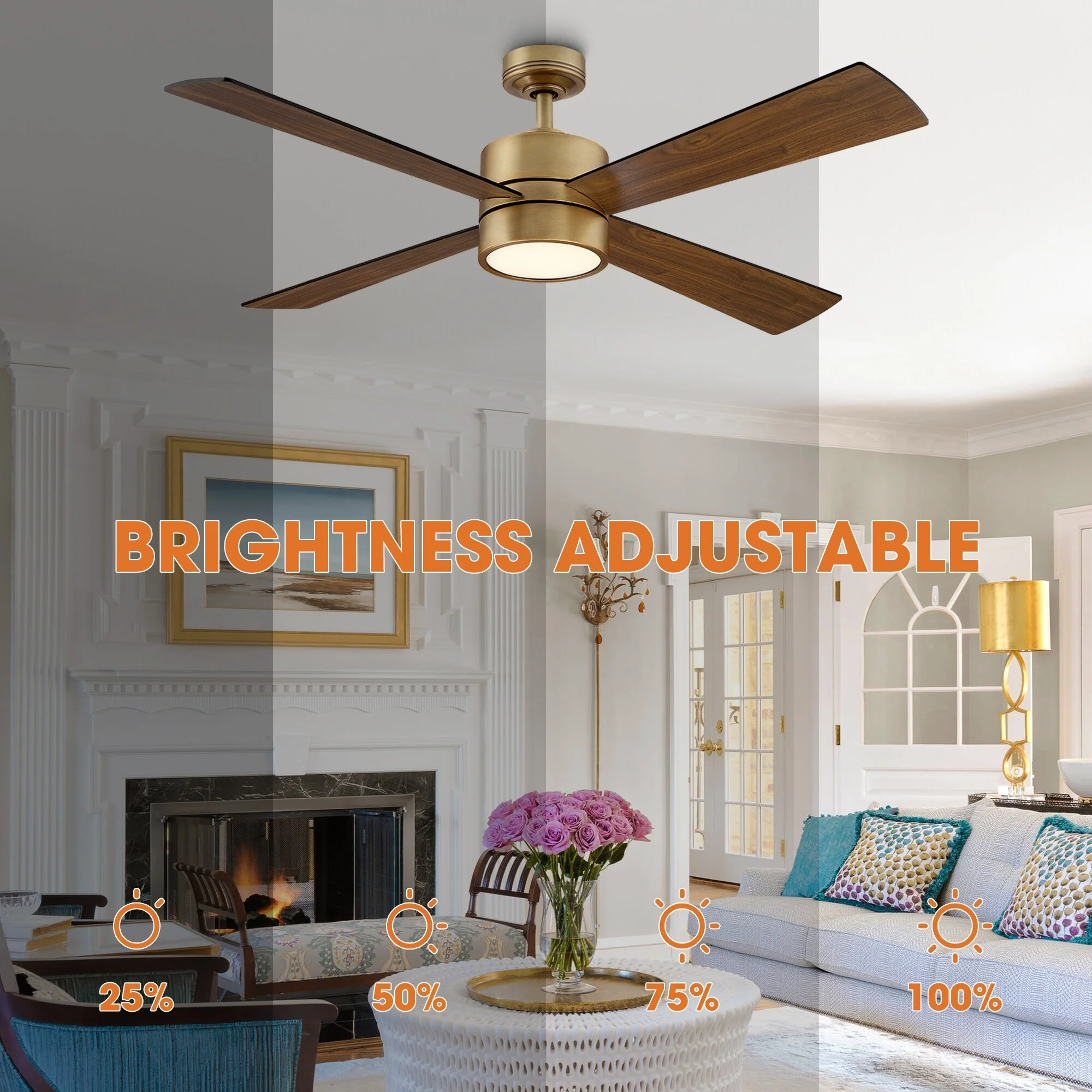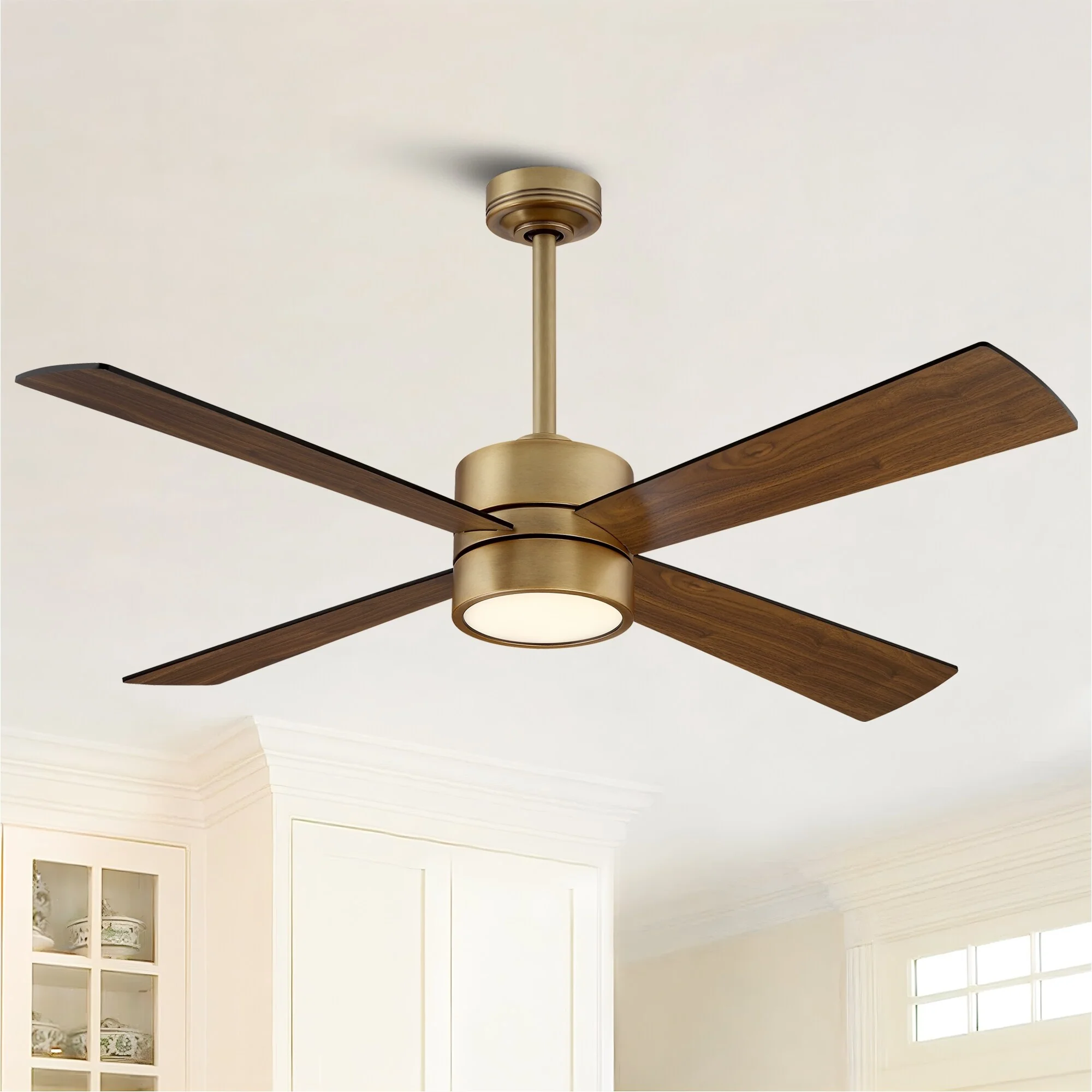 52" Antique Brass Wood 4-Blade Indoor Ceiling Fan with Light and Remote