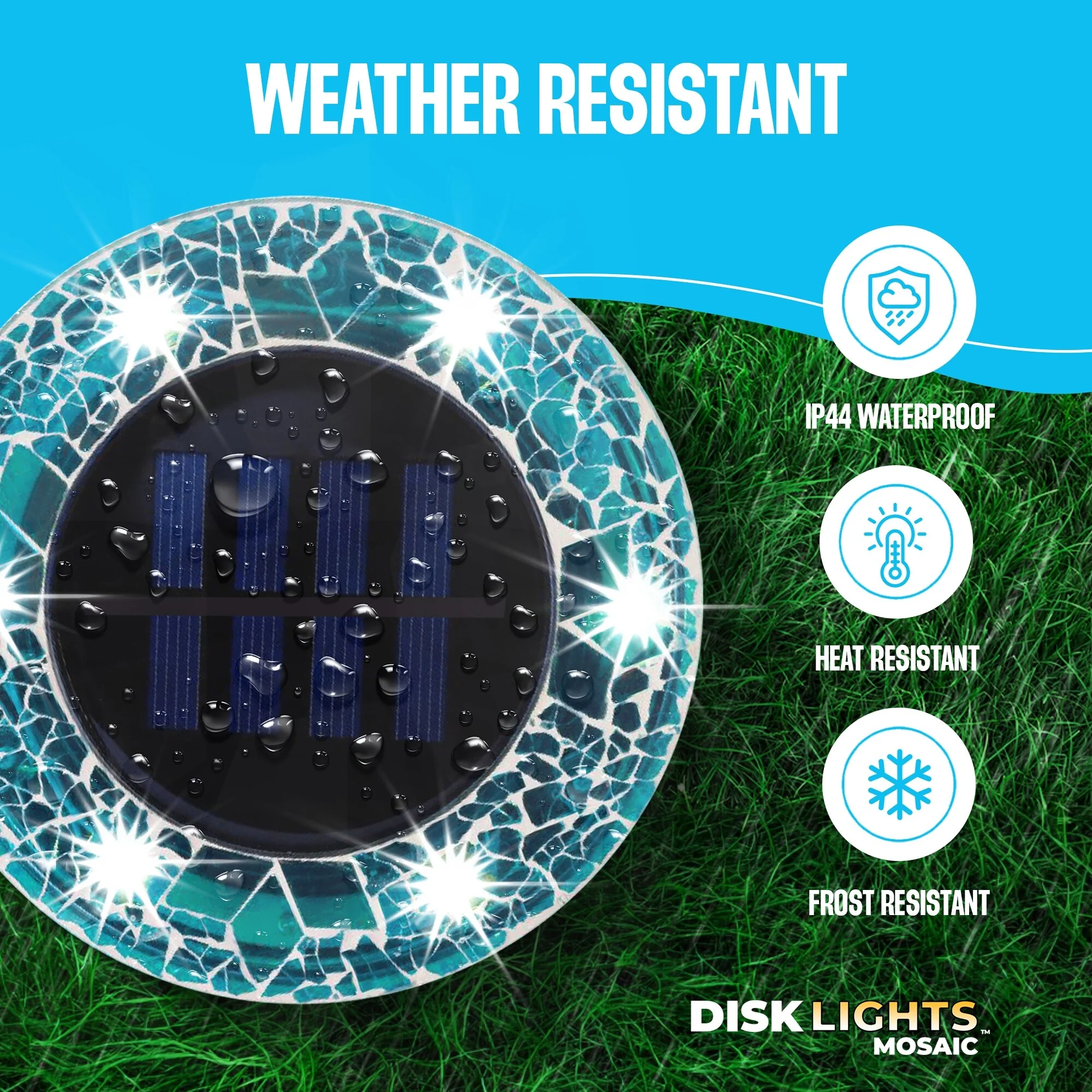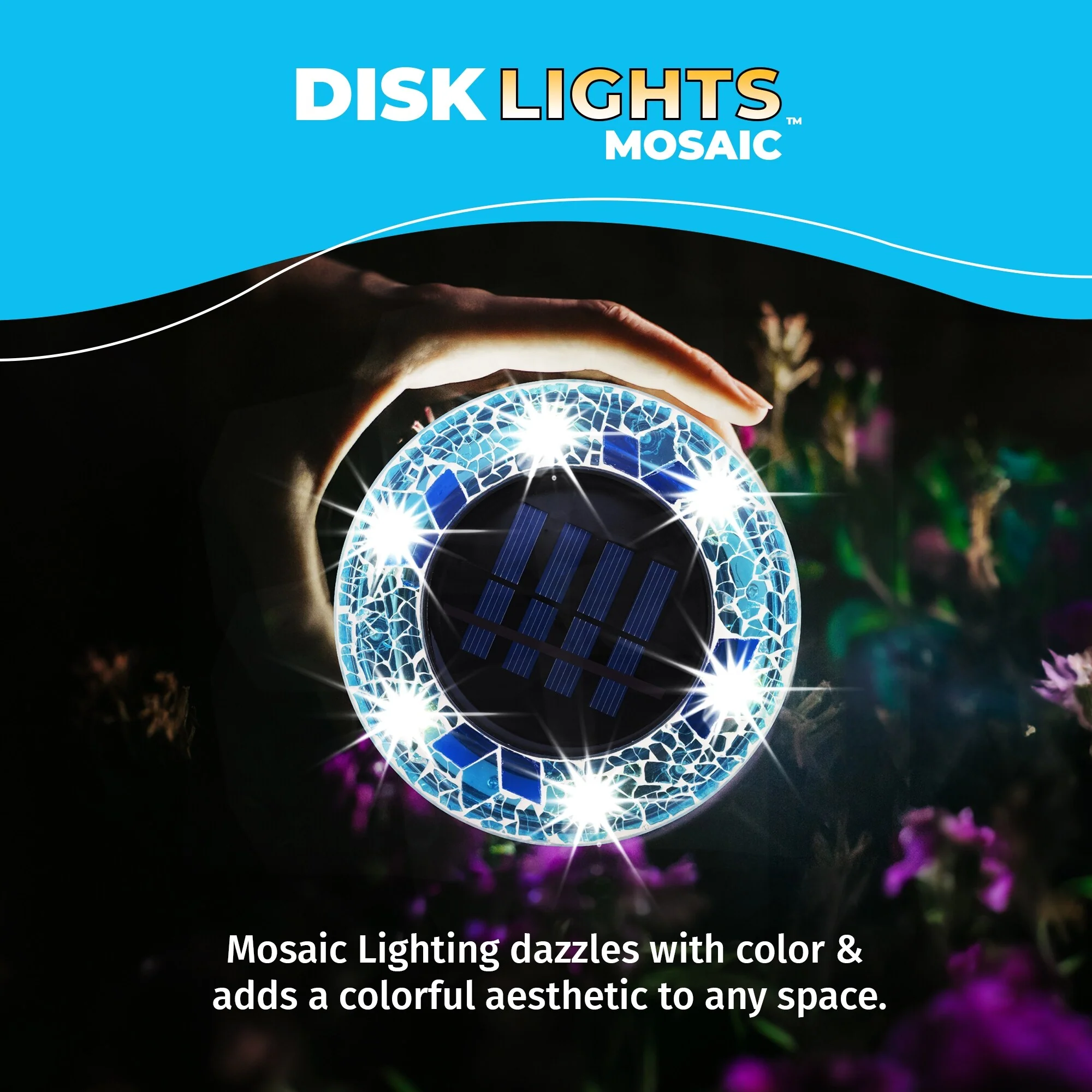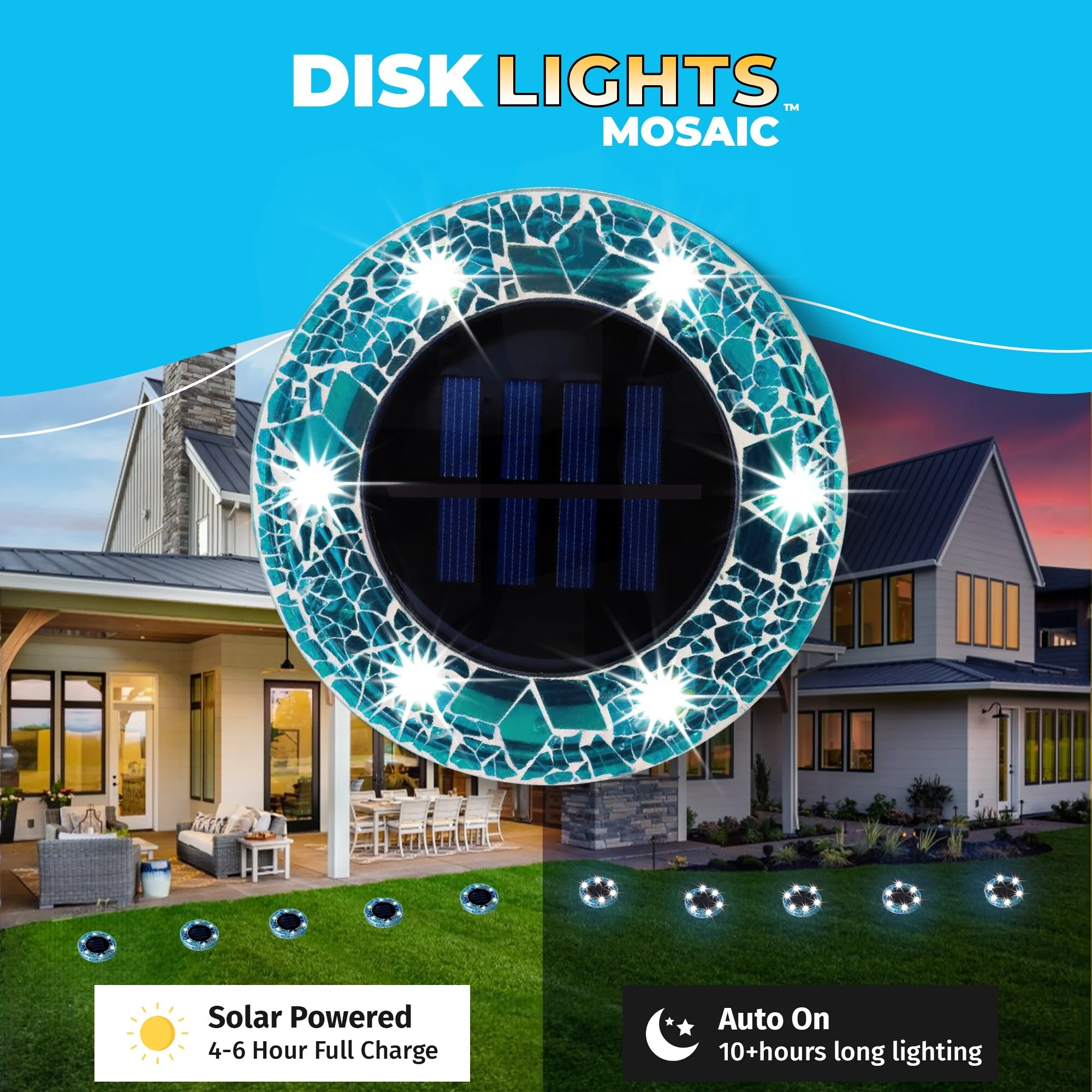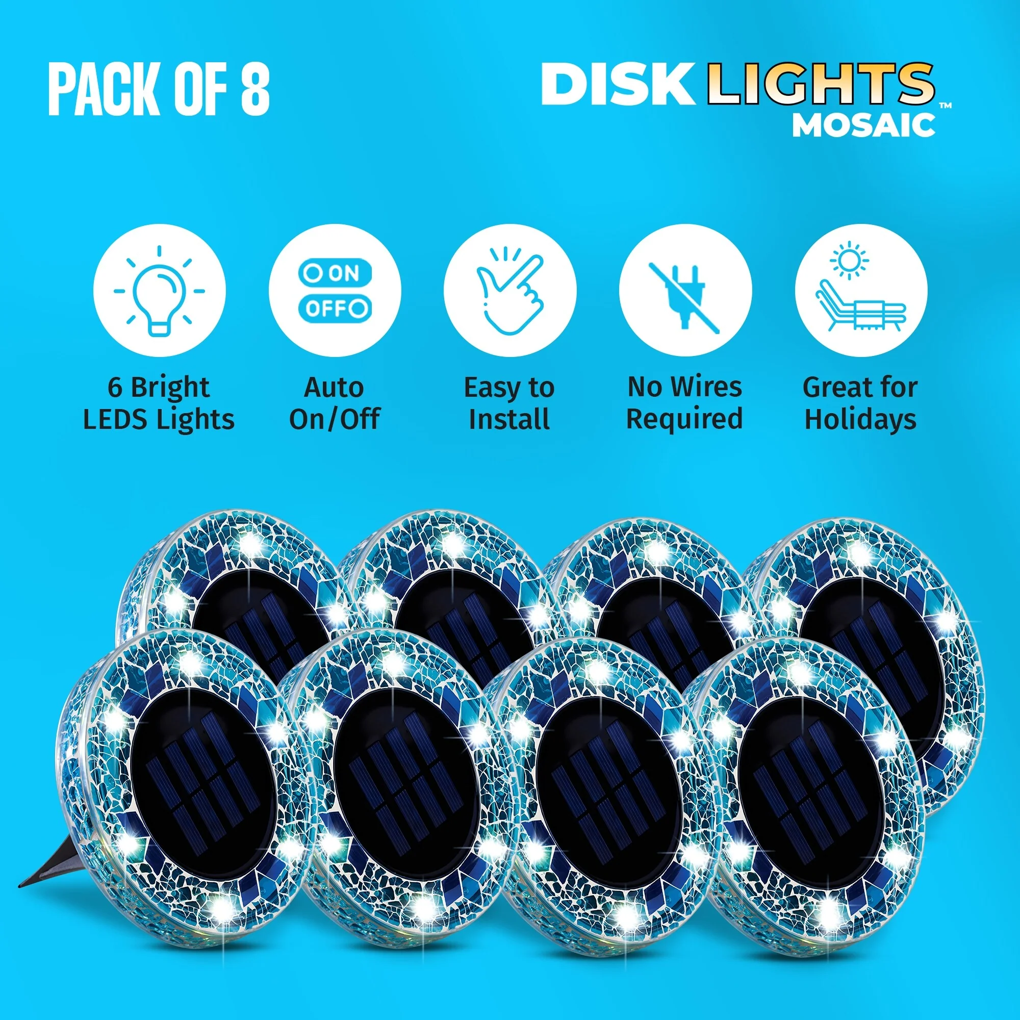 Bell + Howell 6 LED Round Blue Mosaic Solar Powered Disk Lights - 8 Pack with Auto On/Off for Garden and Lawn