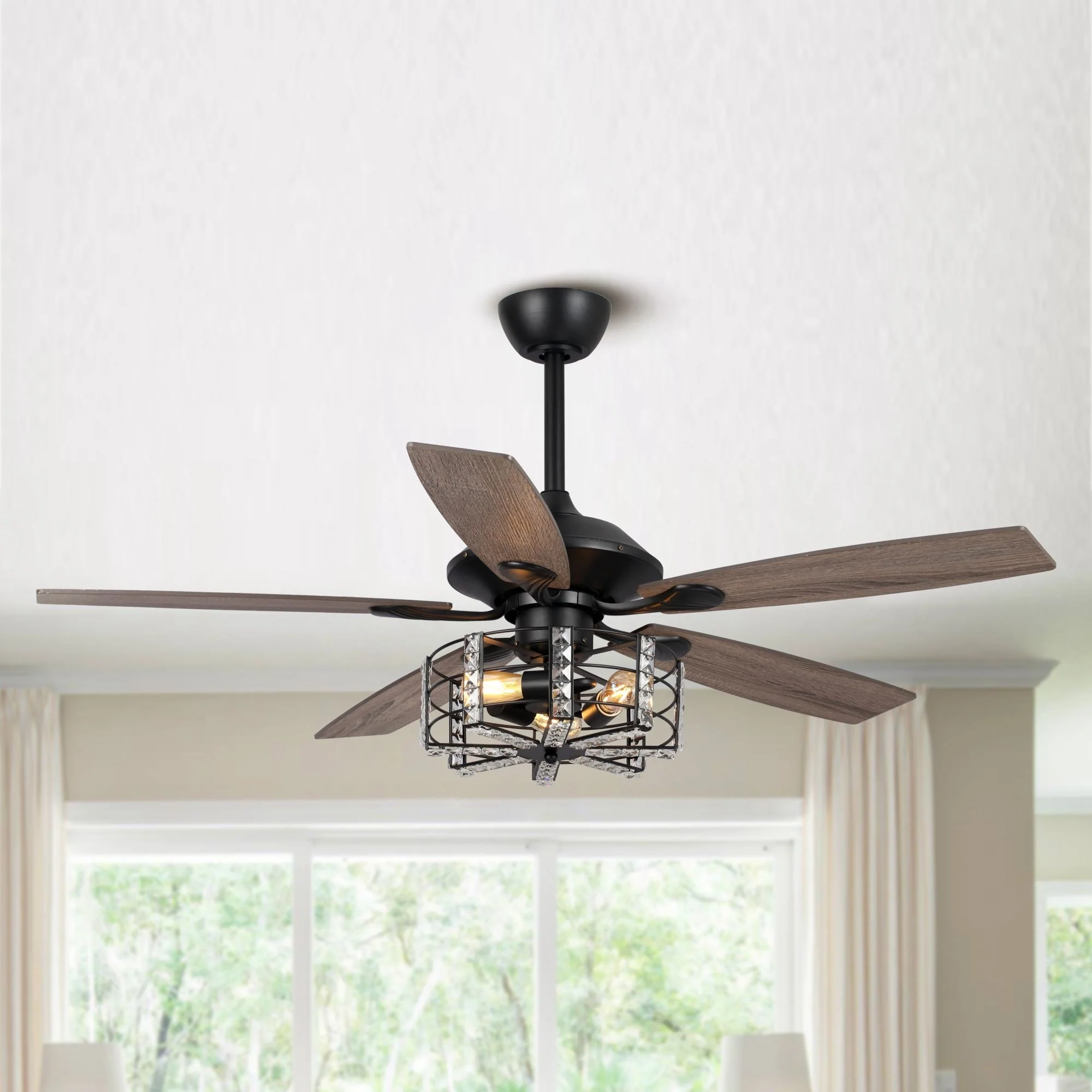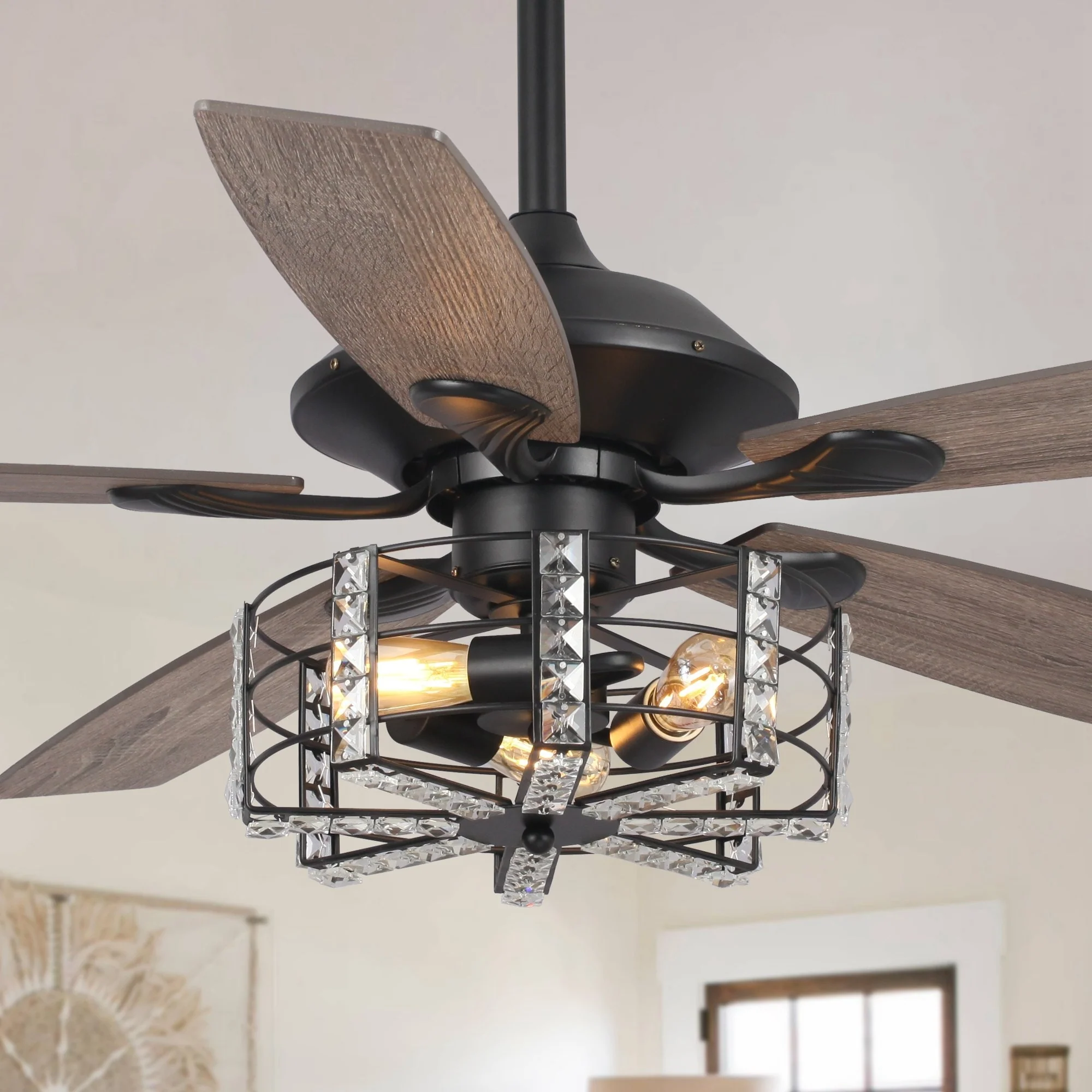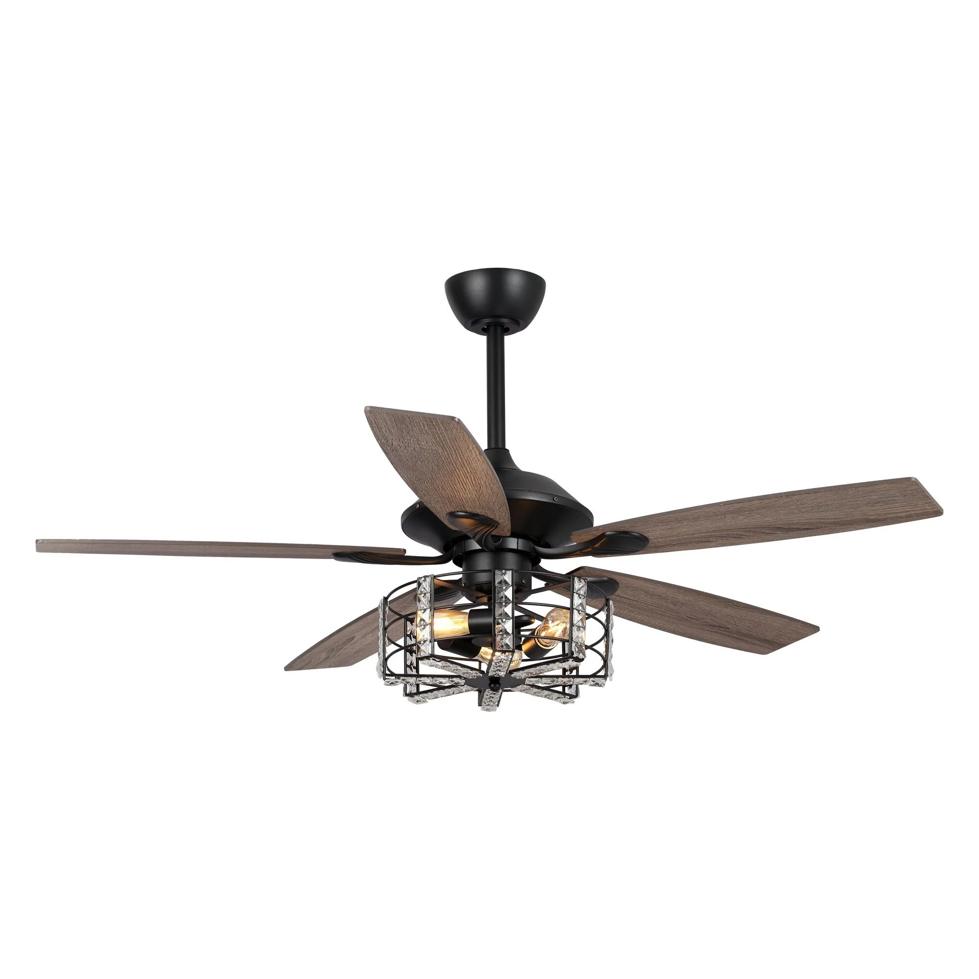 52" Industrial Black Wood 5-blade Crystal Ceiling Fan with Remote