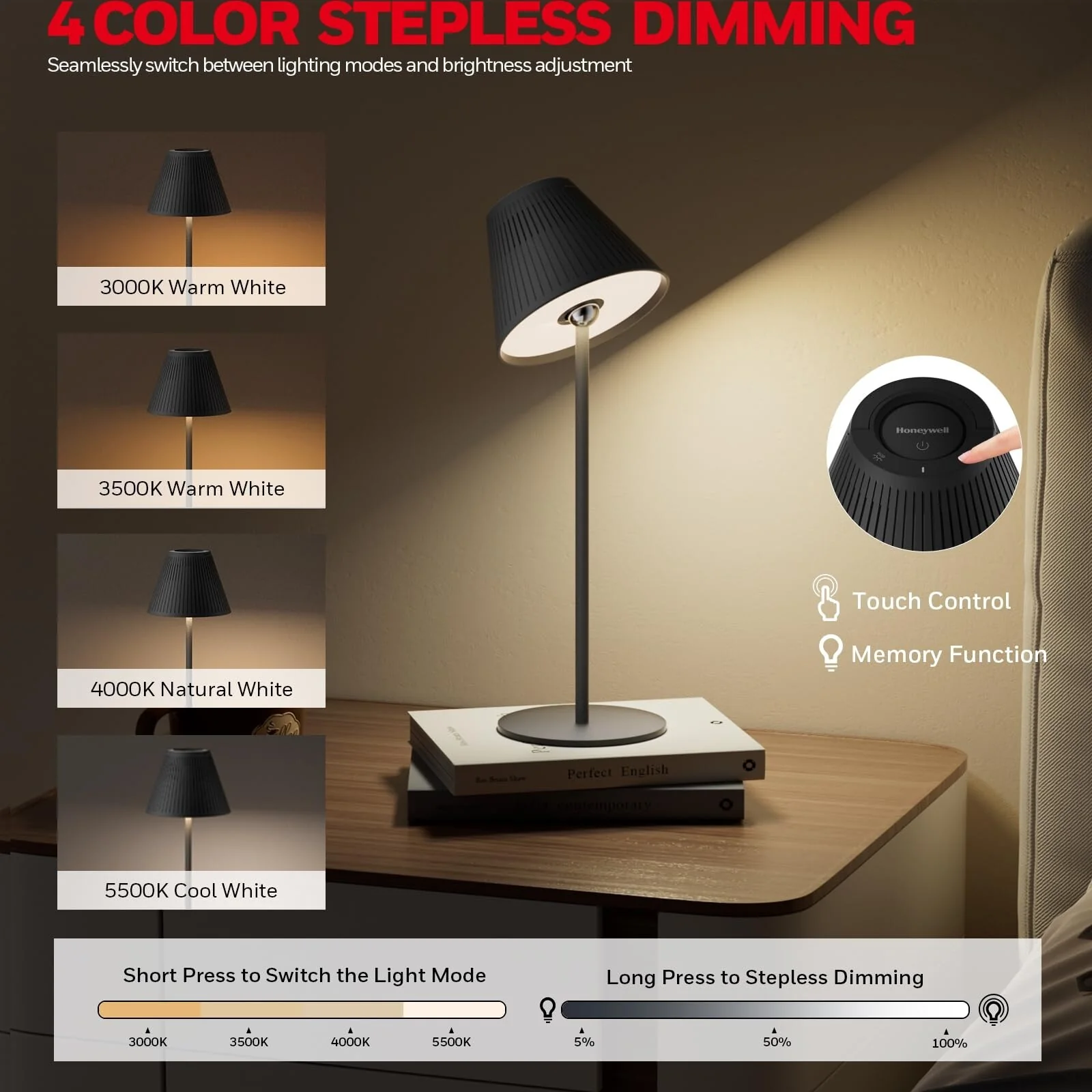Honeywell Rechargeable LED Desk Lamp 4 Colors 9 RGB Touch Dim